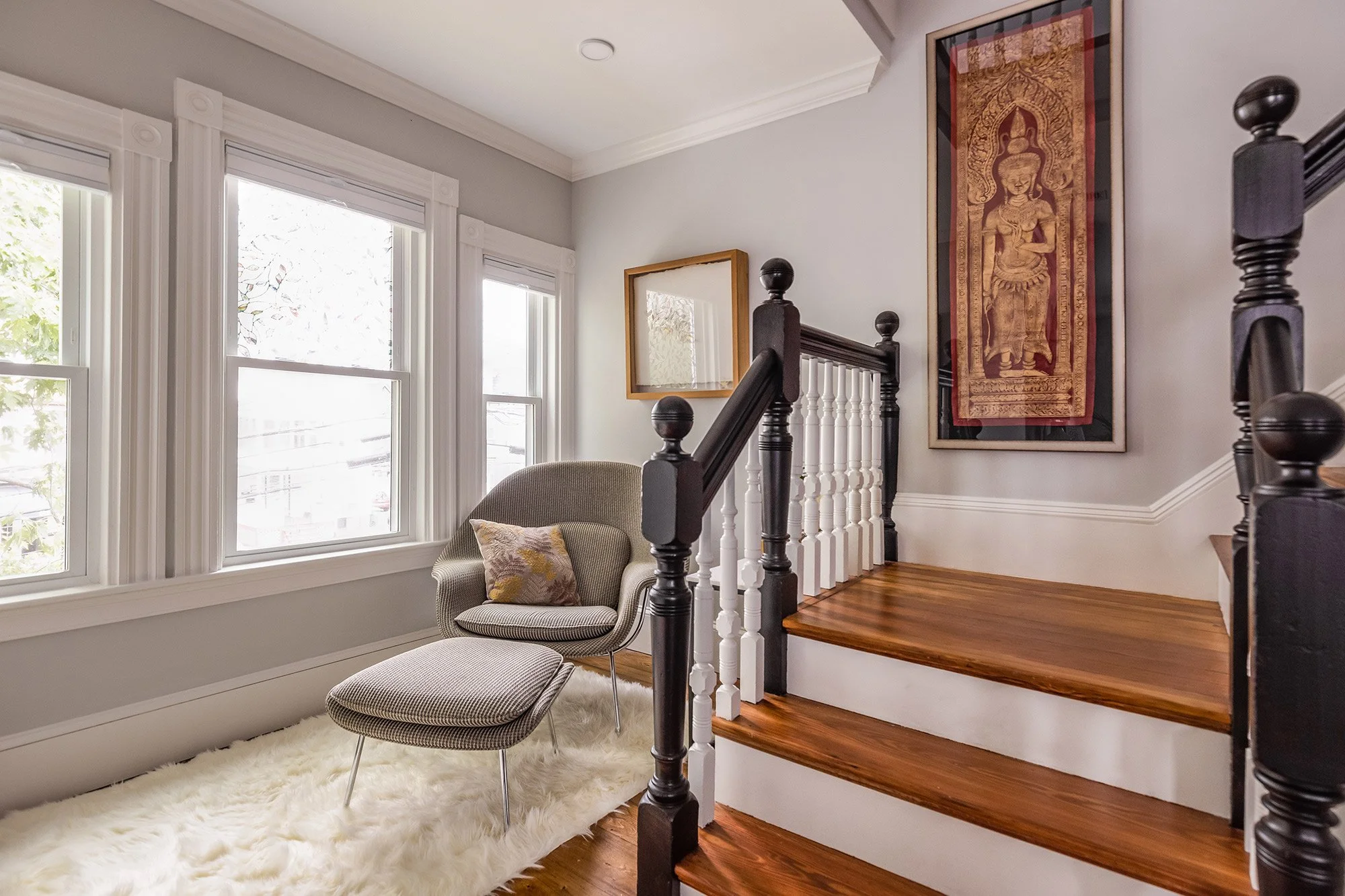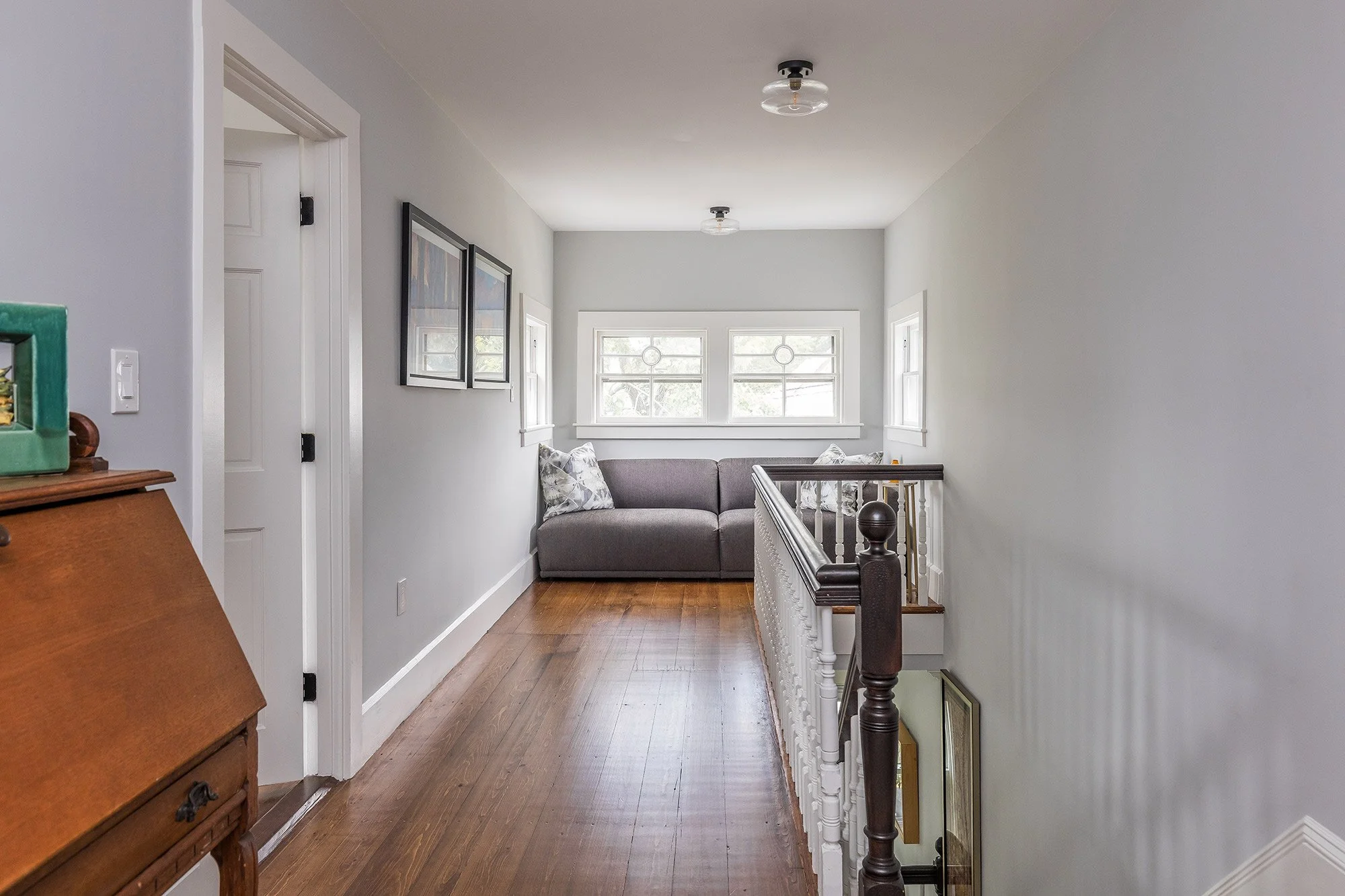 The top floor has a wide hallway with space for office and reading areas, and a row of windows with original period detailing.