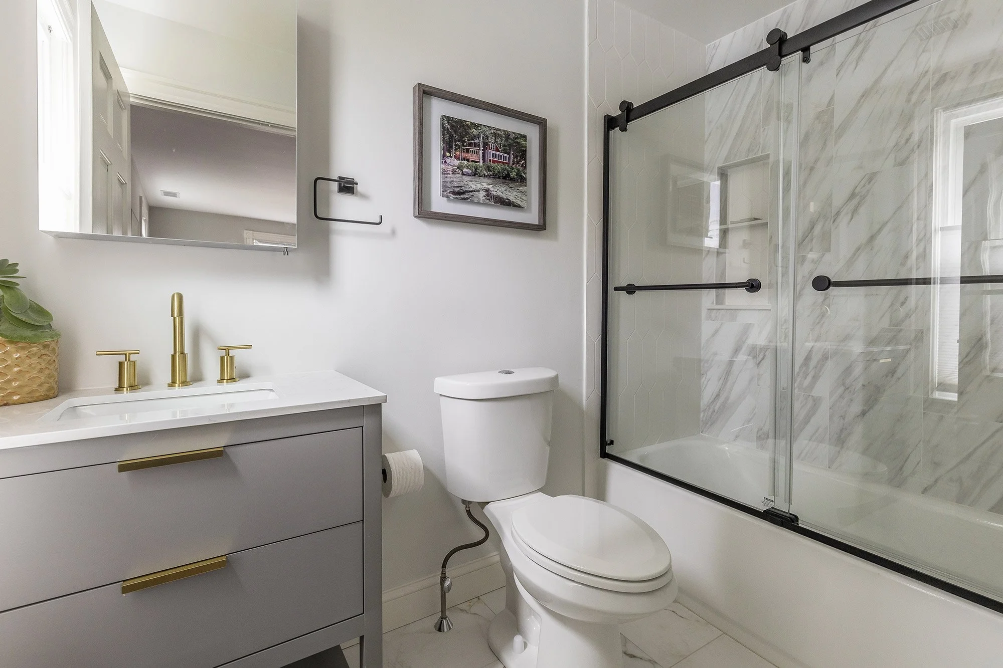 The primary bathroom is outfitted with marble look ceramic floor tiles and shower wall; a dual flush toilet; and a combination tub and shower with black-framed sliding glass doors, brass shower fittings, inset toiletry niche, and white accent tiles. The gray floating vanity has a white quartz top, brass hardware and faucet, a mirrored medicine cabinet and a brass vanity light above.