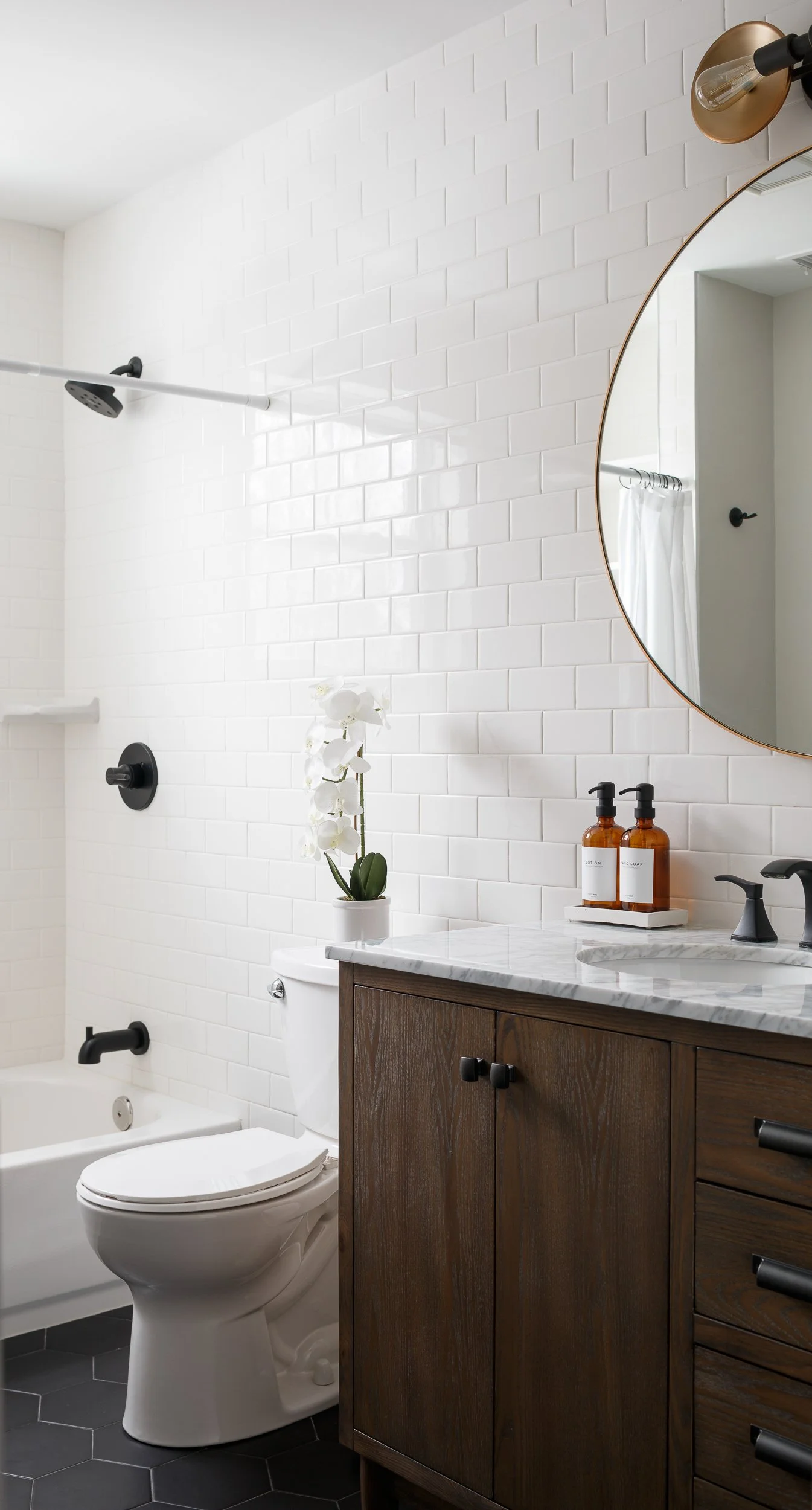 The shared bathroom has a stylish wood vanity with a marble countertop, subway-tile walls, black hexagon tile floors and a shower/tub.