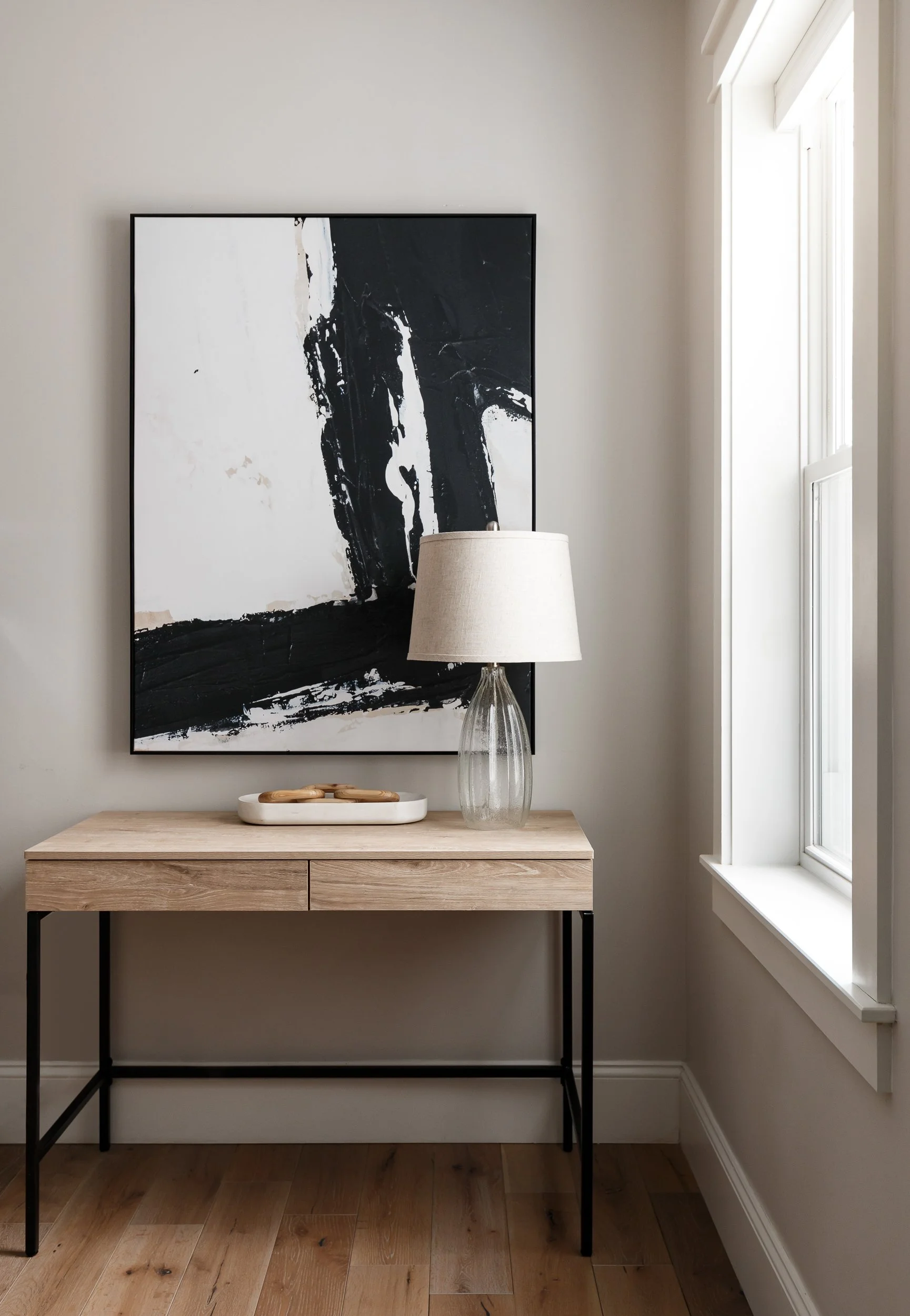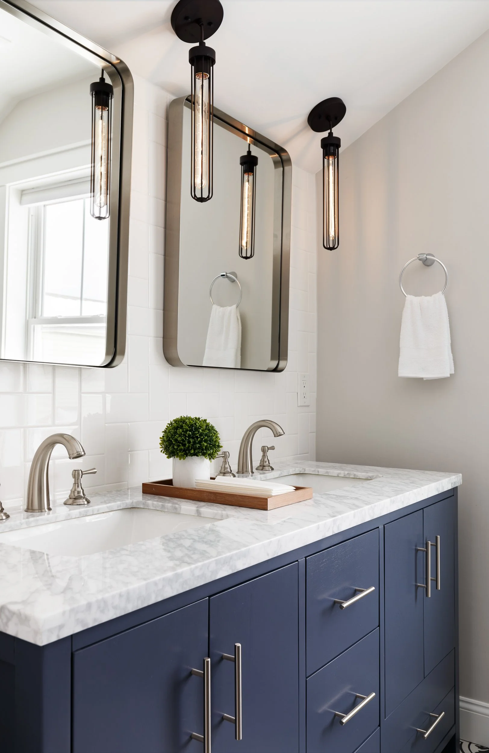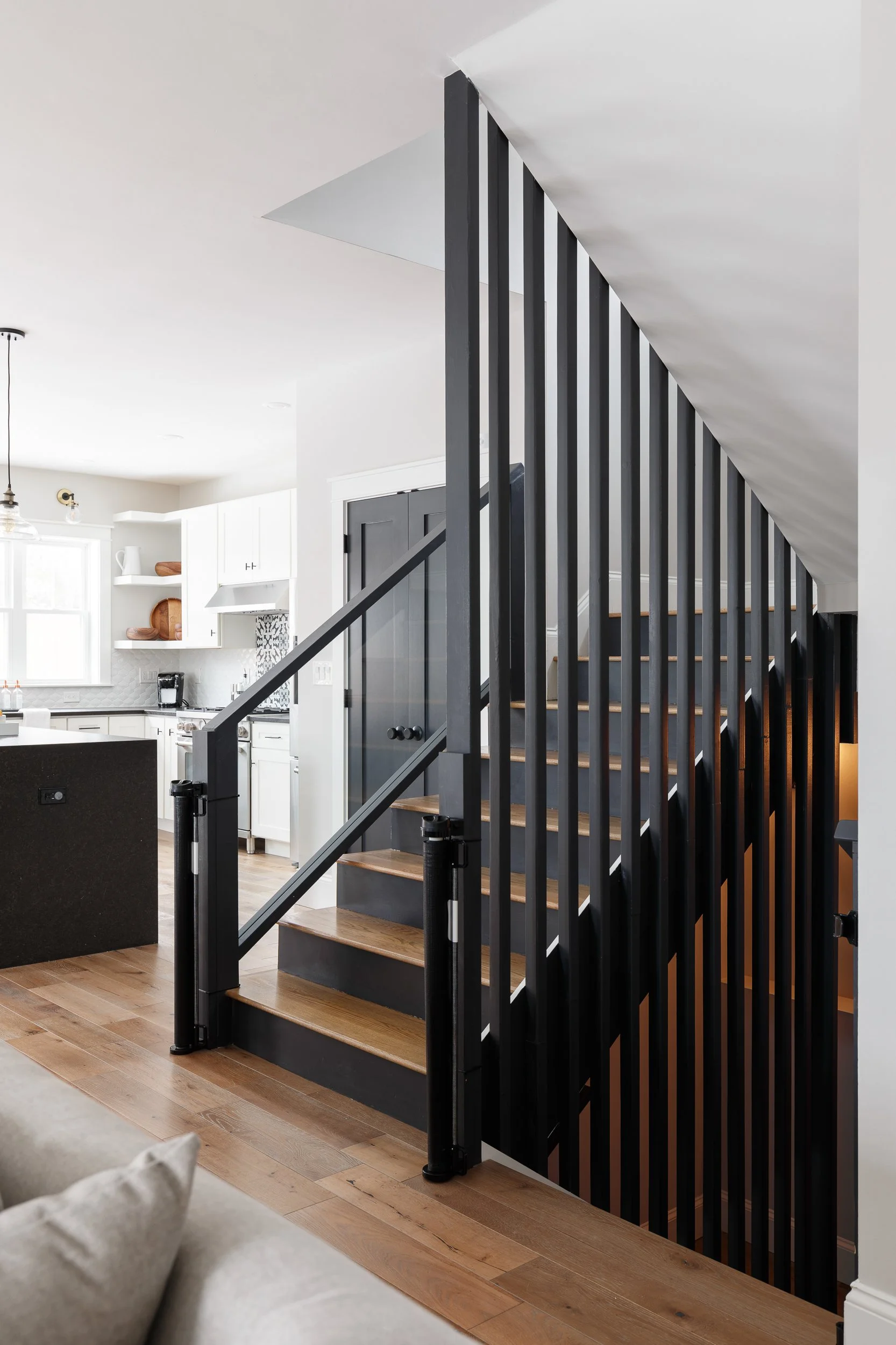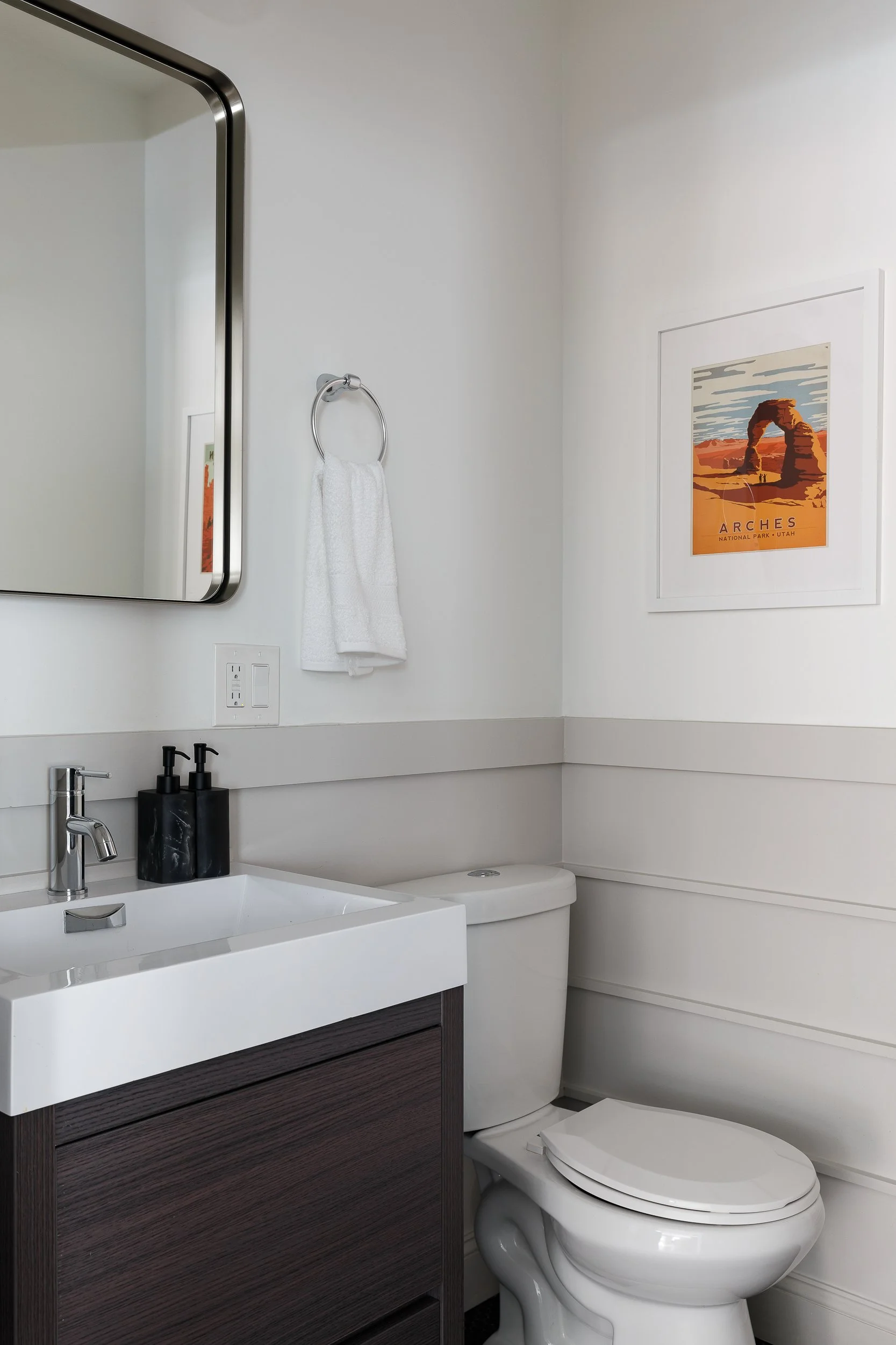 The half bathroom features a contemporary vanity, stylish board and batten, black penny tile and dual-flush toilet.