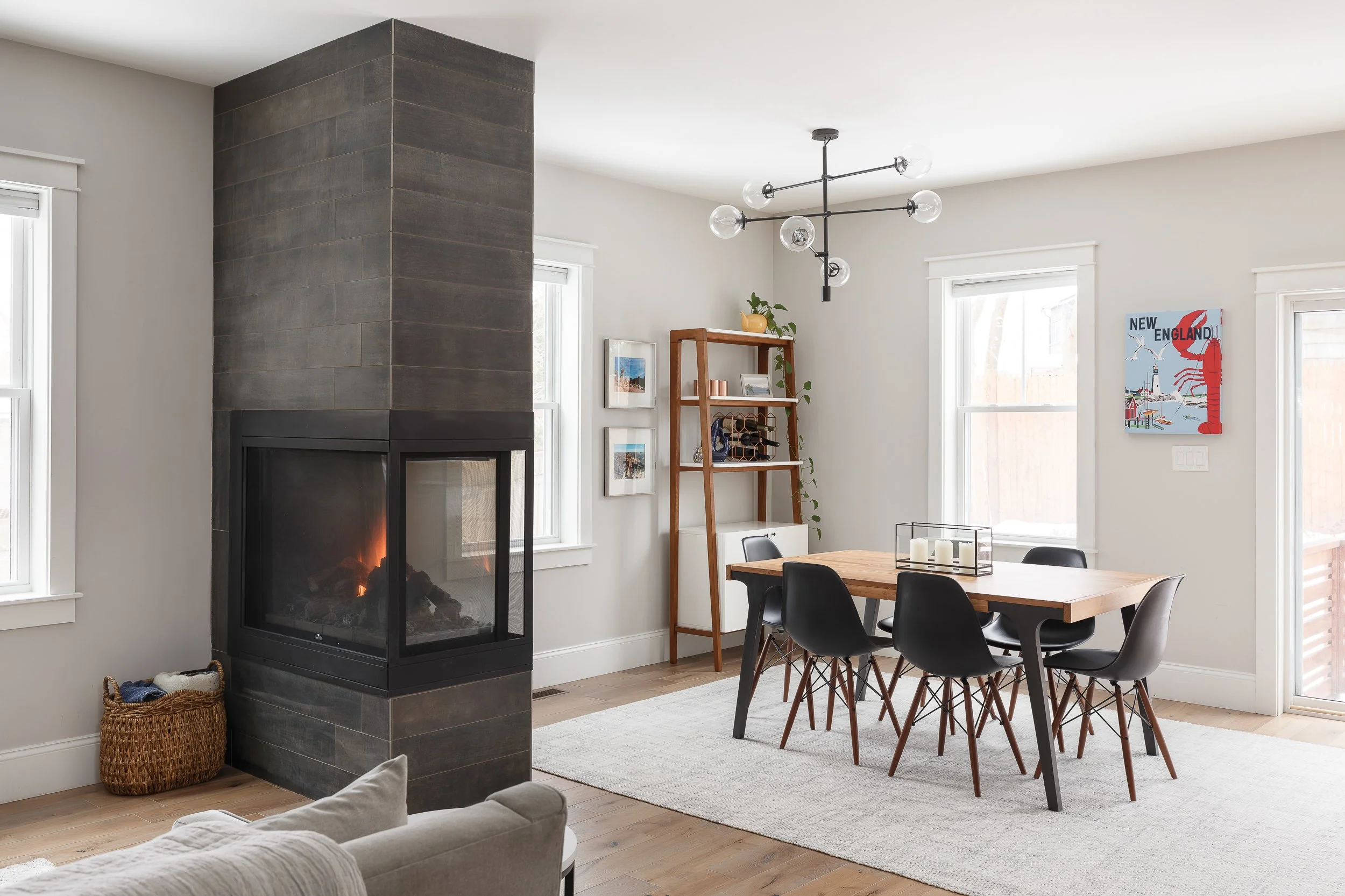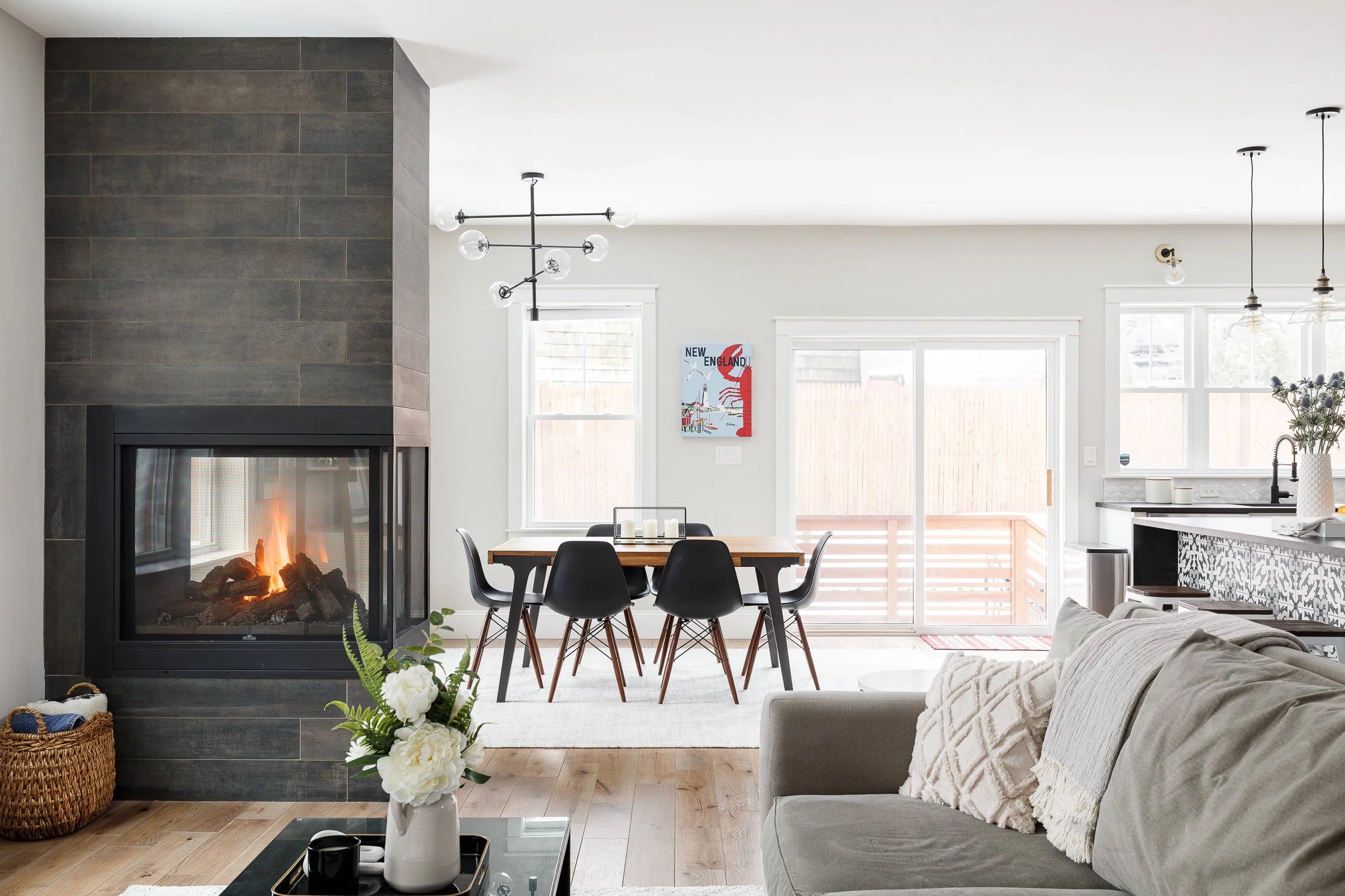 The front door opens into an open-concept living/dining/kitchen space which features engineered hardwood floors, 9' ceilings, tile-surround Napoleon 3-sided gas fireplace, recessed lighting, contemporary light fixtures and woodwork and plenty of windows.