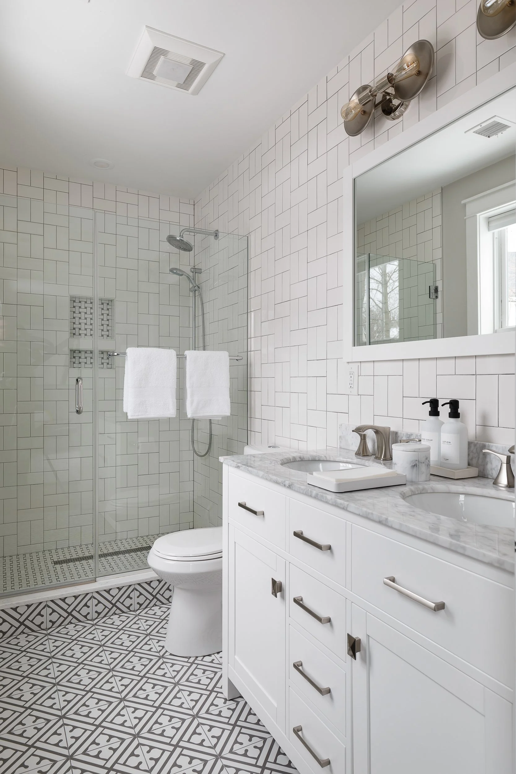 The third floor bathroom has a contemporary double vanity with marble counters, subway-tile walls, tile floors and dual-flush toilet. The glass-enclosed shower boasts dual showerheads, a tile niche and basketweave floor tiles.