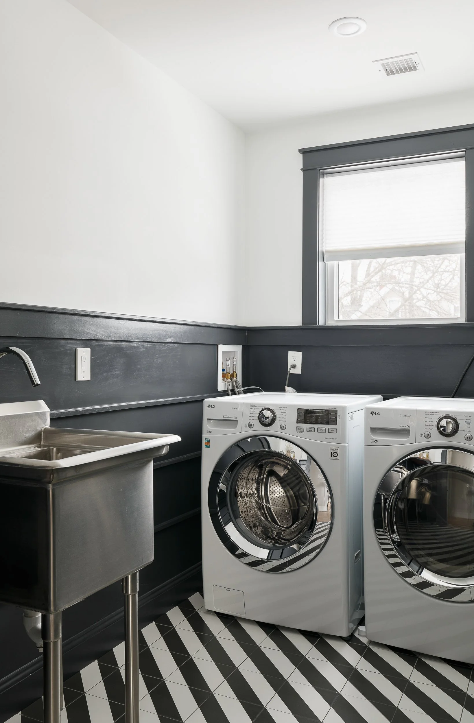 The chic laundry room has board and batten wainscoting, a stainless steel Trinity utility sink, LG washer/dryer and black-and-white striped tile flooring.