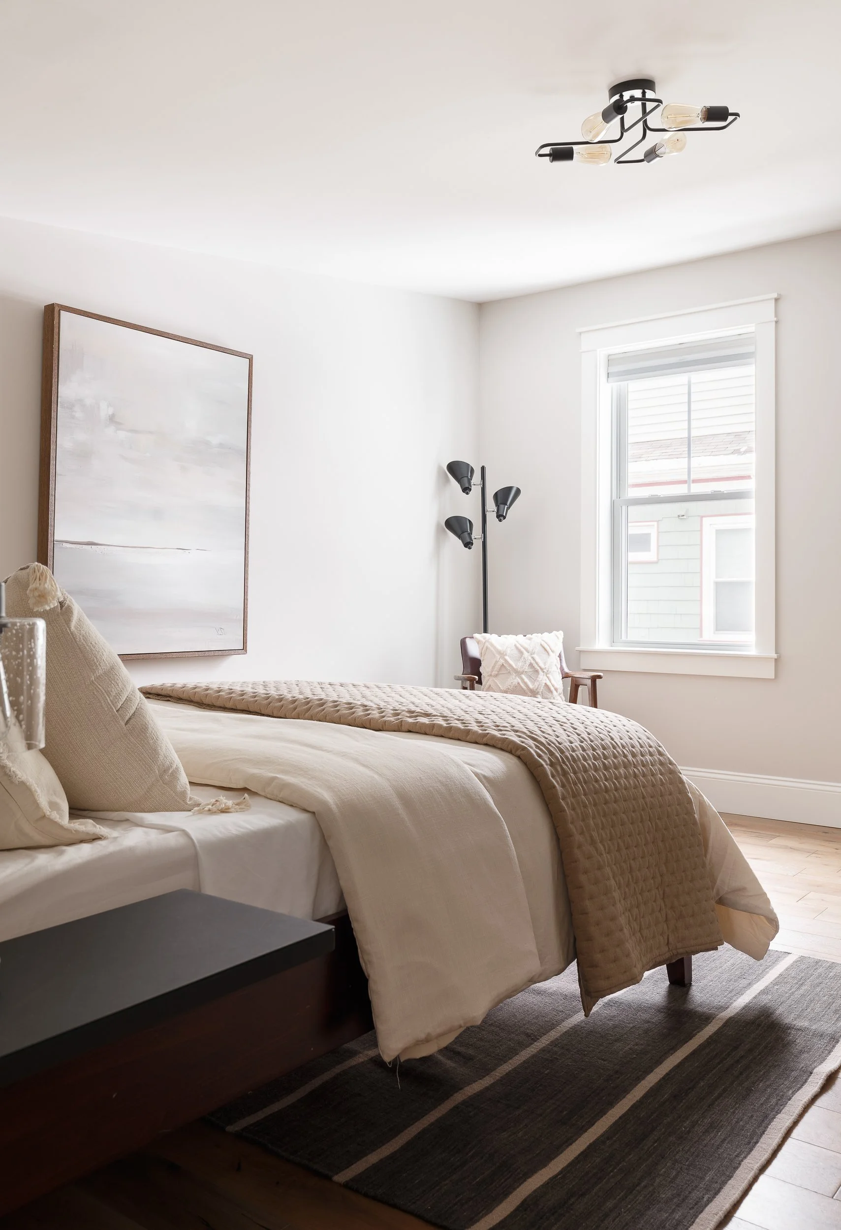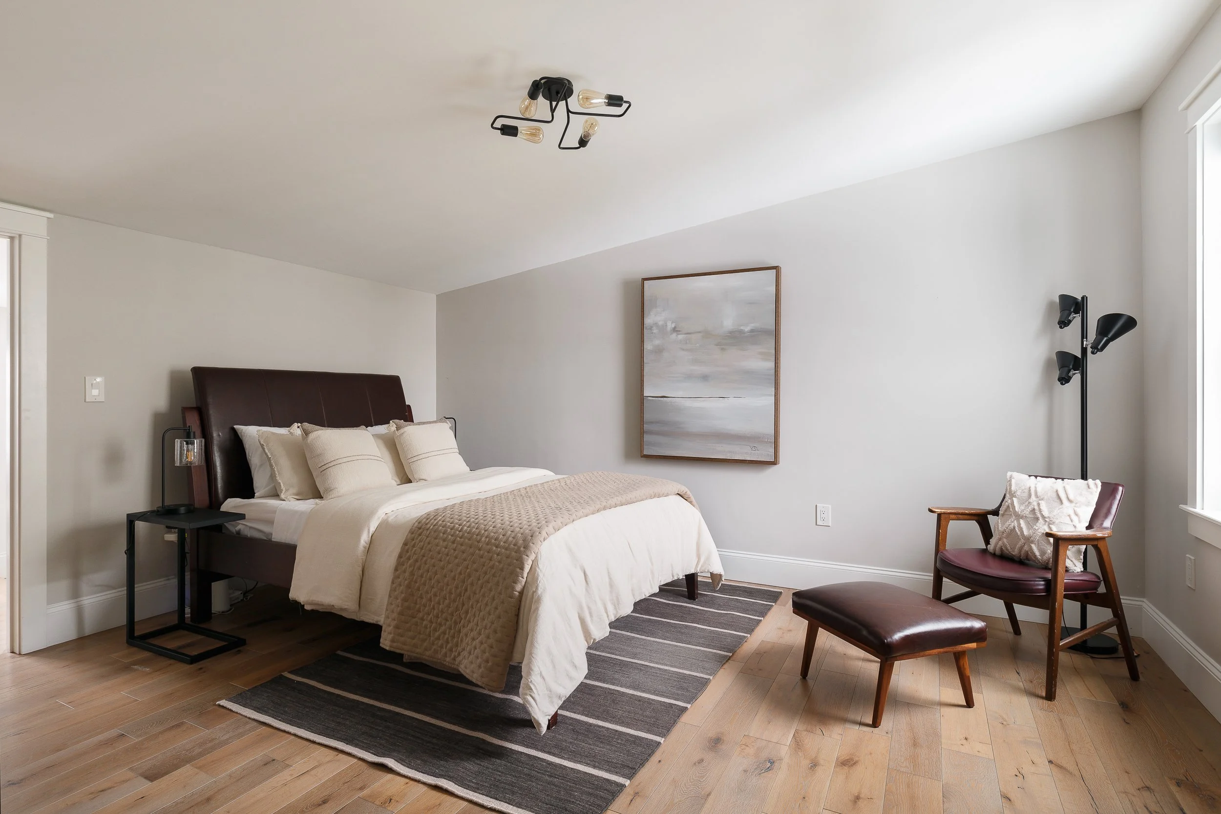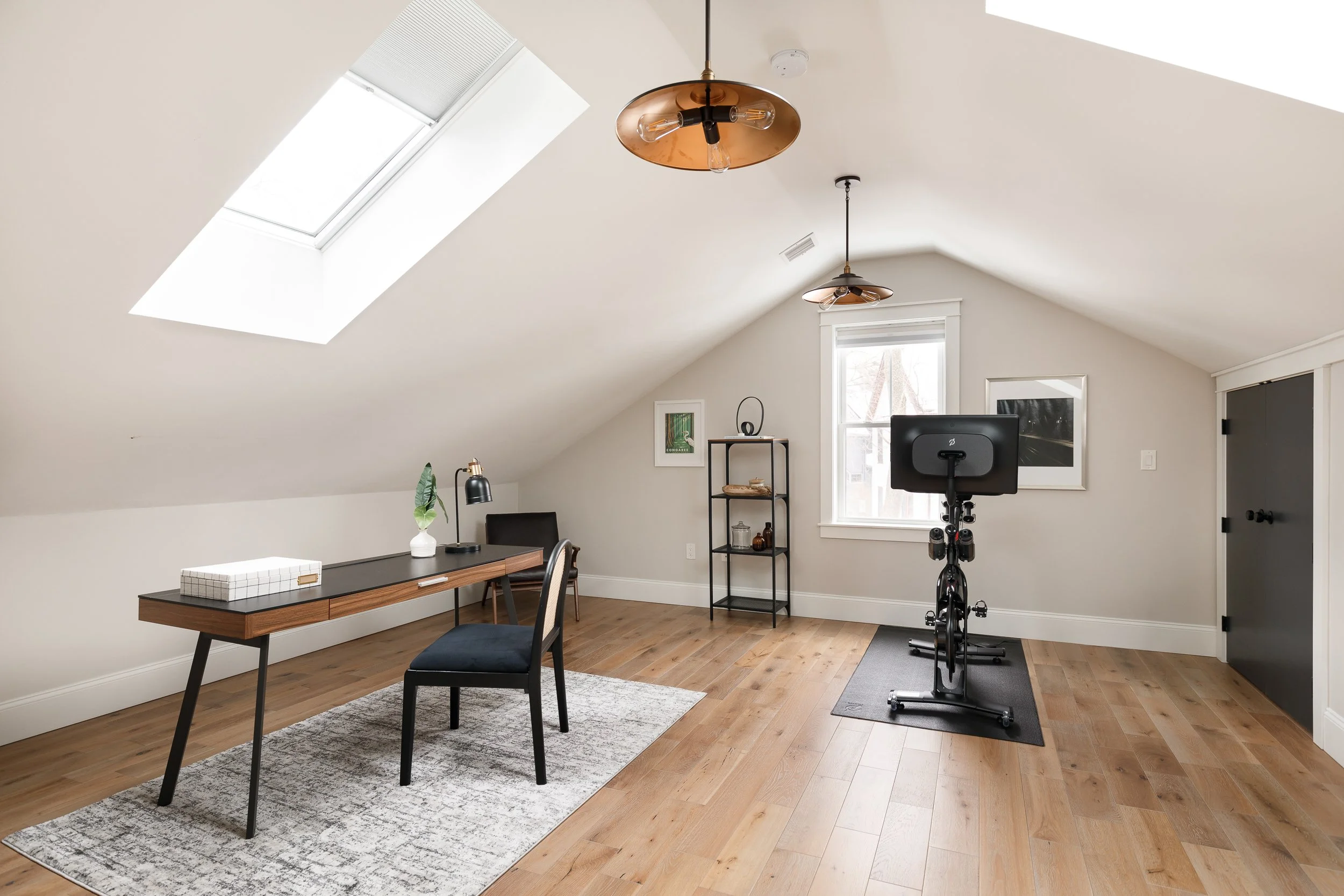 The sun-filled bedroom boasts vaulted ceilings, 2 skylights and plenty of closet and storage space.