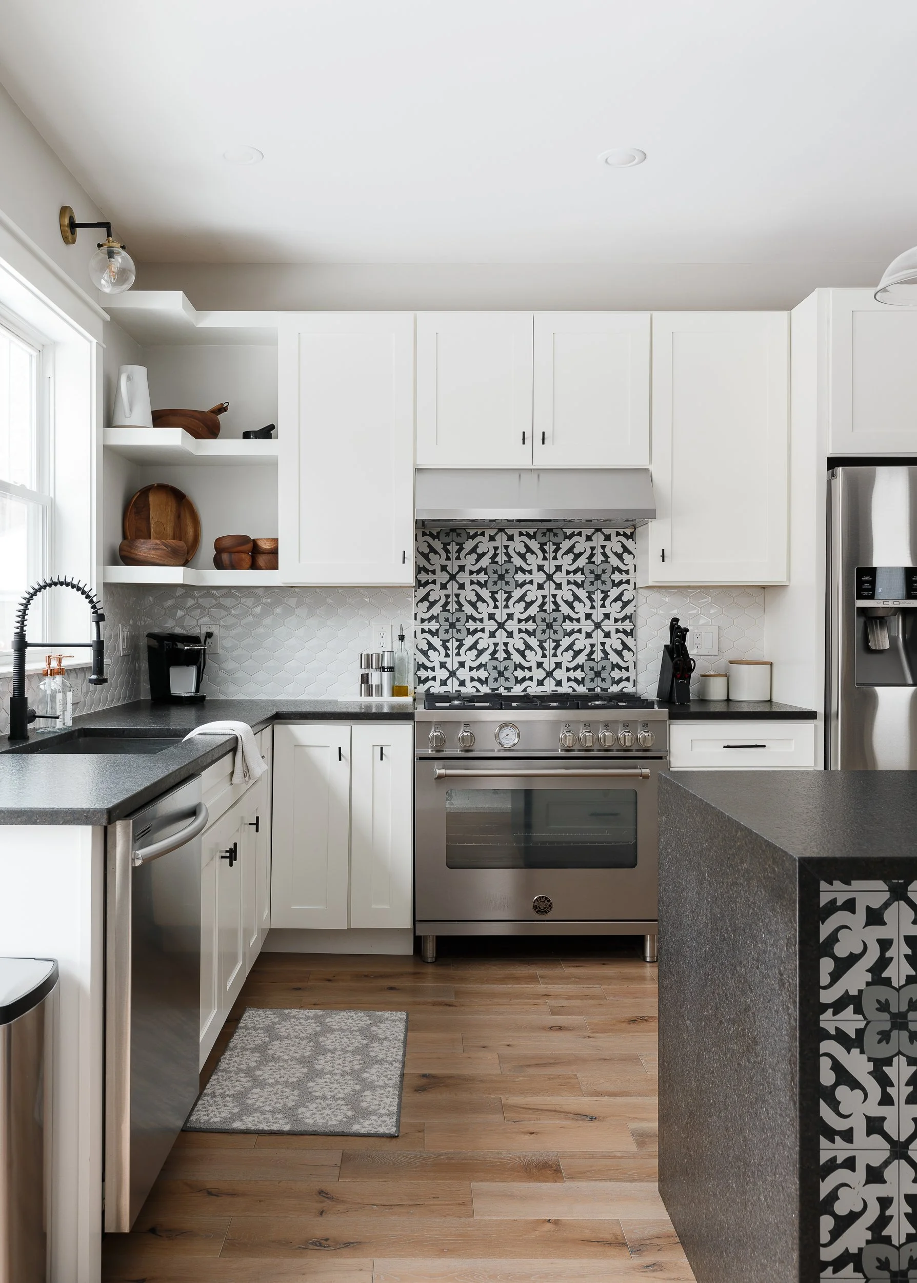 The chef's kitchen features a 5-burner Bertazzoni Professional gas range with an exterior-vented oven hood, a Samsung refrigerator, Samsung dishwasher and disposal and spacious pantry. Stylish professional designer touches include leathered granite countertops, custom white shaker cabinets and tile backsplash. The sizable kitchen island houses a Sharp under-counter microwave.