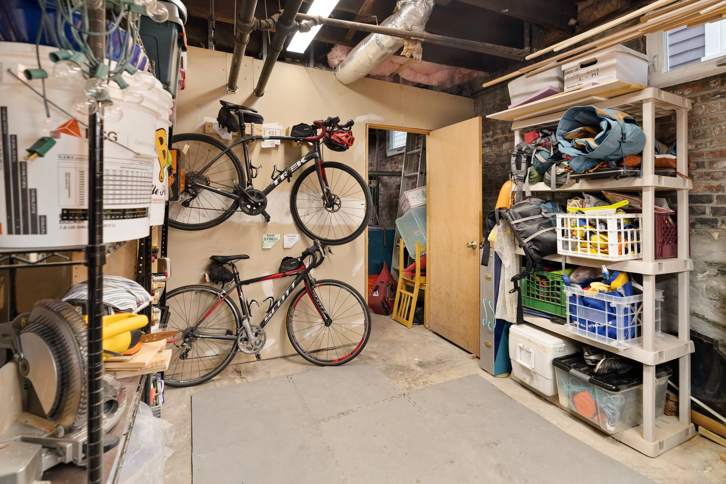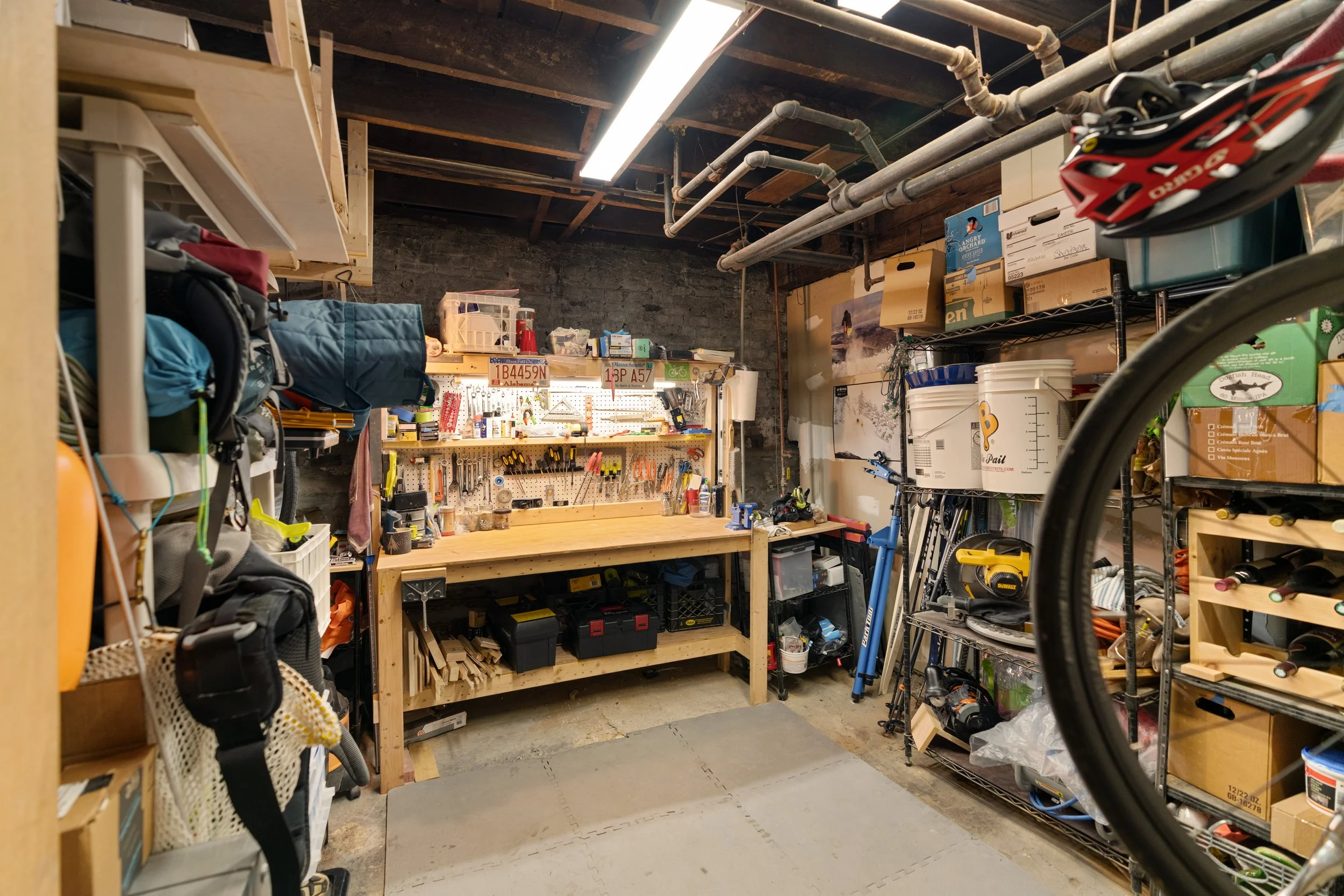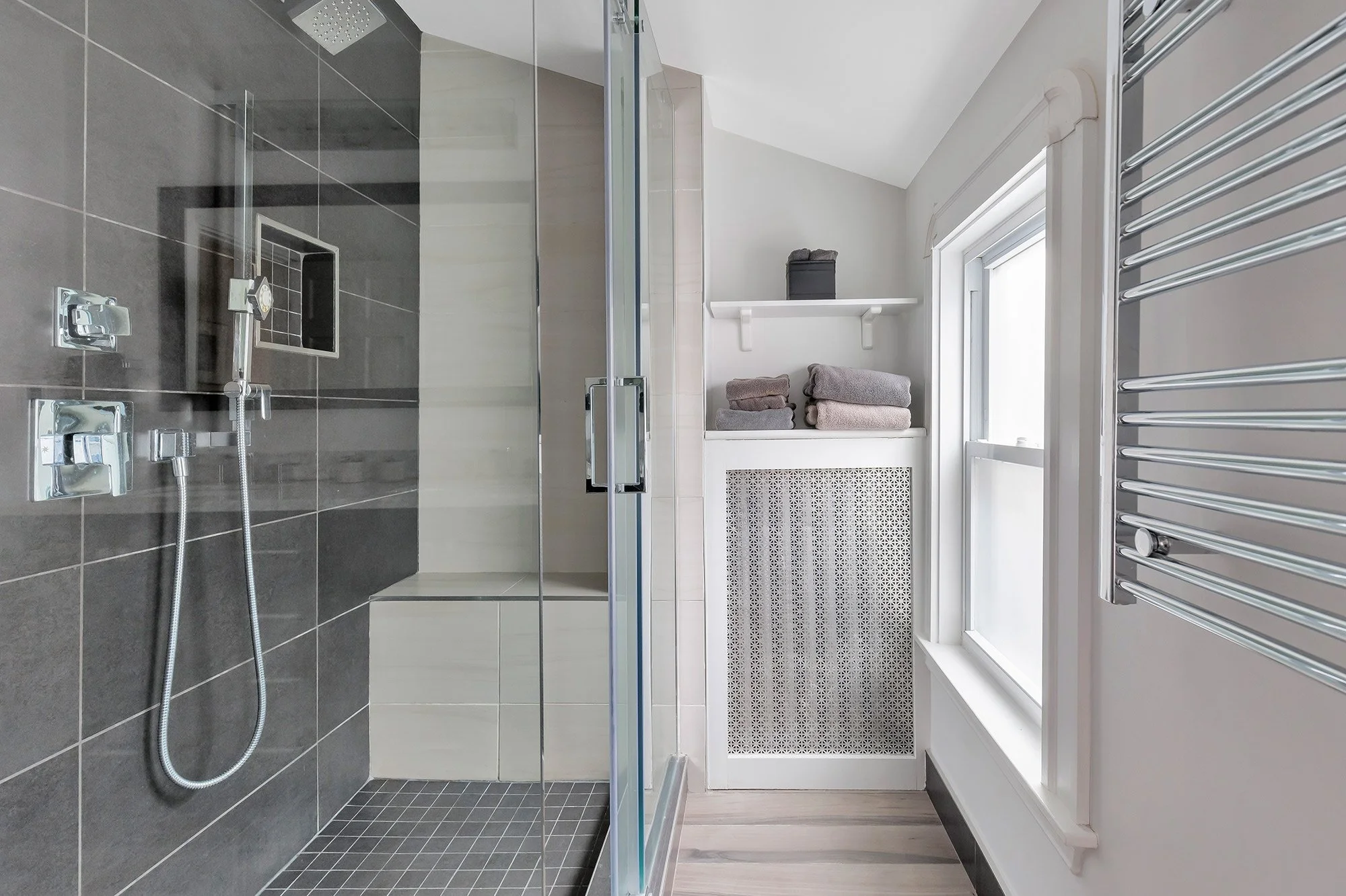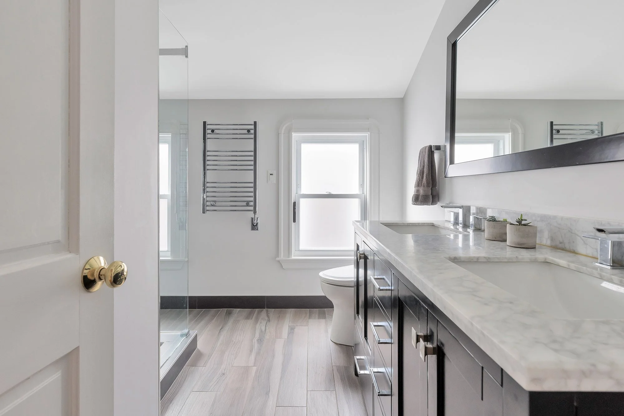 The superb full bathroom on the 2nd floor was gut renovated in 2017 and features a walk-in tile-surround shower, a stylish onyx double vanity with marble counter, a toilet with heated seat and bidet, heated towel rack, and sleek heated gray tile flooring.