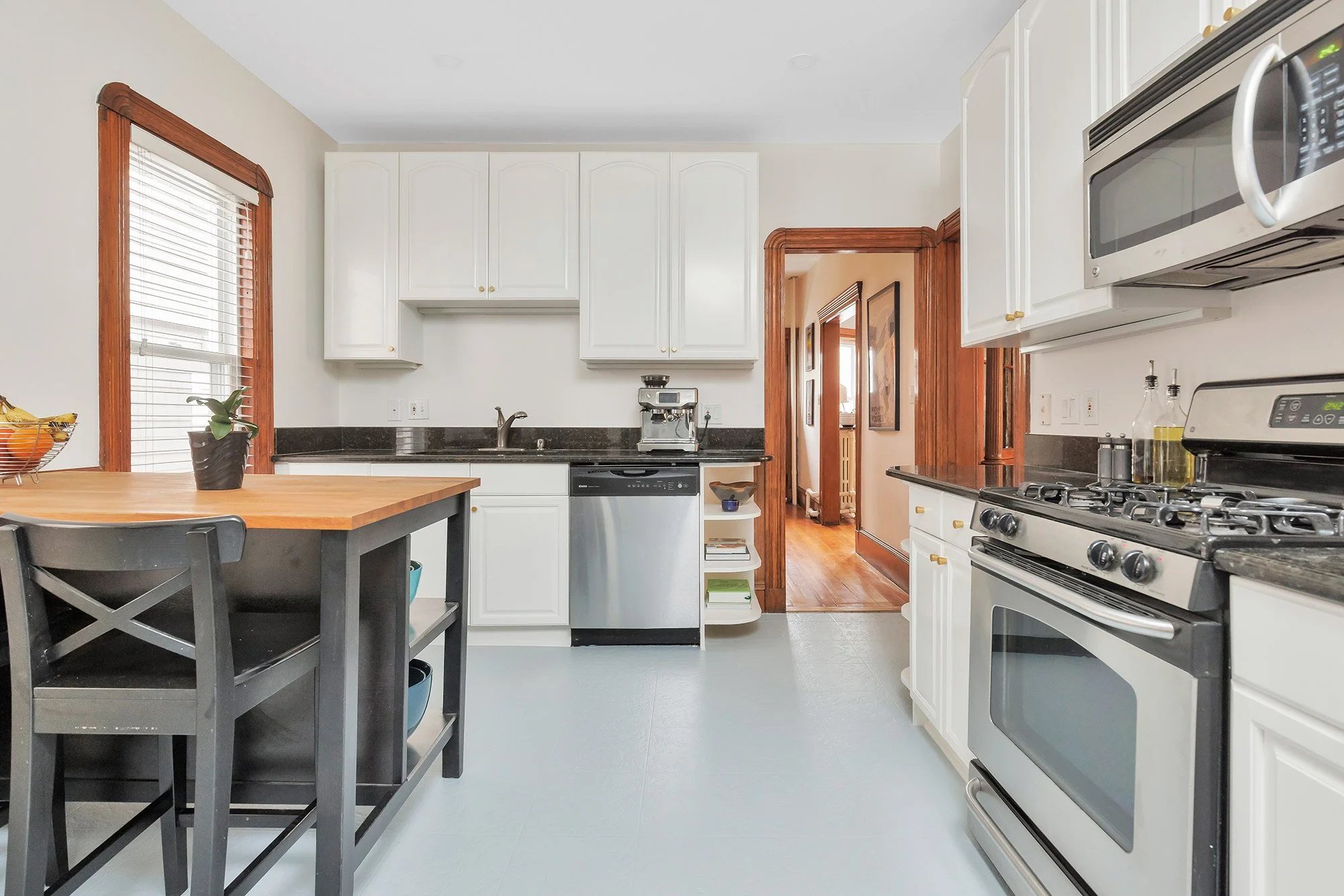 The spacious and bright updated eat-in kitchen boasts white shaker cabinetry, black granite countertops, stainless steel appliances, recessed lighting, a stylish light fixture and under cabinet lighting. Stainless appliances include a 4-burner gas range, a fridge, a dishwasher and a microwave above range. A pantry provides additional storage.