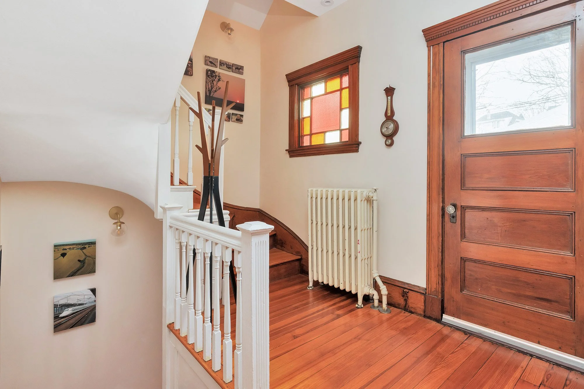Enter the home through a shared entrance and up a set of stairs to the foyer where you will find a very spacious landing looking into the sun-filled living room.