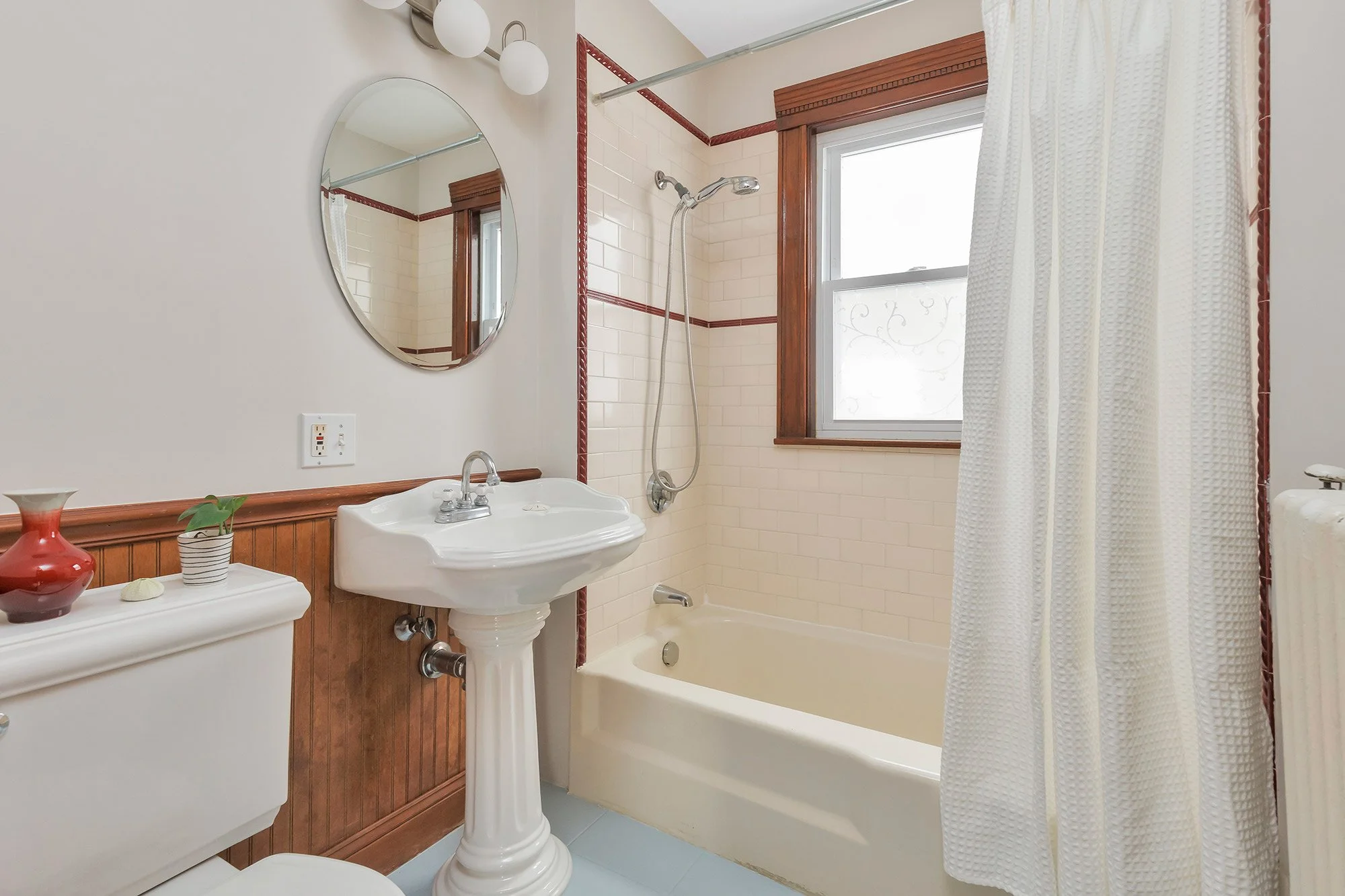 A gleaming full bath across the hall from the living room features a pedestal sink, tub shower with tile surround and a beautiful wood framed medicine cabinet for additional storage.