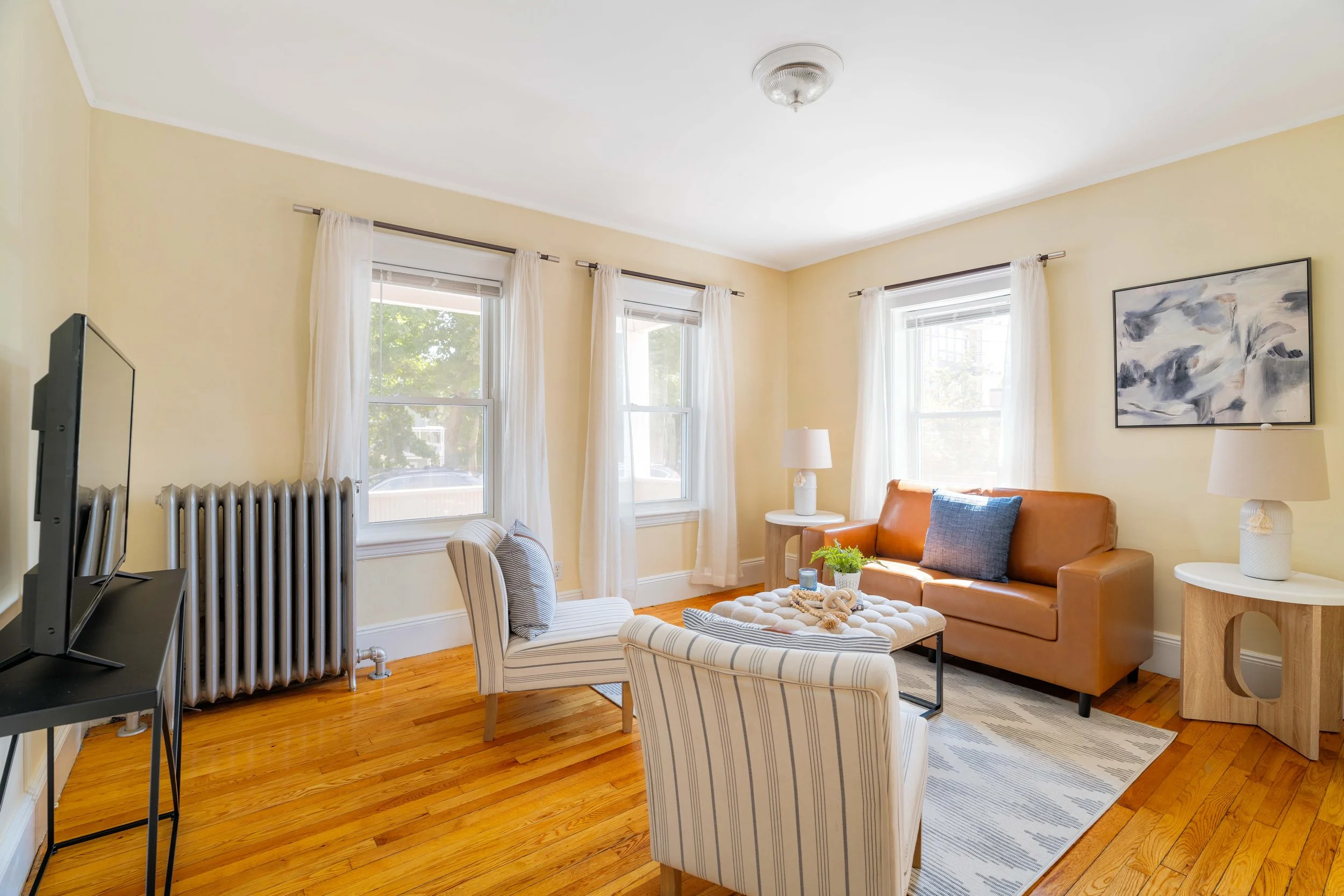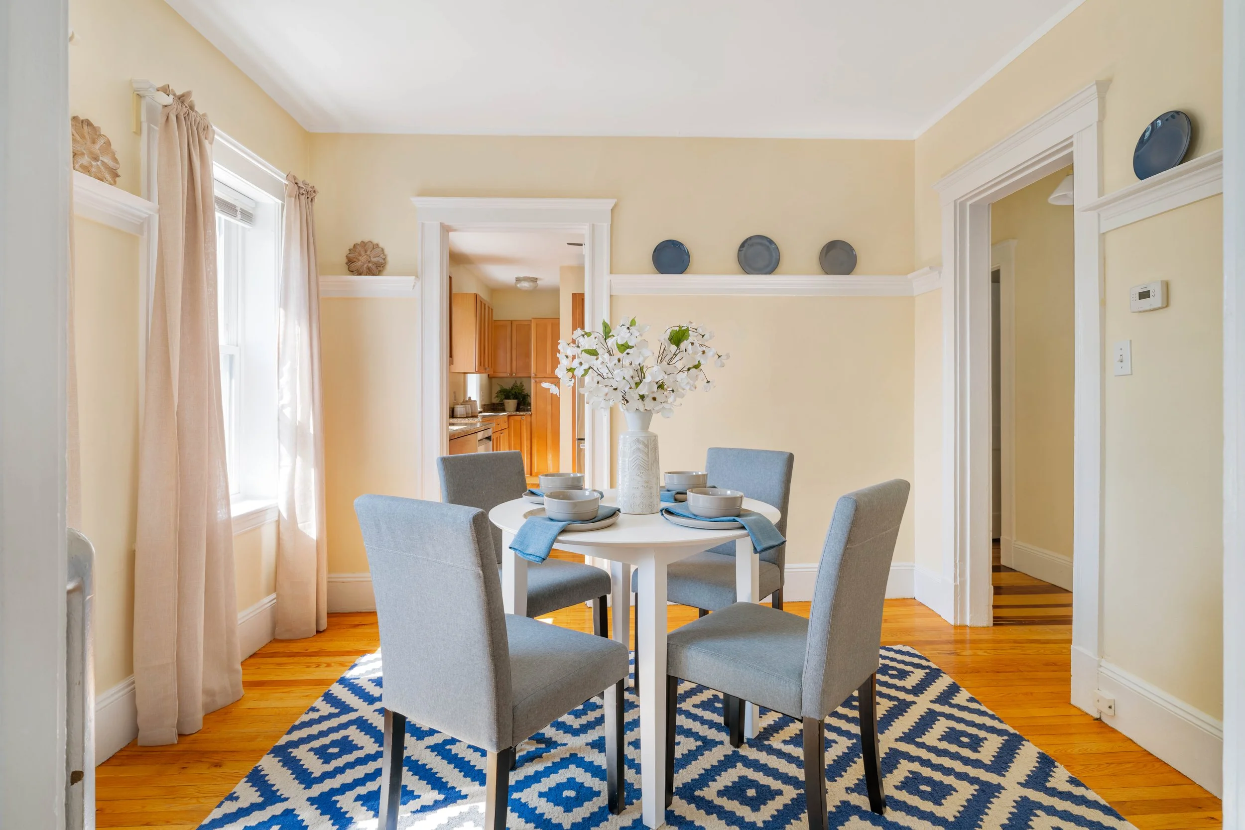 Upon entering your home, you'll be greeted by an abundance of natural light and beautifully maintained hardwood floors that infuse the space with warmth and character. The living area seamlessly flows into the dining room, creating an ideal setting for entertaining. Five large windows allow sunlight to pour in, enhancing the inviting atmosphere. The dining room is further complemented by classic molding, adding a touch of elegance.