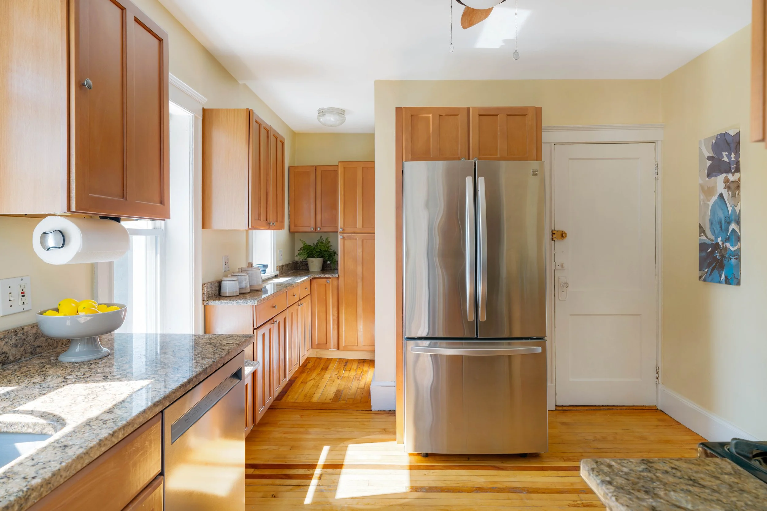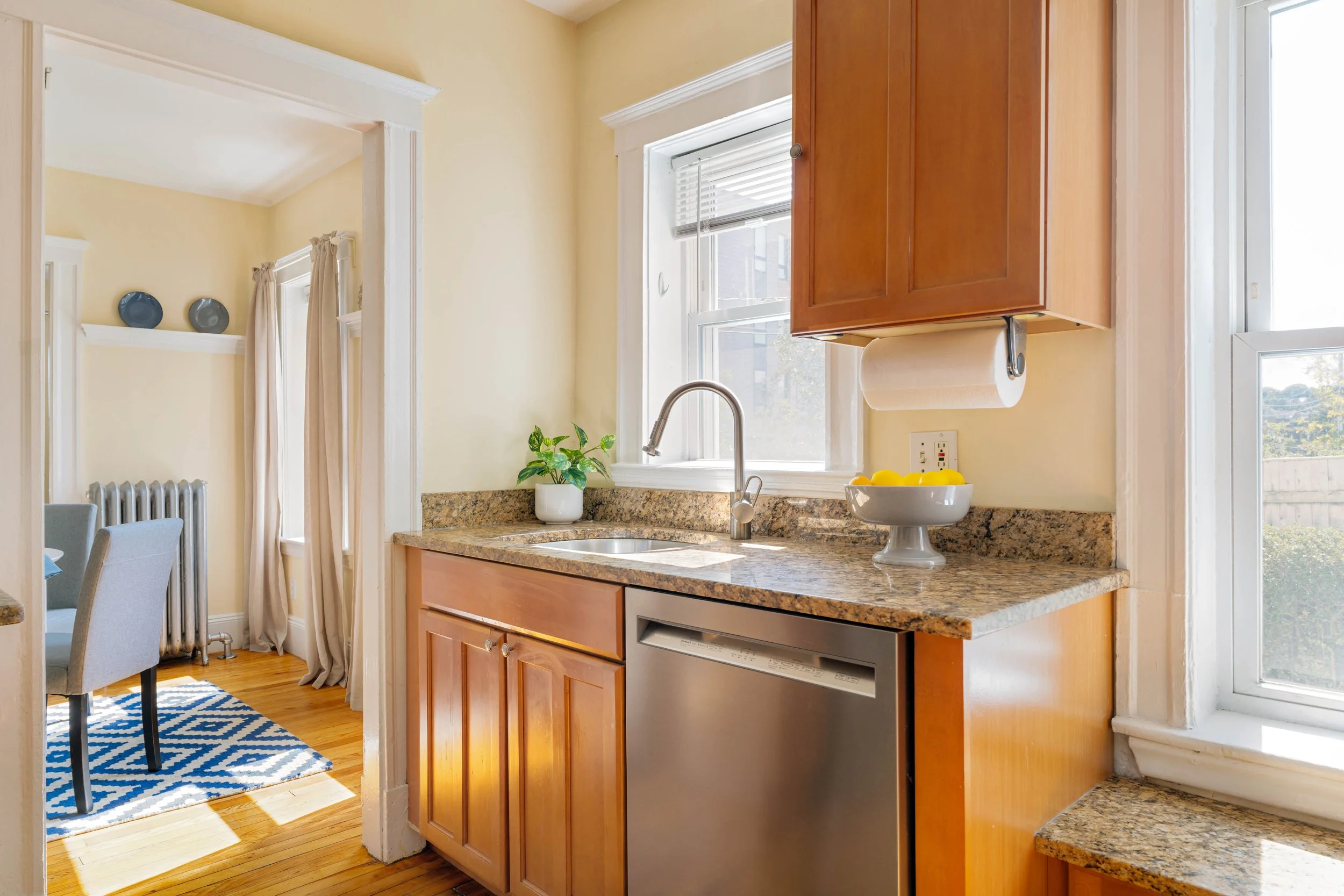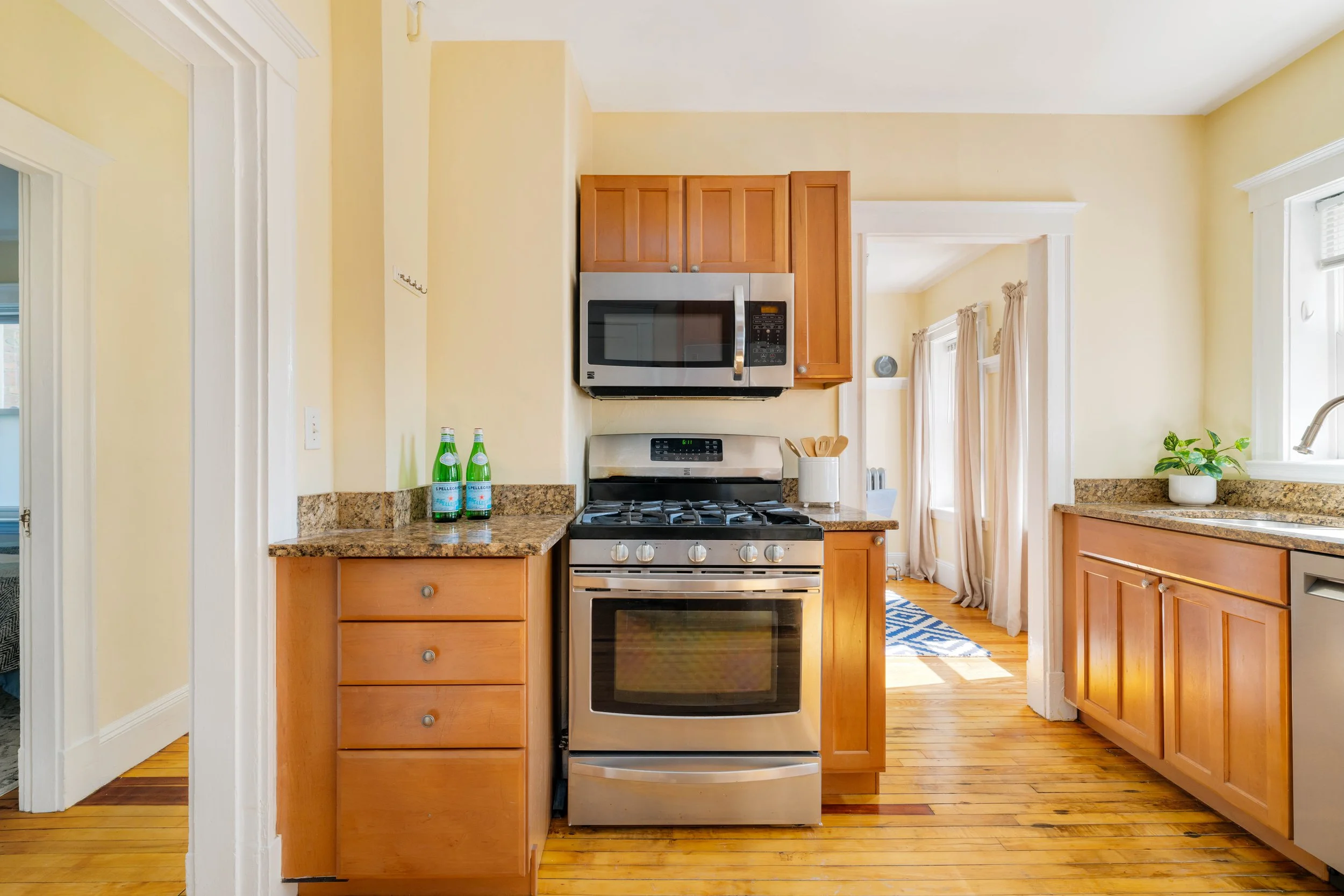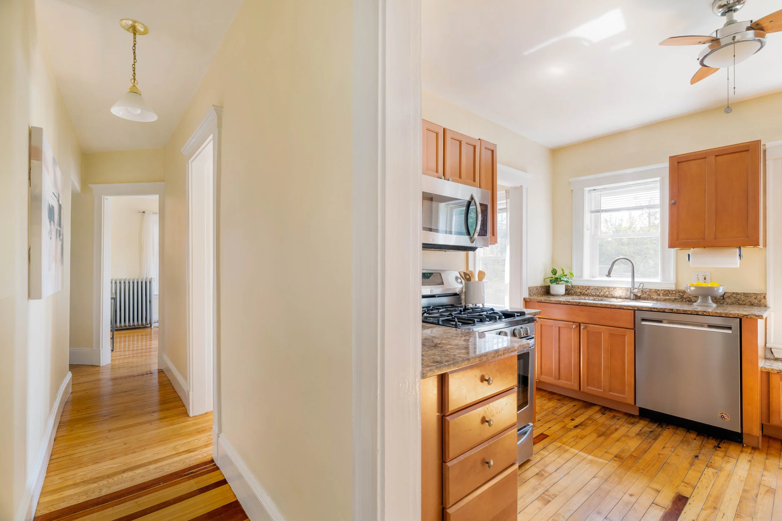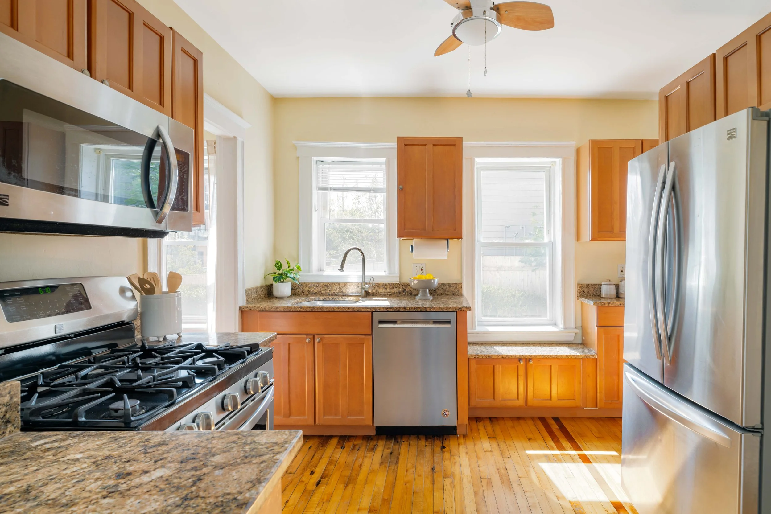 The updated kitchen boasts natural wood cabinetry, stainless steel appliances—including a refrigerator, gas stove, dishwasher, and microwave—granite countertops, and direct access to your back deck and yard. Enjoy washing dishes while gazing out at the fenced-in yard.