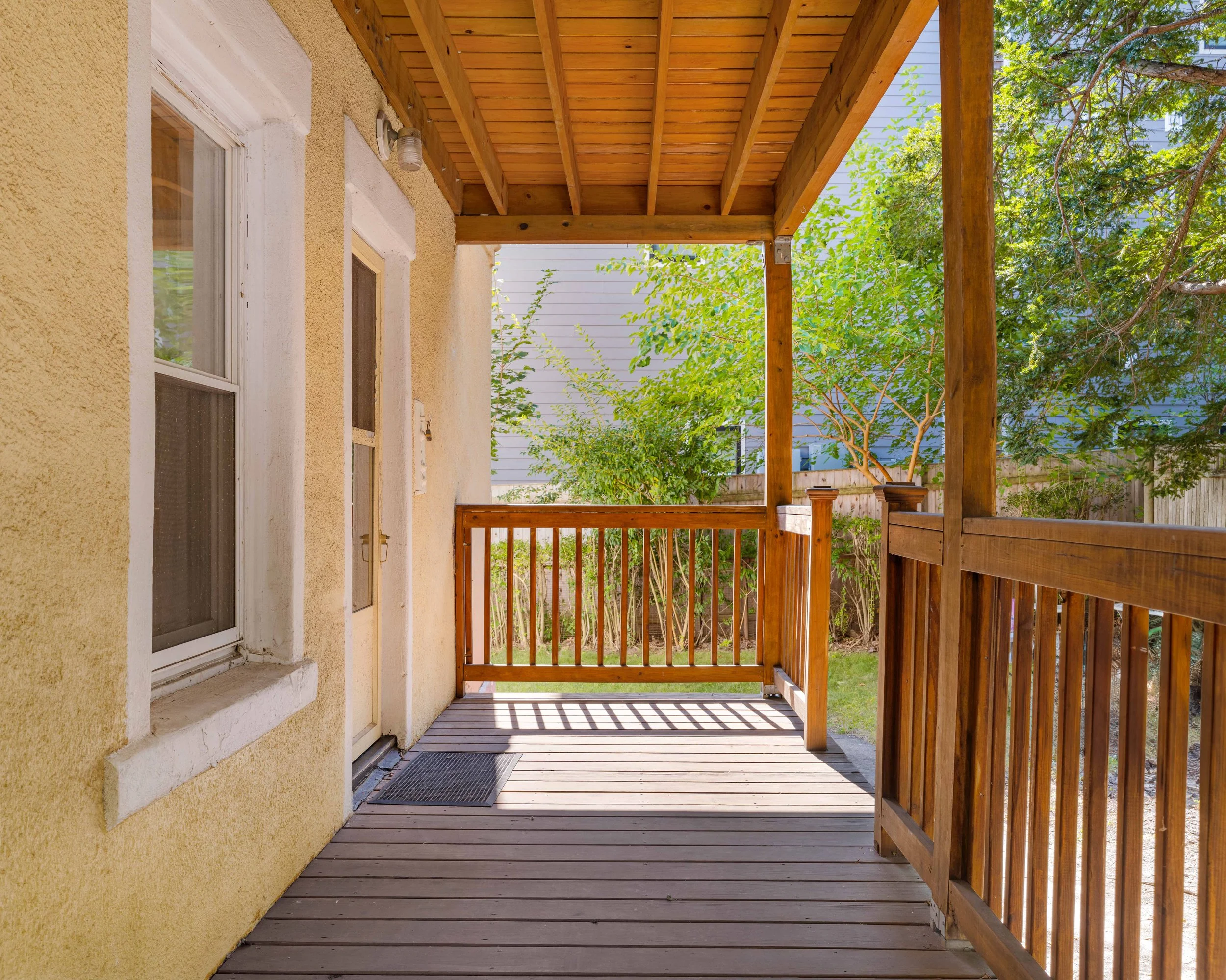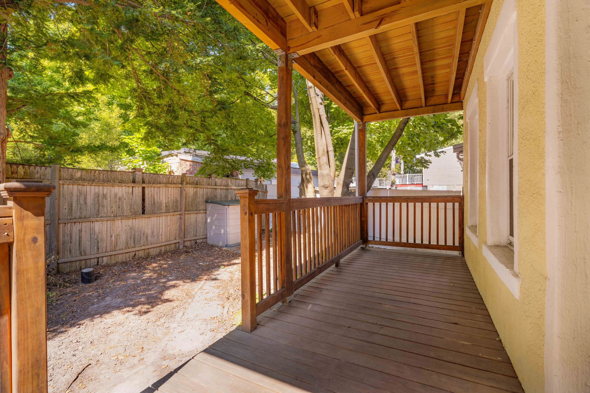 Outdoor space: There are two decks—one at the front of the home and one at the back—and a shared fenced-in yard.