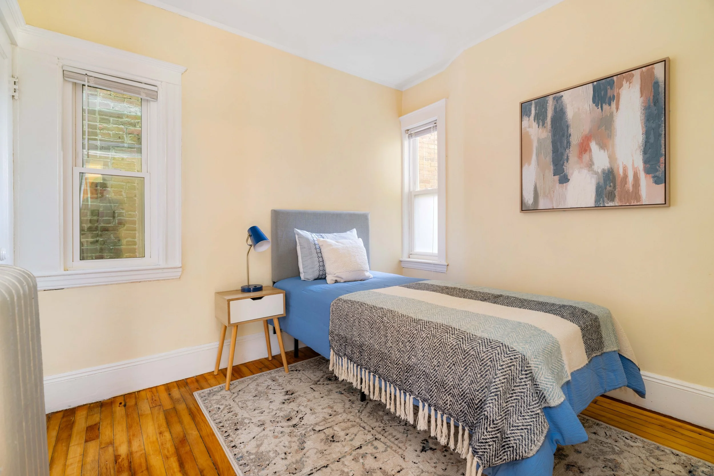 The primary bedroom, located at the rear of the home, offers a peaceful retreat with two large windows and a generously sized closet. The second bedroom, while smaller, includes a closet and two windows.