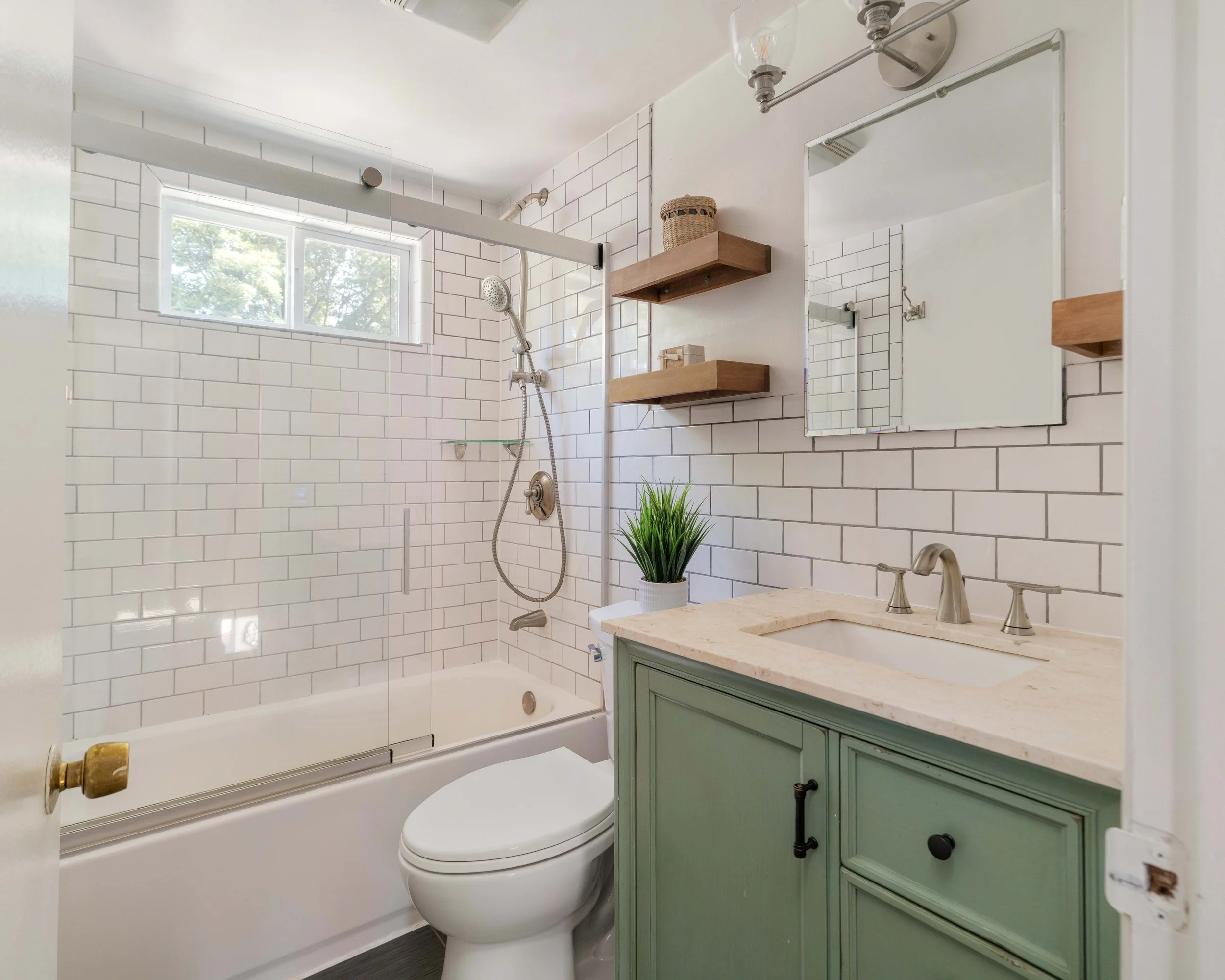 The adjacent renovated bathroom boasts tub/shower combination with ceramic tile surround, handsome vanity with new overhead lighting and heated ceramic tile flooring.