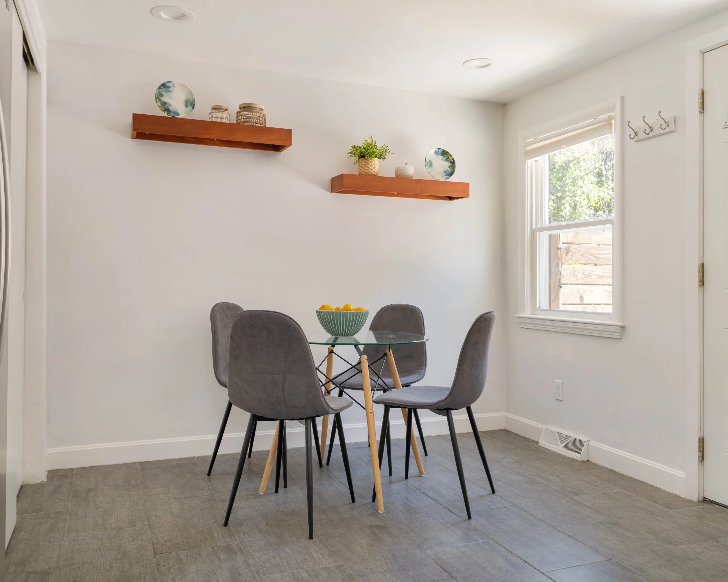 From the kitchen, the rear door leads not only to parking for up to 4 cars but to a large private outdoor patio demarcated on two sides by a tall hardwood fence. A raised railroad tie garden bed provides the perfect space for herbs, vegetables and flowers.