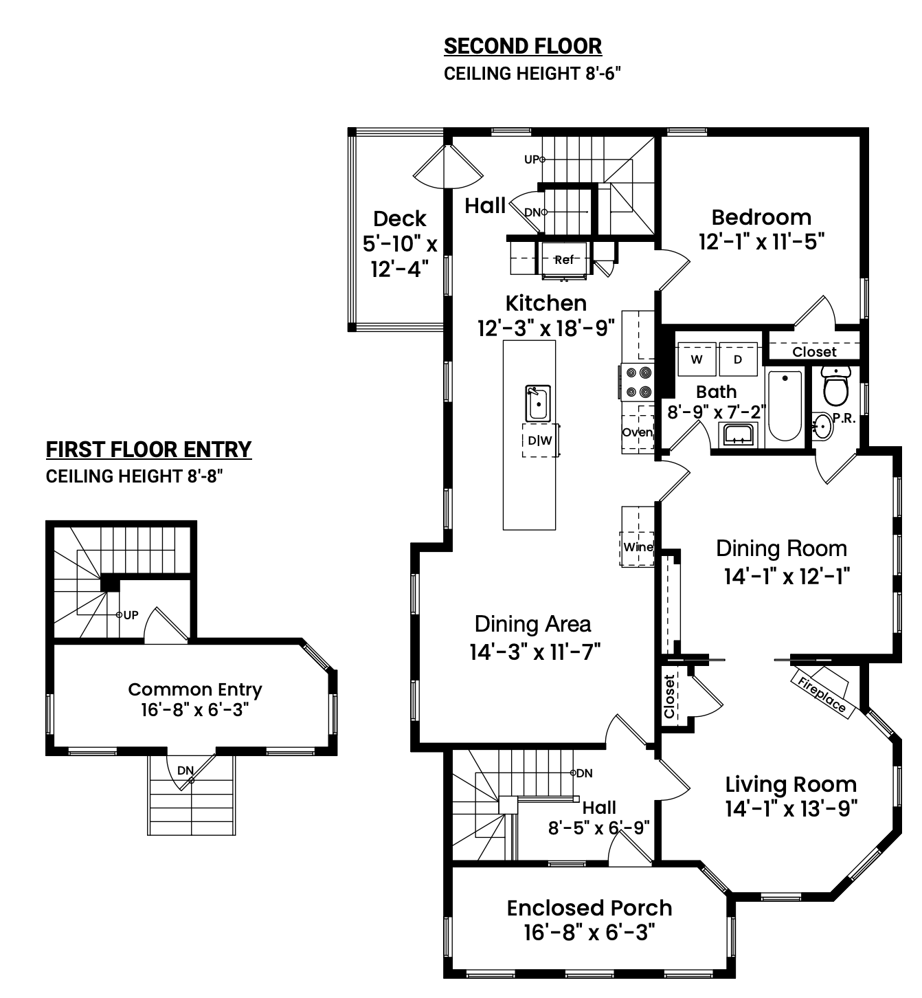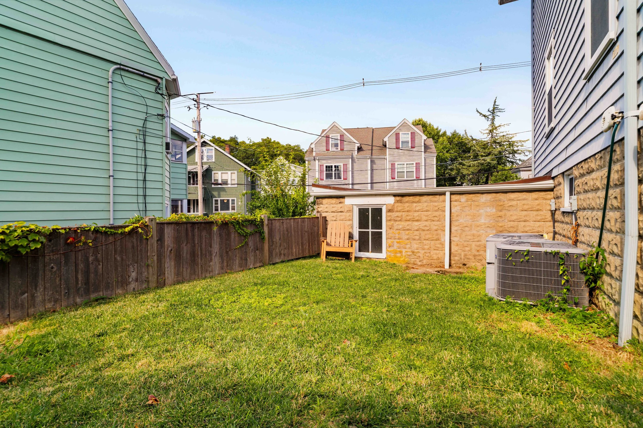 A back porch is located at the rear of the home, off the kitchen, along with a stairwell leading down to the parking and yard, and up to the top floor.