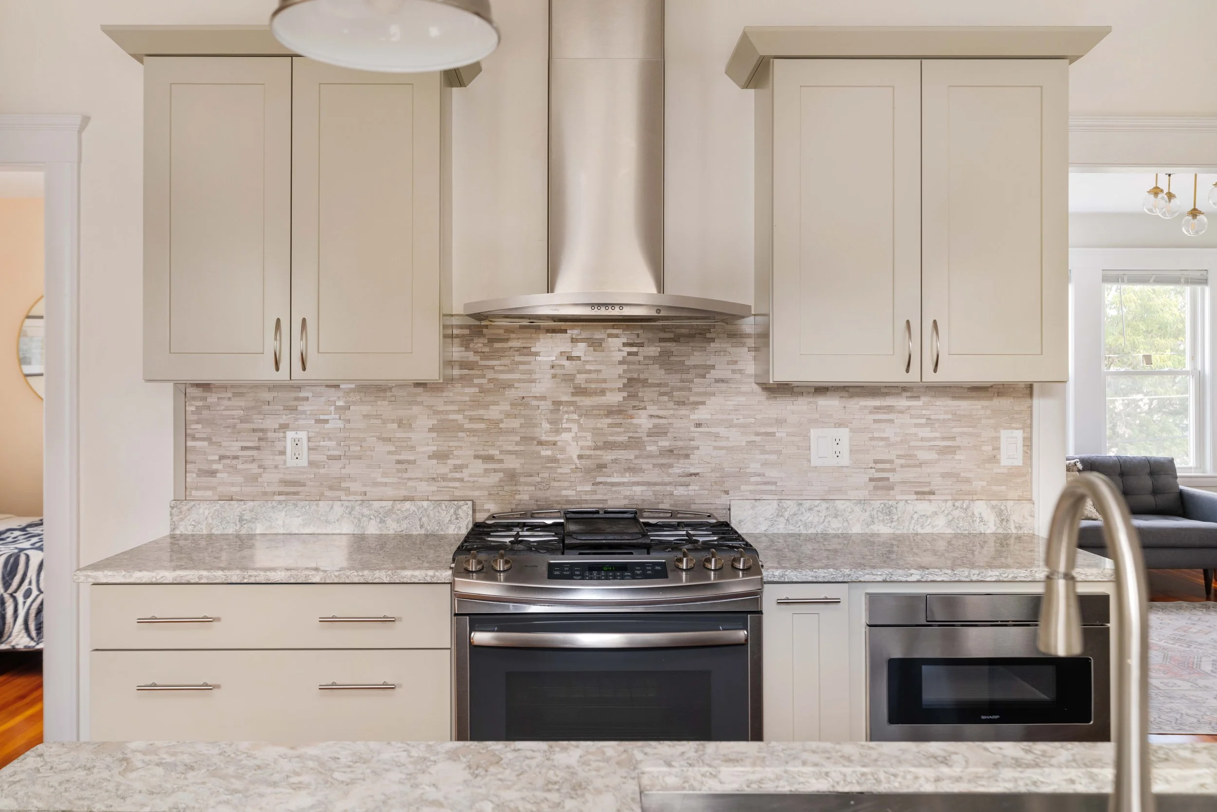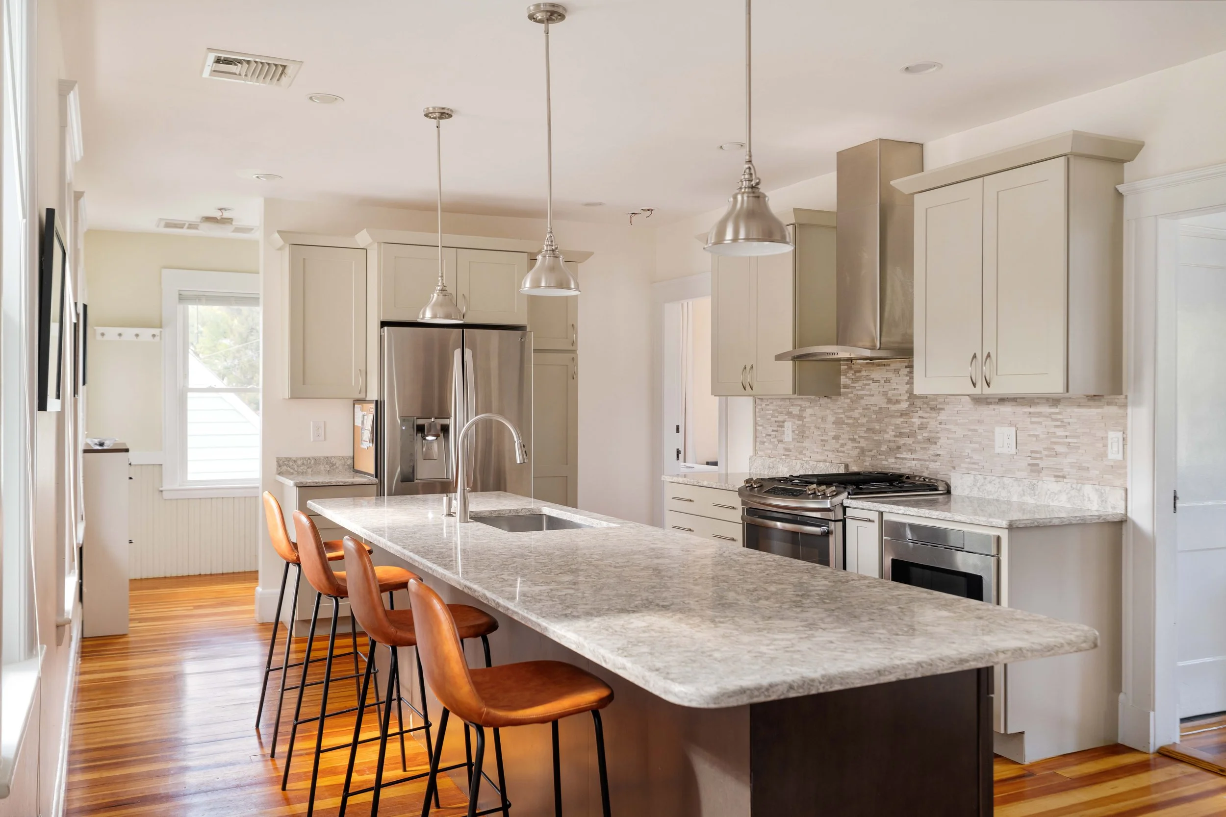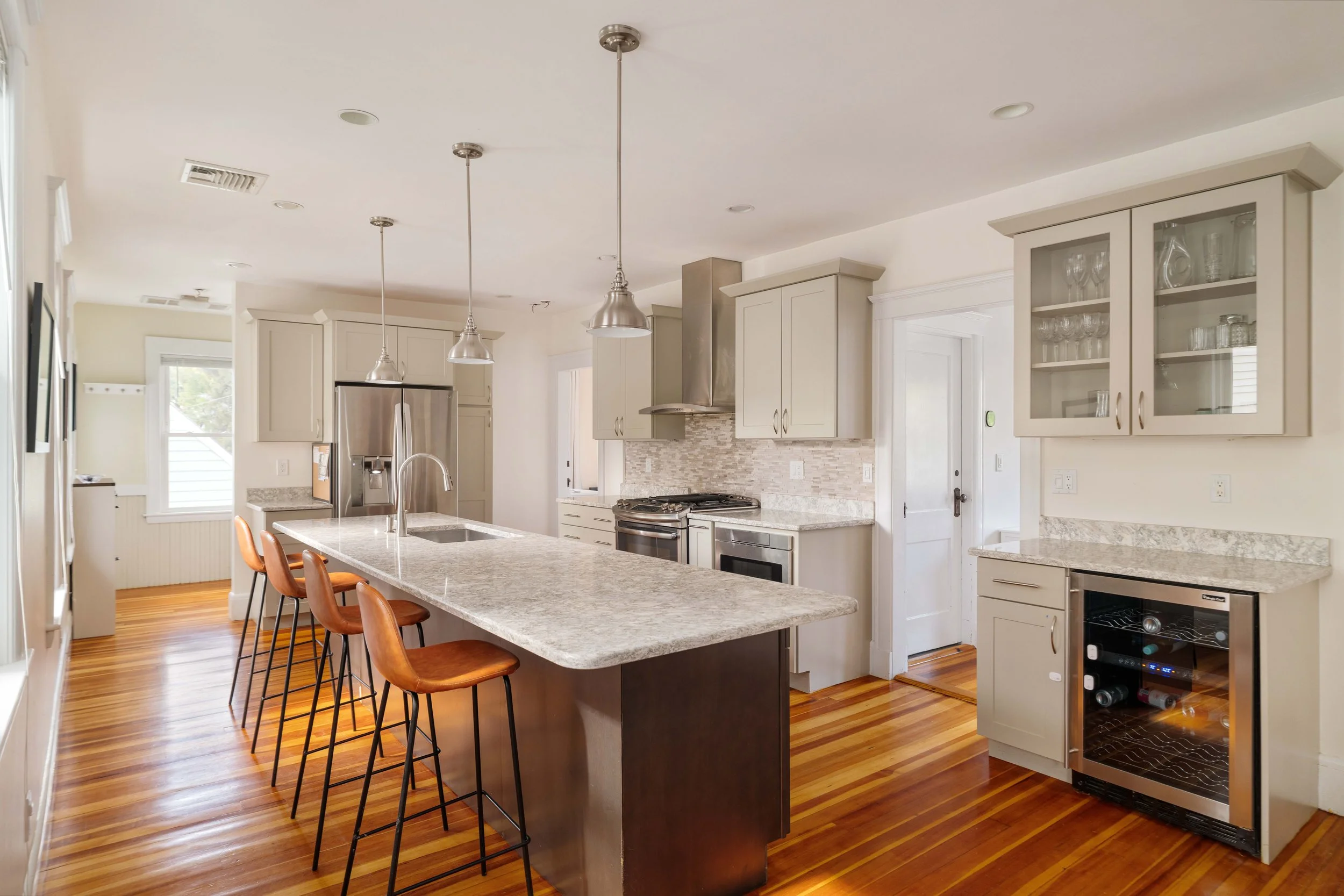To the left of the entry the roomy designer kitchen, which features quartz counters, shaker cabinets with stainless hardware, stainless sink with a garbage disposal, and a large island with seating, as well as a large open space for a casual dining setup or sitting area. Appliances include a GE gas range and hood (2016), Bosch dishwasher (2016), and LG french door refrigerator (2016) with water/ice dispenser. There is a Sharp Microwave (2016) built into the cabinets and a Magic Chef beverage fridge (2016).