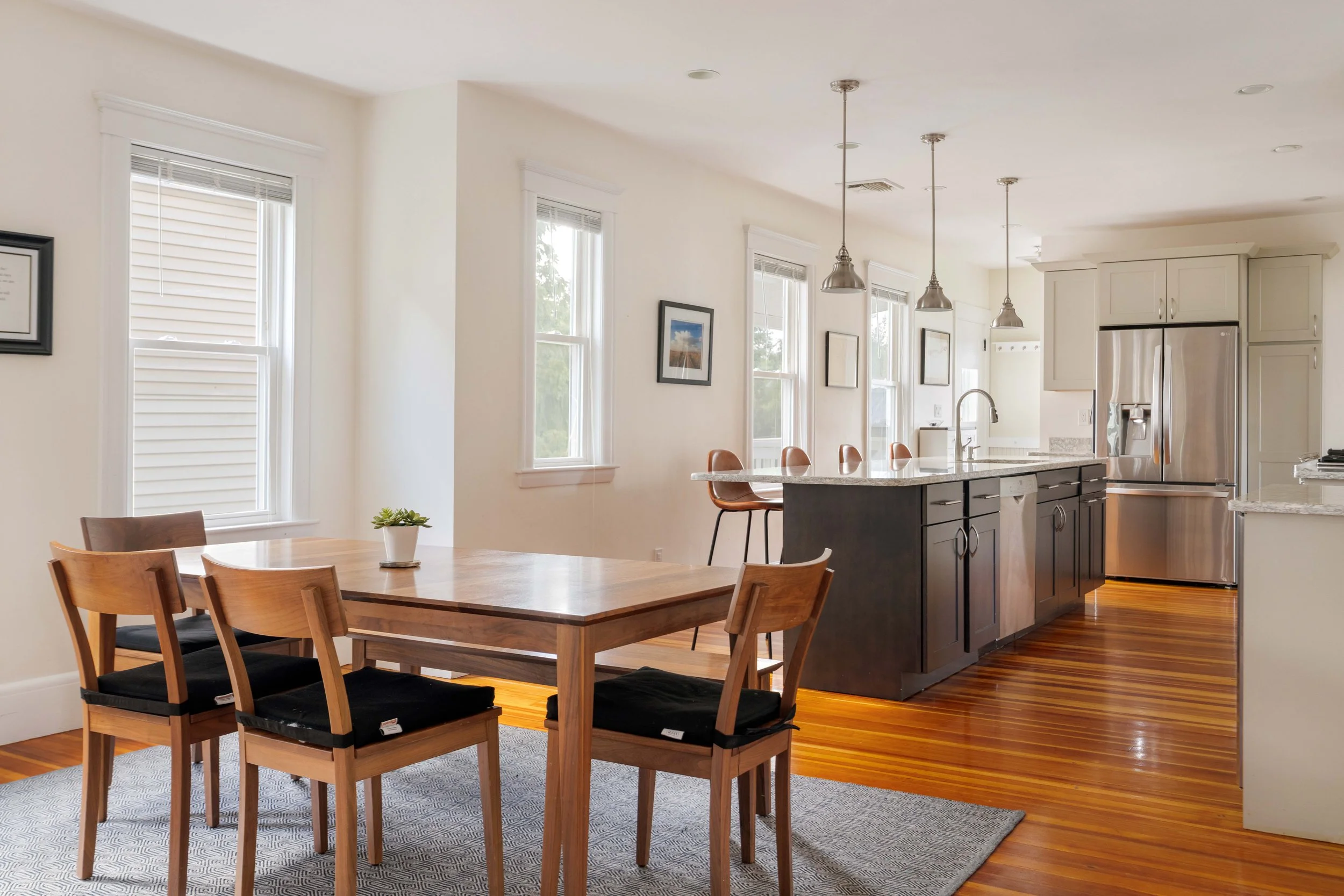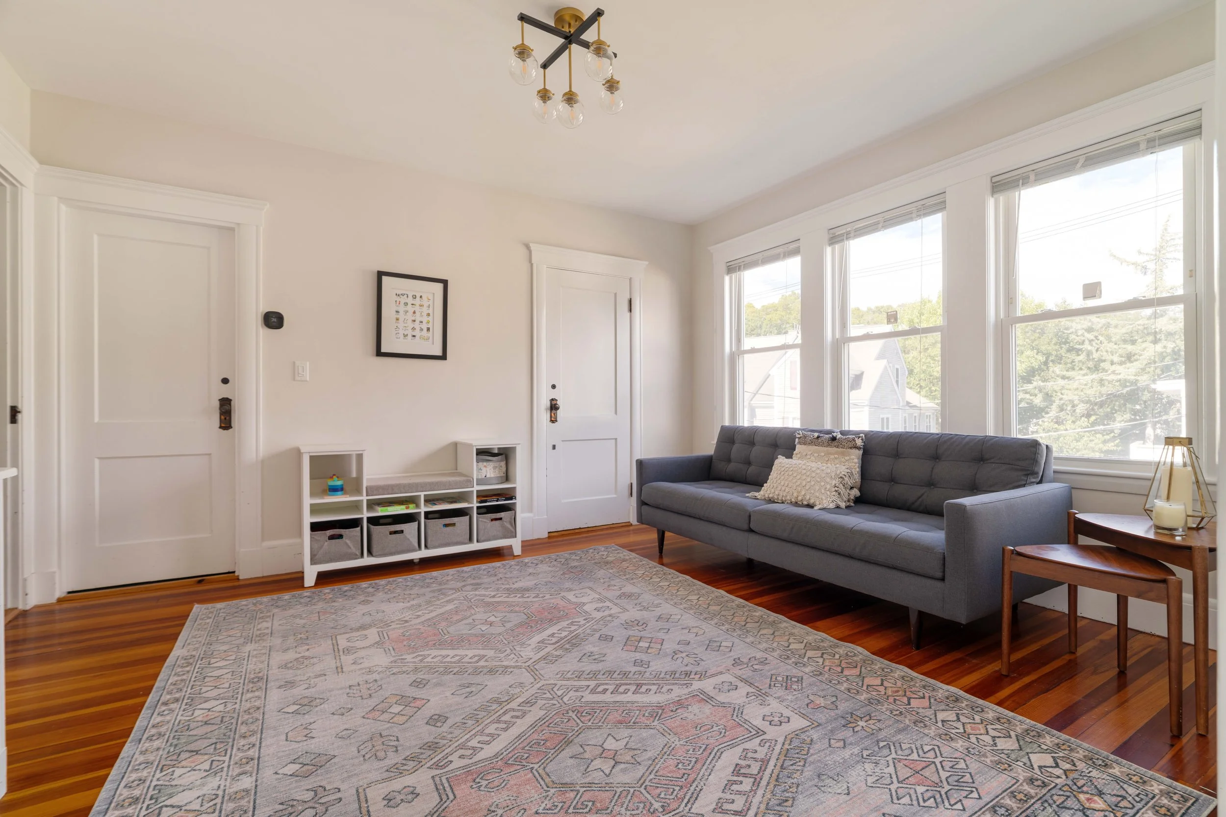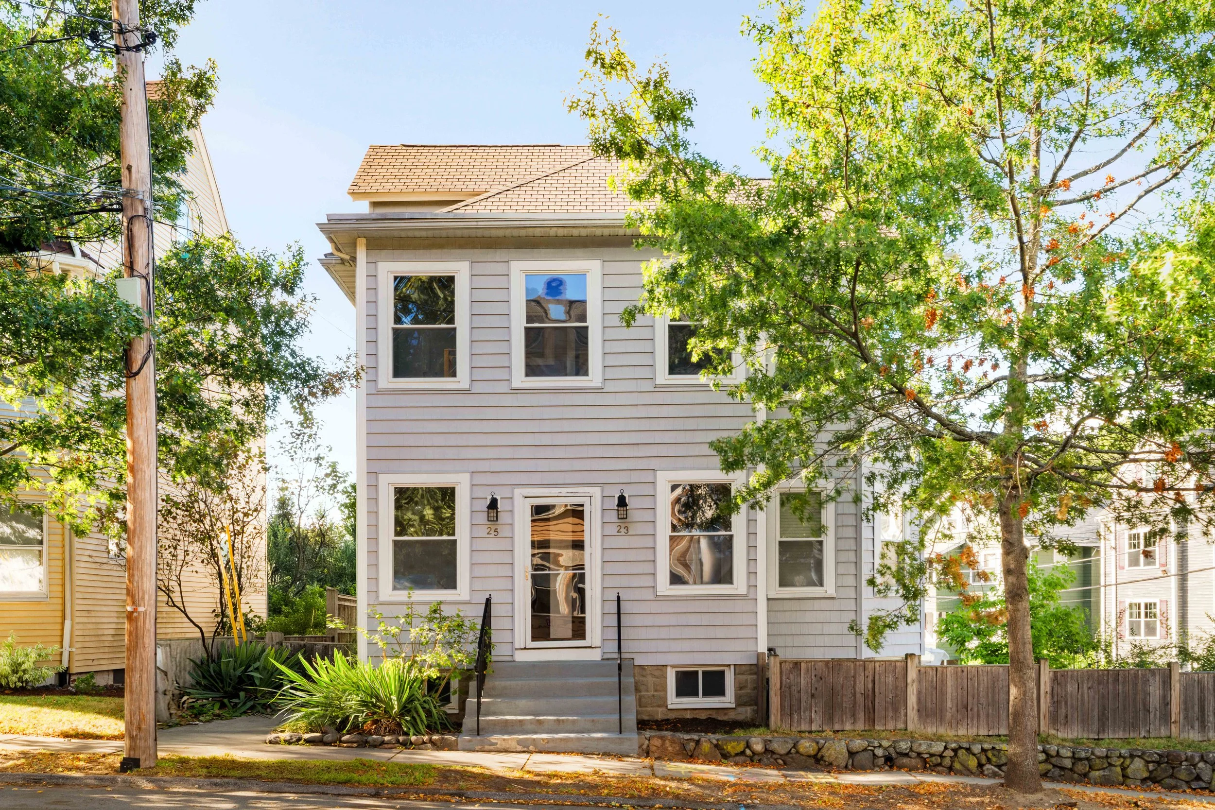 On a quiet, tree-lined street just outside Waverly Square, this sun-filled 3-bed, 2.5-bath condo gracefully marries period detail with modern comfort. Treetop views, a substantial chefâs kitchen, in-unit laundry, direct access garage parking, and a tranquil yard elevate daily living. The main level flows seamlessly from the airy living room with fireplace and the stately dining room with built-ins to the custom kitchen. The roomy kitchen features a large island, quartz counters, stainless appliances and access to the private porch â perfect for dining al fresco. A bedroom, full and half bath, and enclosed front porch complete the first floor. Upstairs, two serene bedrooms with vaulted ceilings include the spacious primary with walk-in closet and direct access to a spa-like bath. Surrounded by parks, schools, shopping and greenery, 25 Moraine offers timeless charm and contemporary ease.