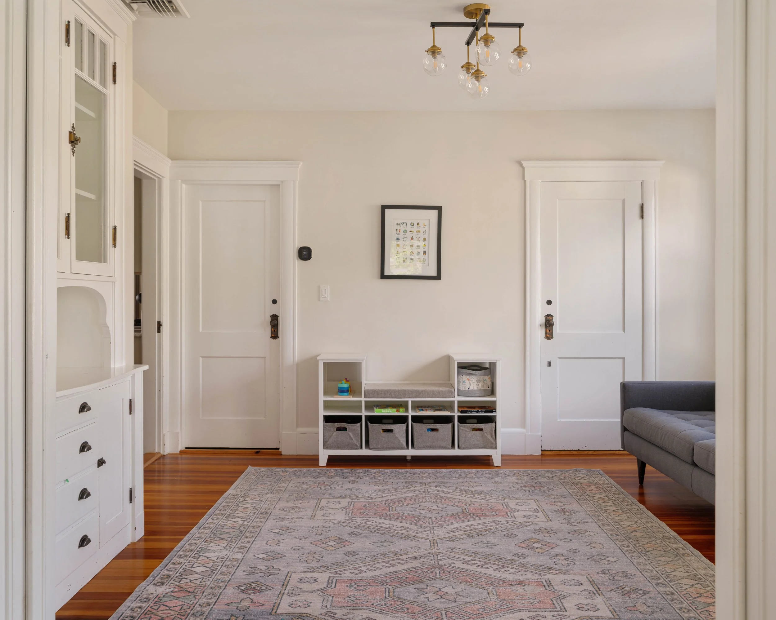 A formal dining room is centered between the kitchen and living room and features original built-ins and easily accommodates an 8-top dining table.