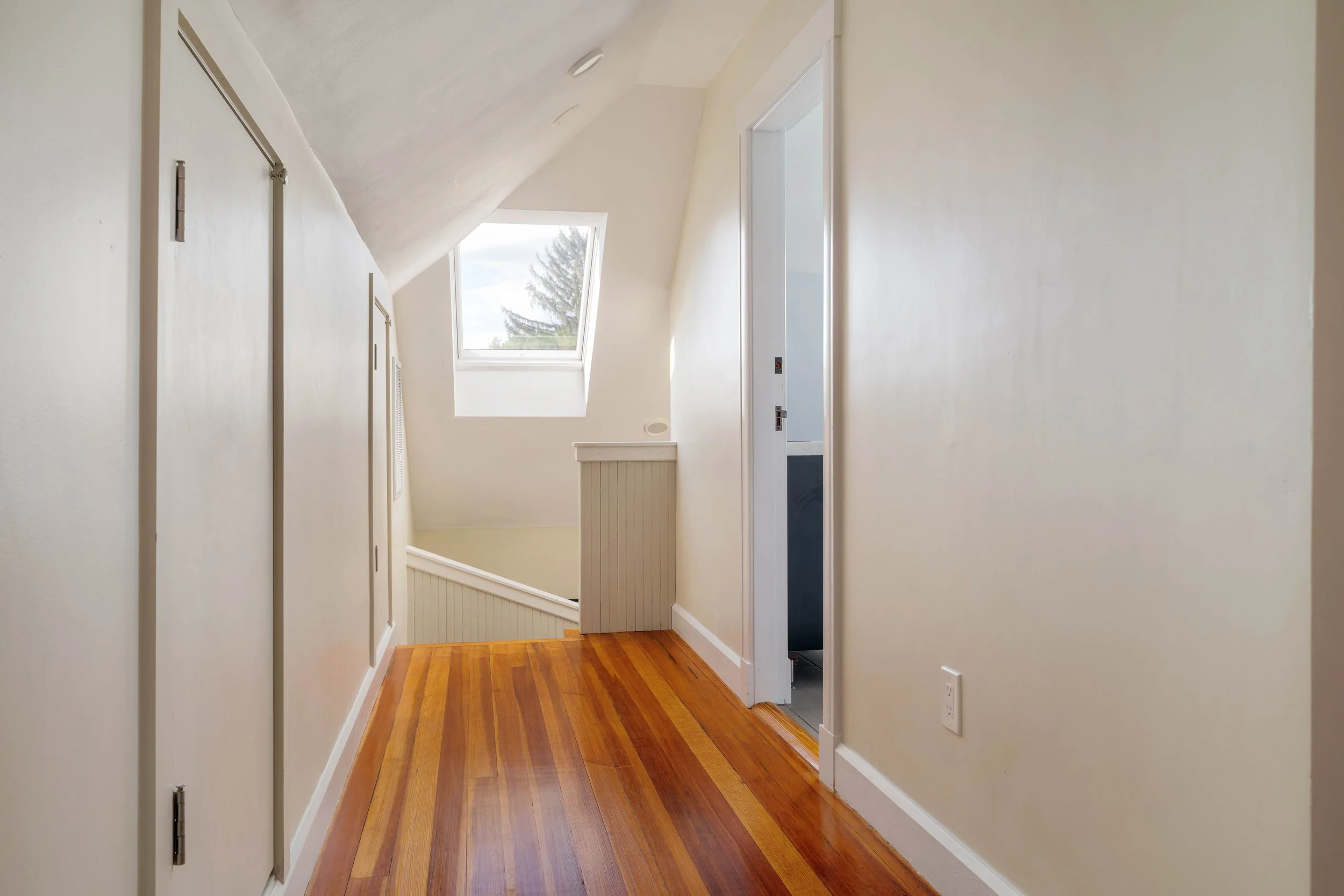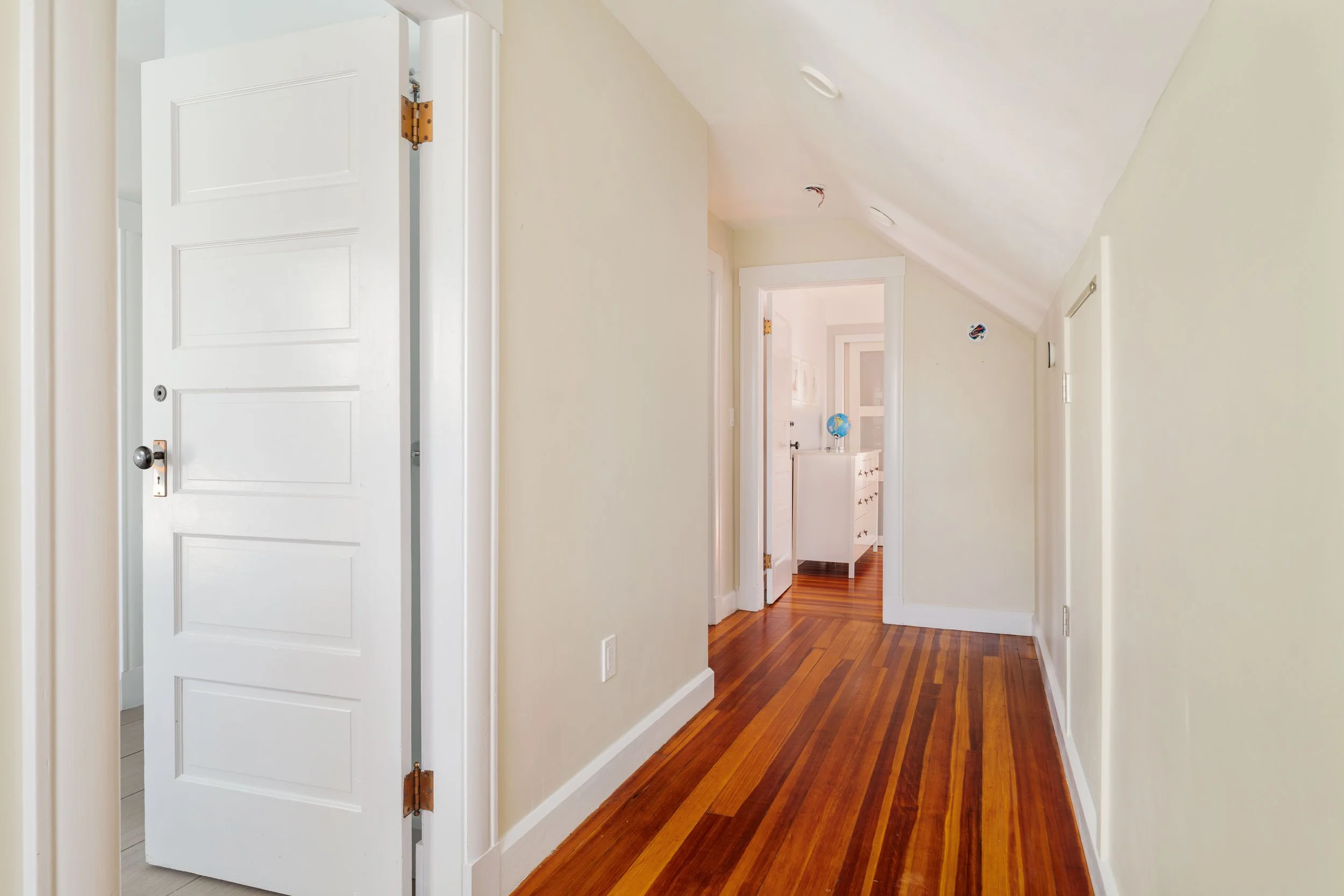 The front entrance leads you up a stairwell to a spacious landing boasting wood floors, original wood trim and a stained glass window, with an area for a bench, hooks, or shoe storage to the right of the stairwell.