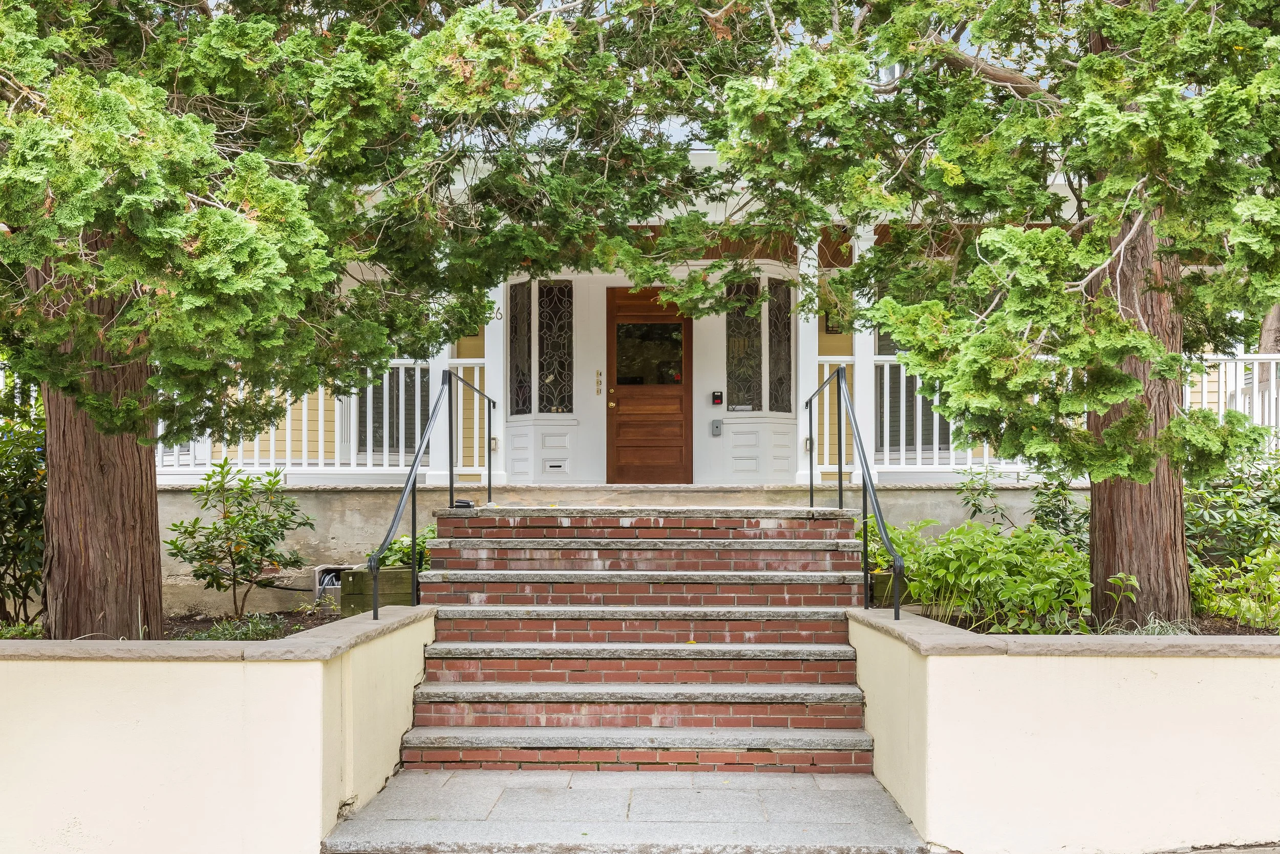 Shaded in mature trees, stone steps culminate at a welcoming front porch