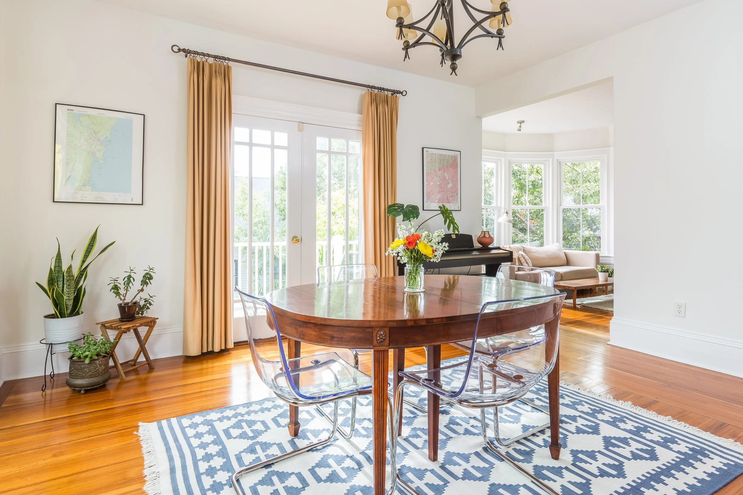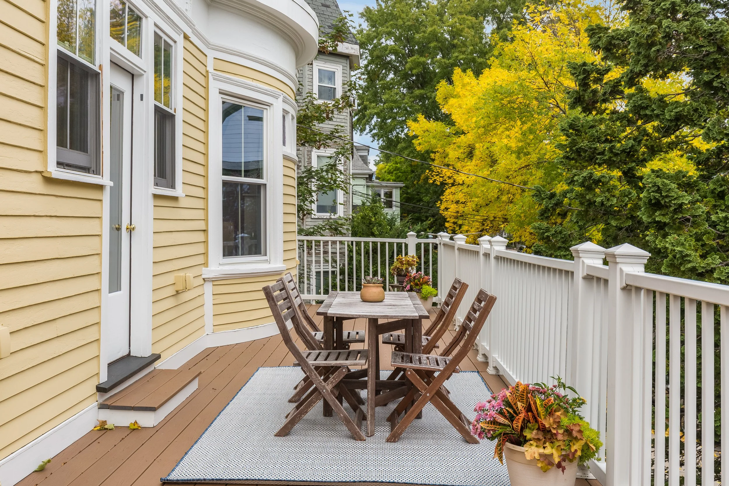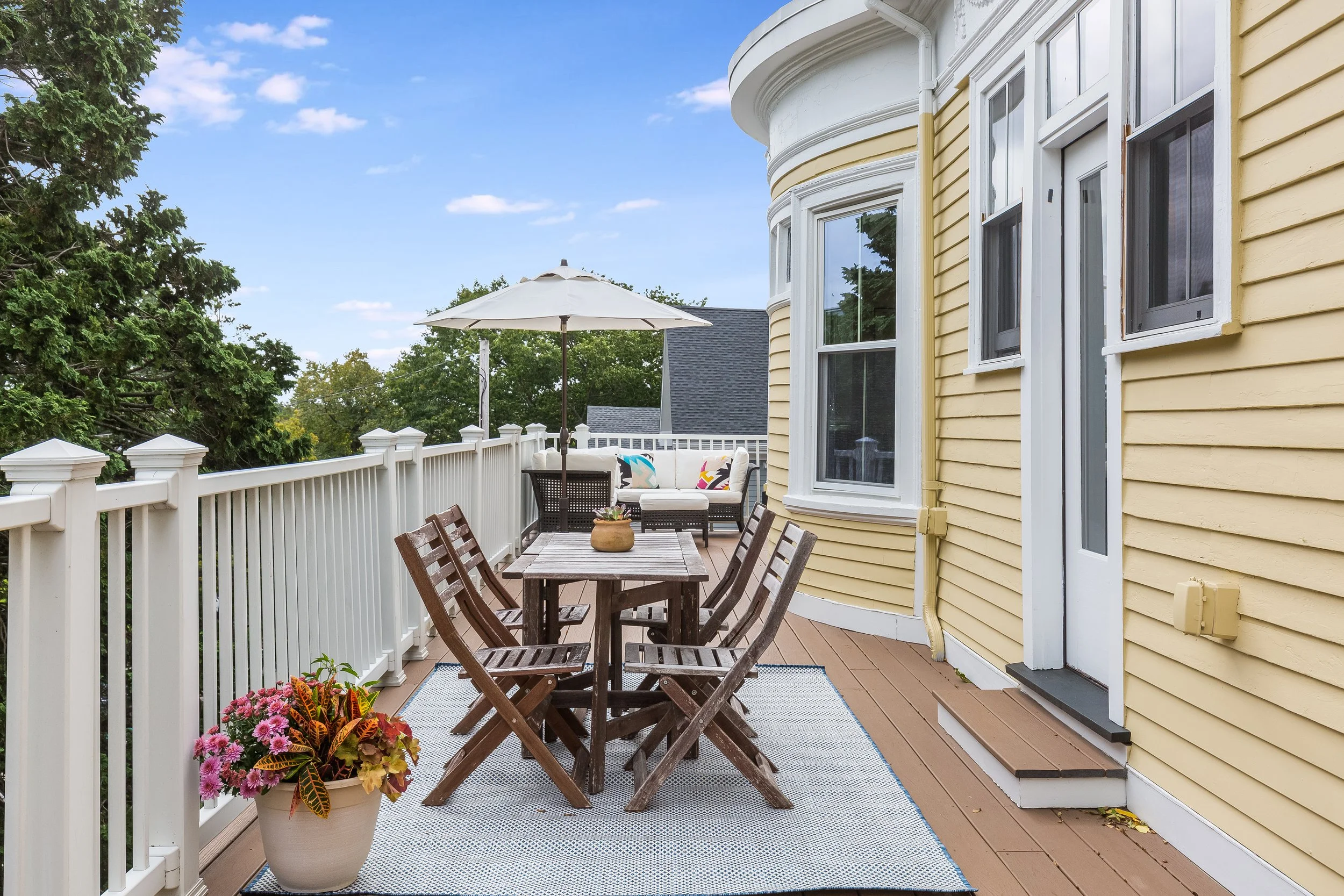 A bright, airy, and spacious dining room boasts a gorgeous original bay window and spills outward into an immense 50’ x 15’ wrap-around deck via French doors