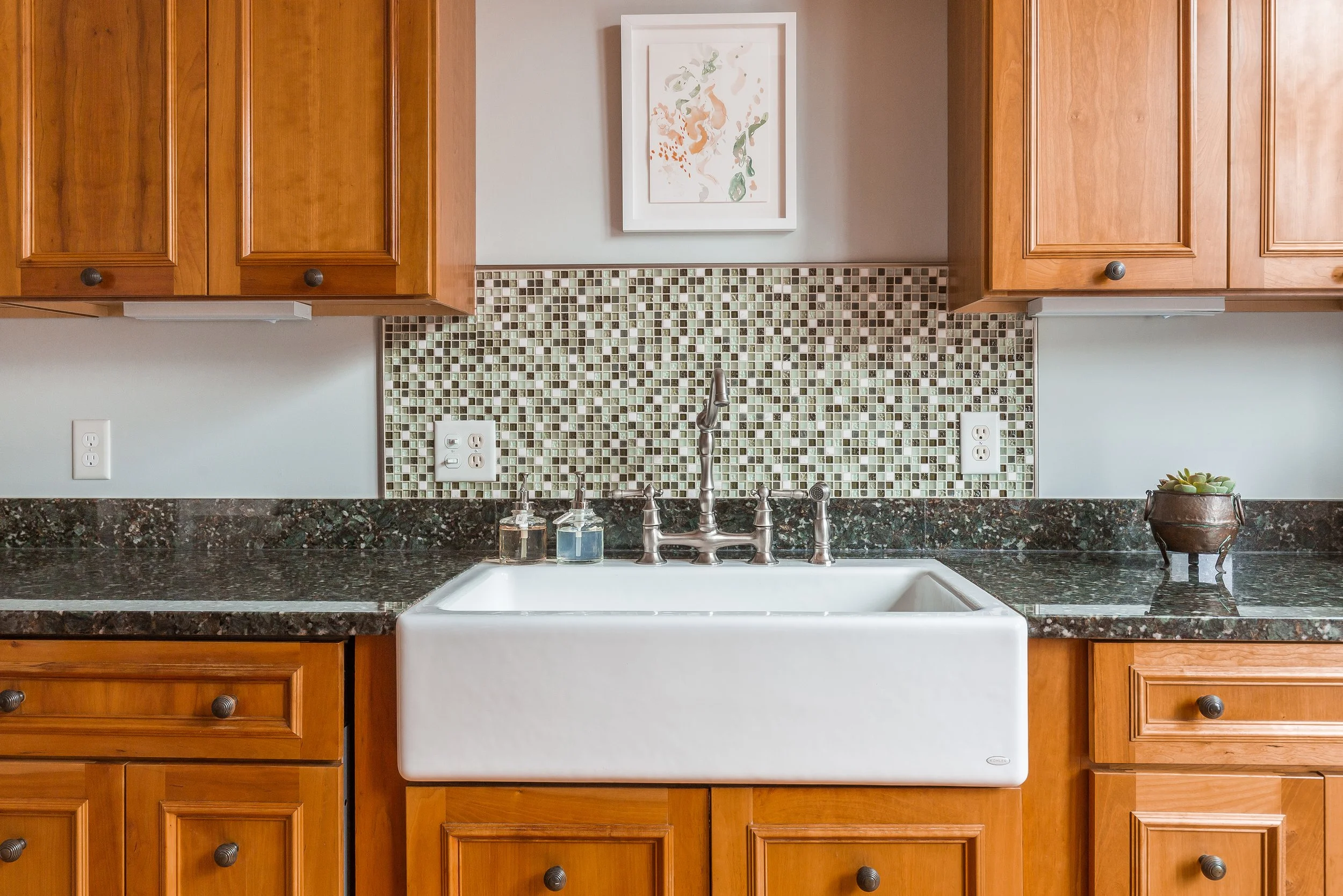 An updated and sun-filled kitchen features granite counters, cherry cabinetry, a farm sink, glass tile backsplash, stainless steel appliances, pantry storage, and direct access to the wrap-around deck