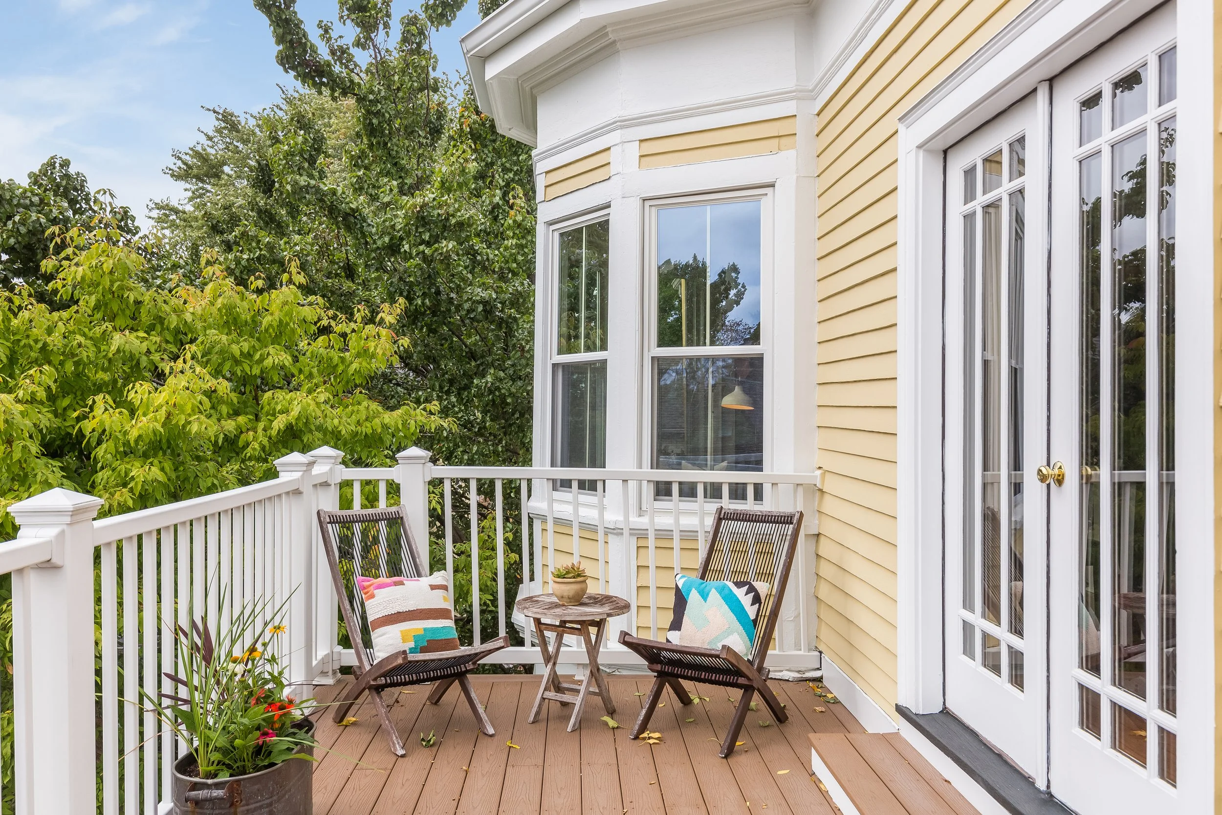 The building exterior is wood clapboard siding and wood and composite trim, repainted in 2021