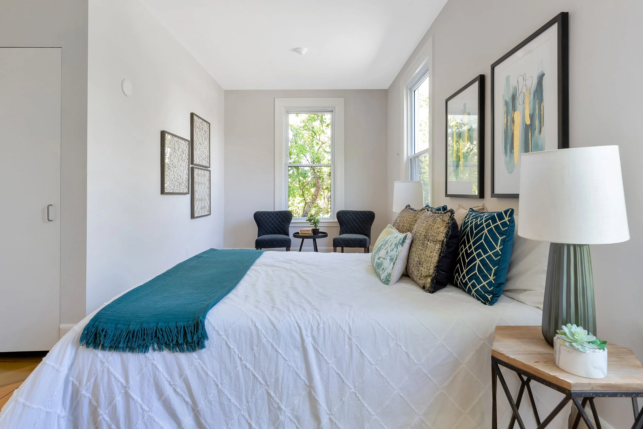 The bathroom is newly updated and has a floating vanity, a spacious medicine cabinet, white tile in the shower/tub combo, and a water-saving dual-flush toilet. The shower features dual showerheads for a spa-like experience.