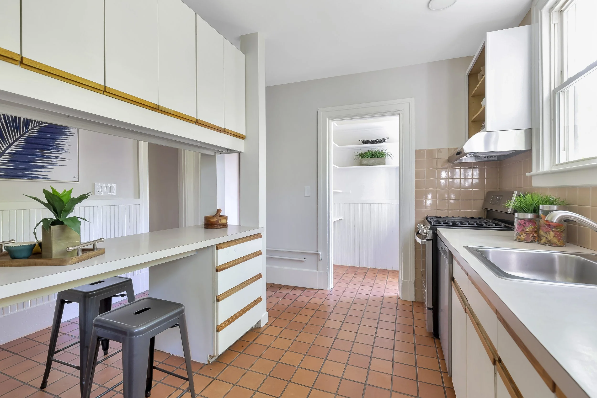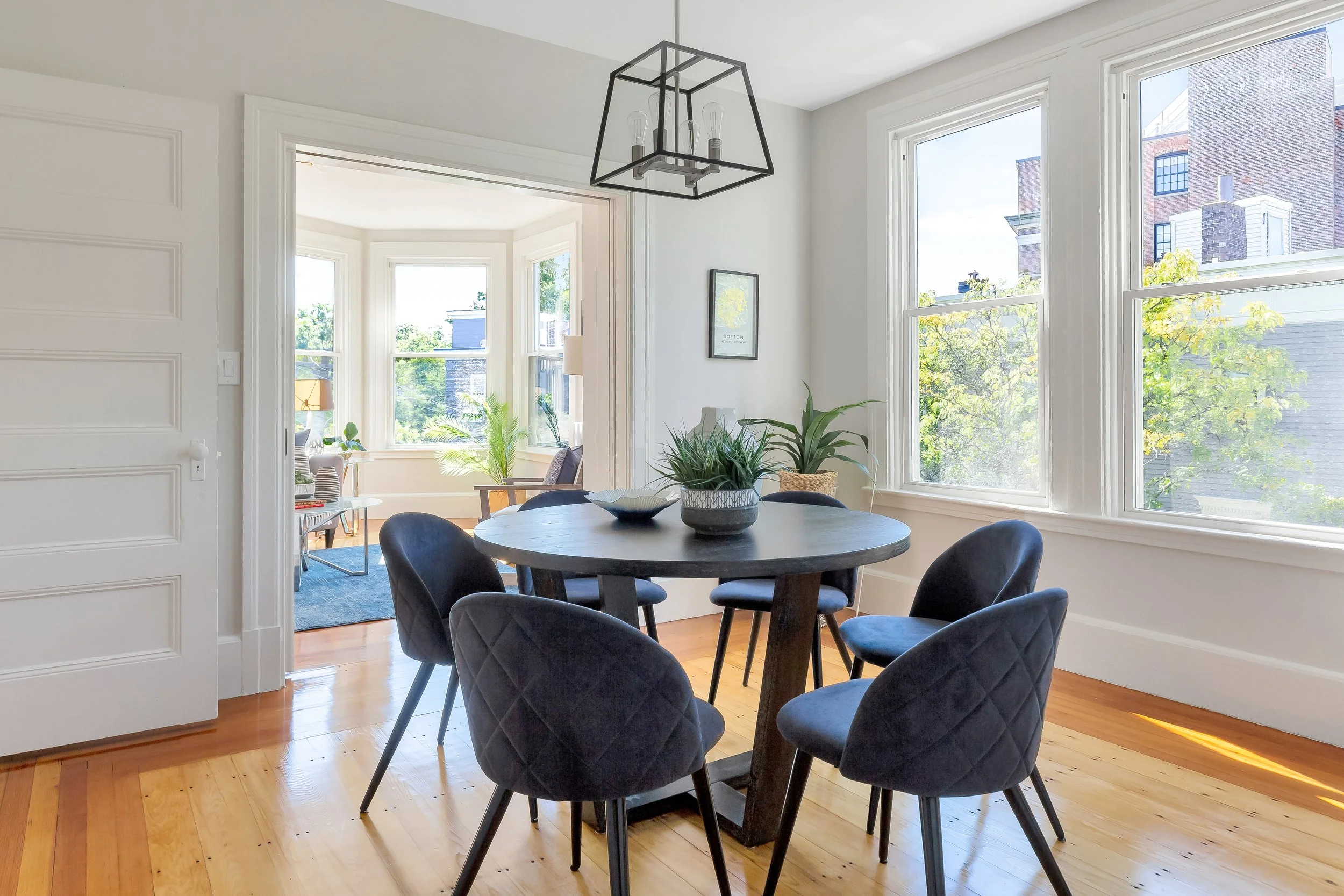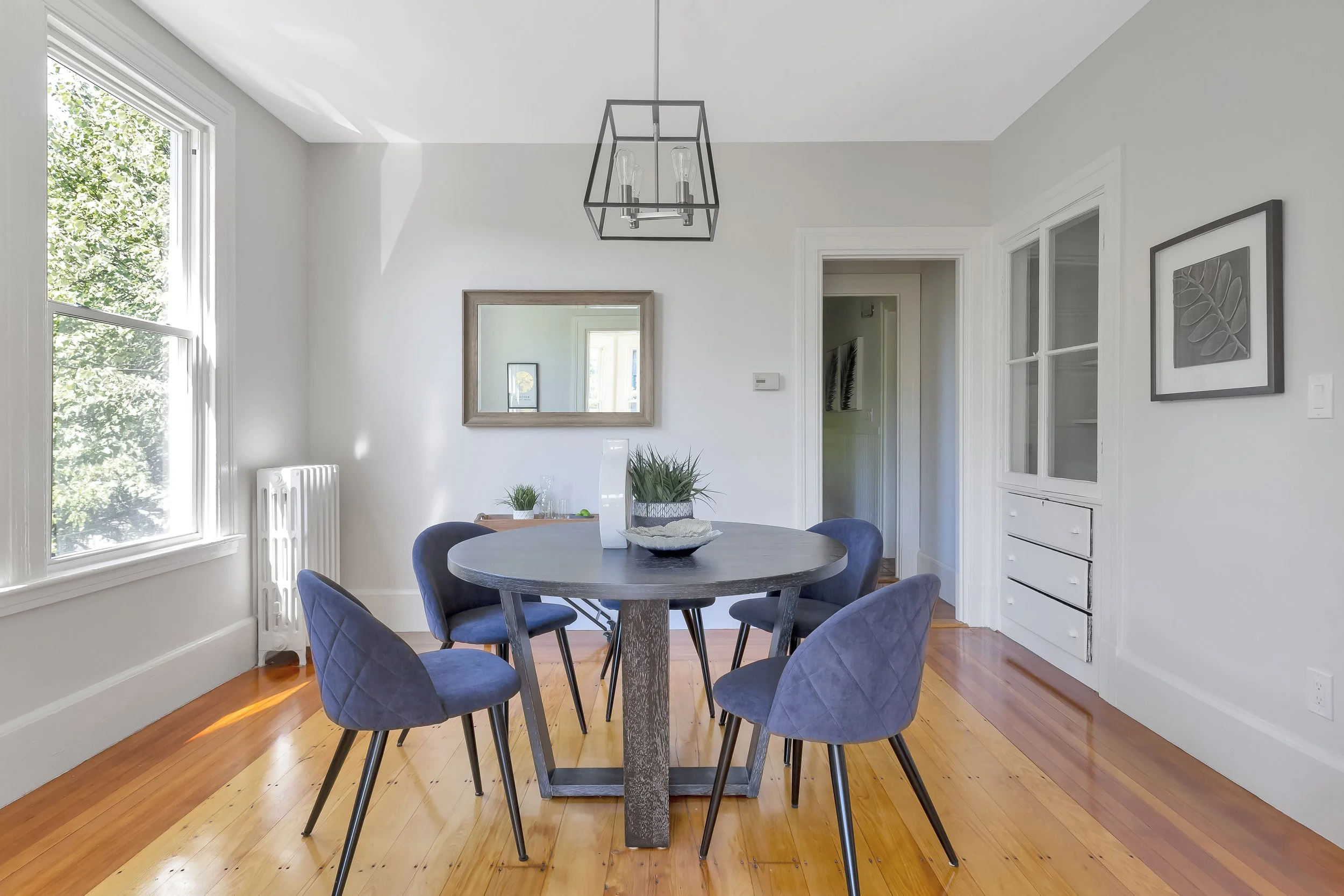 The entry foyer of the condo has a large coat closet and access to both the living room and the bedrooms. You’ll be struck by the 9 foot ceilings and how the living room and dining room are open to each other but separated by a pocket door. Newly installed light fixtures provide a modern feel yet the original china cabinets accentuate the historical nature of the property.