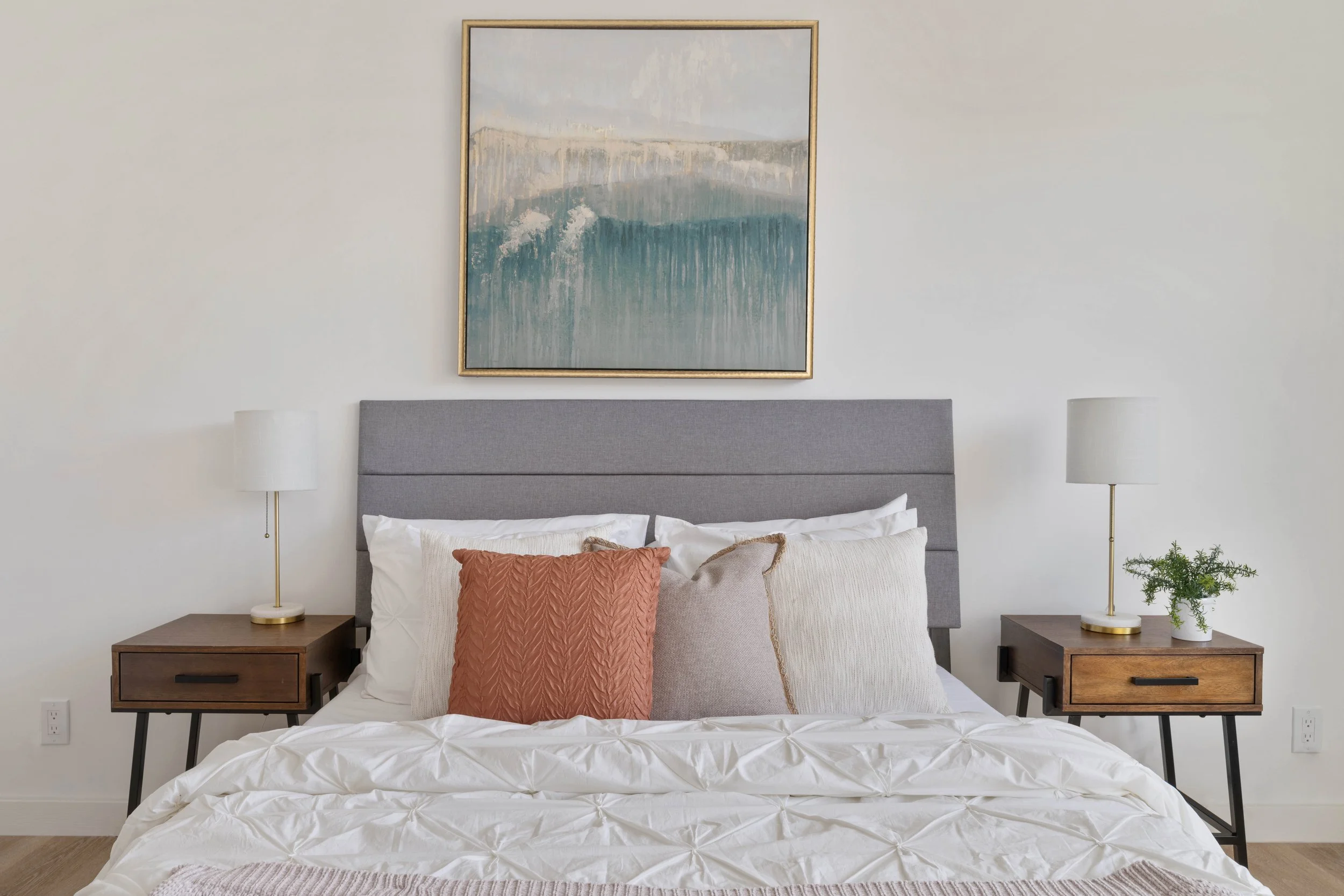 The two bedrooms have a large wall of windows, a cloth drum light, and a generously sized closet.