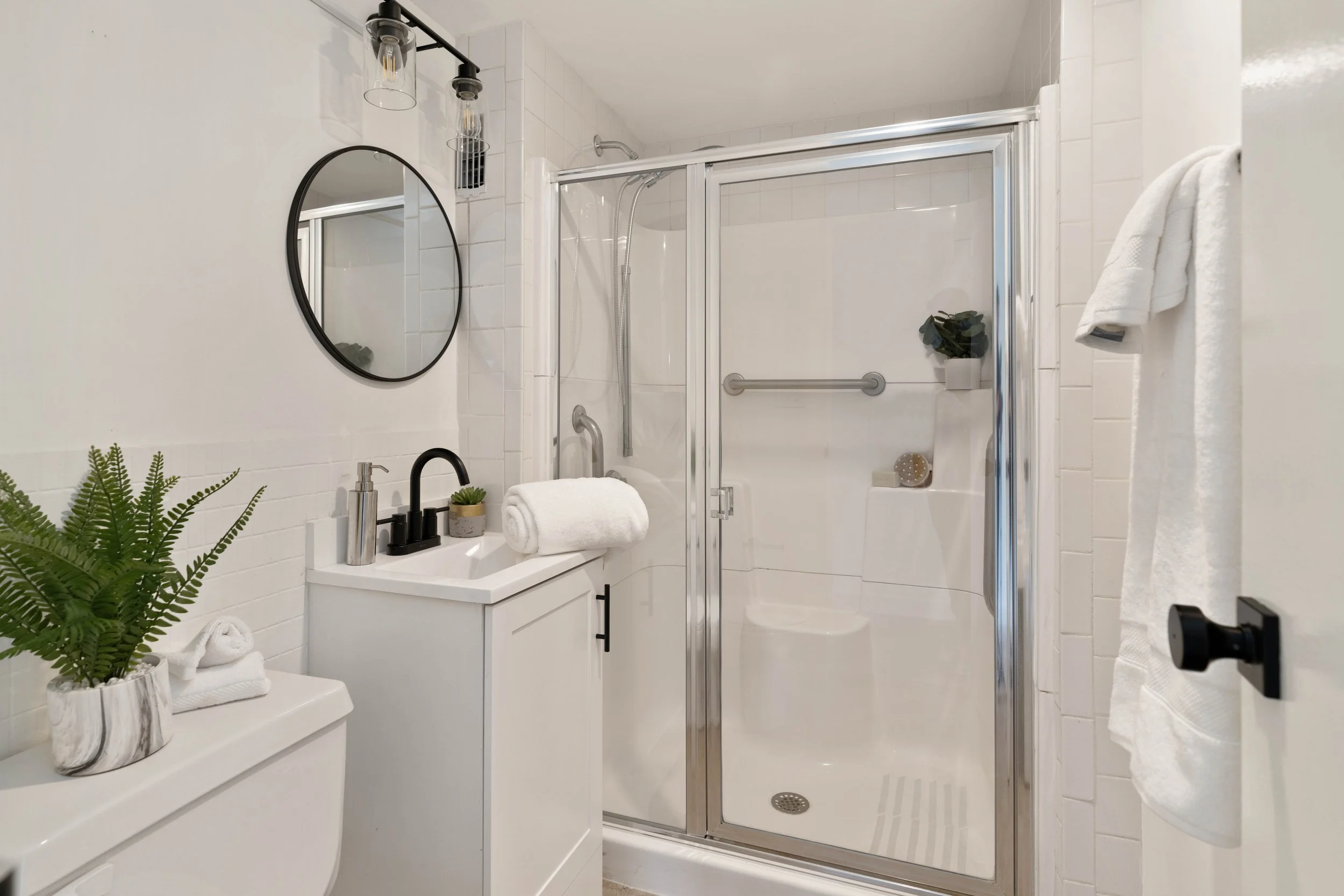 Next to the primary bedroom is the updated bathroom with ceramic tiled floors, a walk-in shower, new white bathroom vanity, and a black round framed mirror with a modern vanity light.