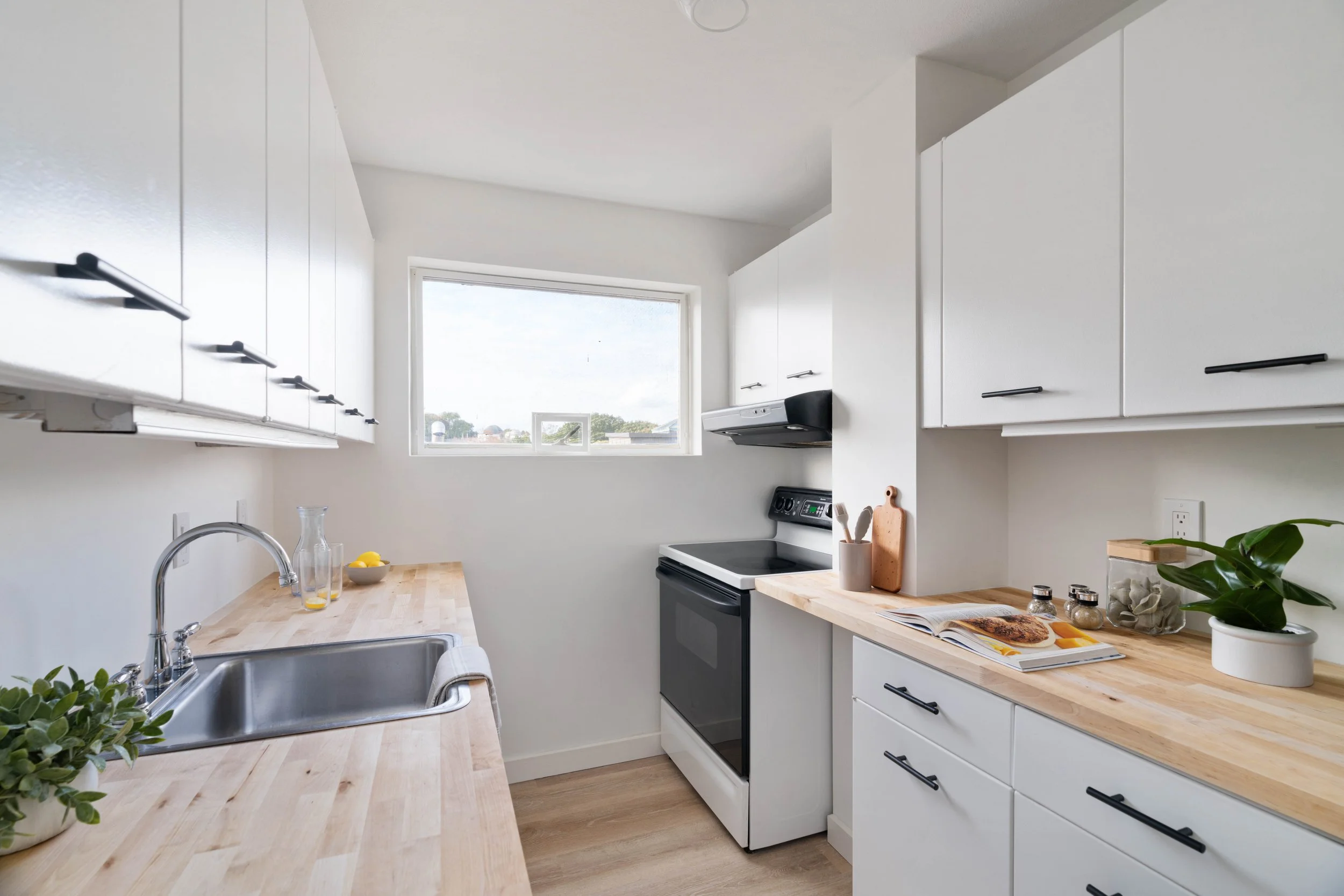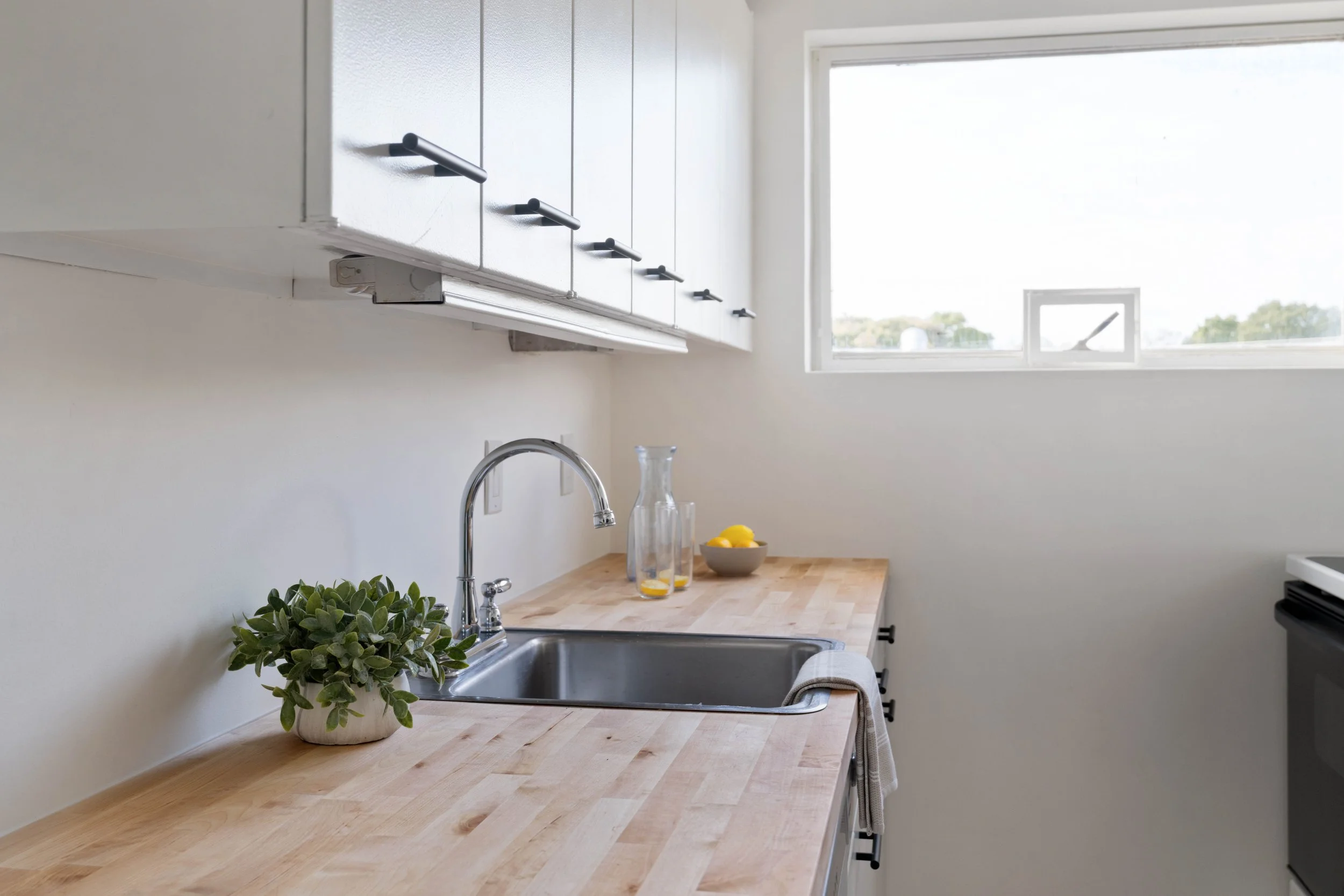 The newly updated kitchen features brand new butcher block countertops, white cabinets with modern black pulls, a GE fridge, a Whirlpool dishwasher, and a GE electric stove with an exterior-venting Allure hood.
