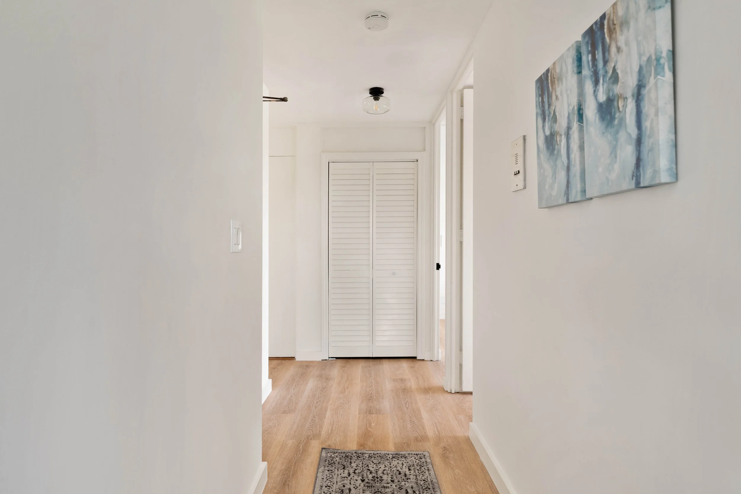 Outside of the bathroom is a coat closet and a generous linen closet.