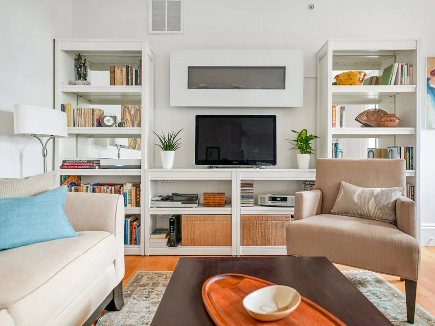 The well-proportioned living room offers ample space for lounging. It connects gracefully to the front porch, the kitchen, and the bedroom. Two large windows offer ample light, and the room is finished with a slim wall-mounted electric fireplace that adds warmth in the cool weather and blends in with the surroundings when not in use.