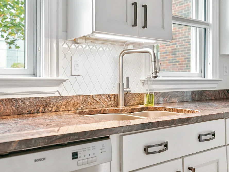 Cooks will delight in this perfectly designed kitchen, with an elegant drum light over the sit up counter, and ample windows overlooking the front patio. It features dark granite counters, a white ogee tile backsplash, extra tall 42” white cabinets with dark bronze hardware, and under cabinet lighting over the sink. Top of the line appliances are stainless steel and include a Blomberg refrigerator, a 5-burner Bosch gas range, a Bosch dishwasher, and a JennAir microwave. The stainless-steel sink has a sleek California Faucet and hand sprayer, and a garbage disposal. Enjoy cooking with a view to the garden outside!