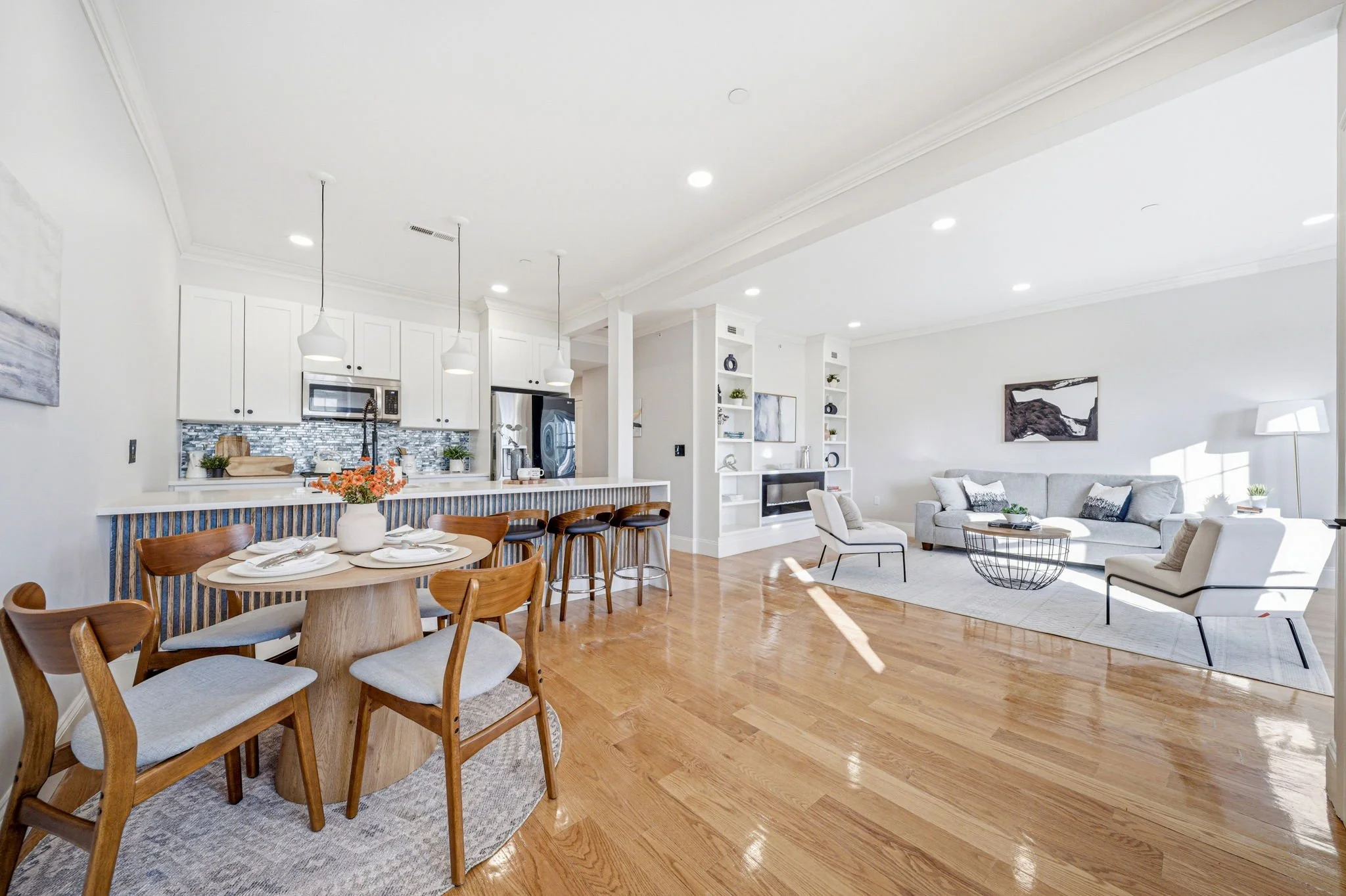 Living Room: The living room transitions effortlessly into the kitchen and dining area and also leads directly into a wide hallway that provides access to the bedrooms and bathrooms, maintaining a clear separation between the entertaining and private quarters. The room is bathed in sunlight from at least four large double-hung windows. Because the unit is a penthouse, these windows offer elevated views and significant privacy. A sleek, linear electric fireplace with a reflective black glass surround, provides a sophisticated focal point.