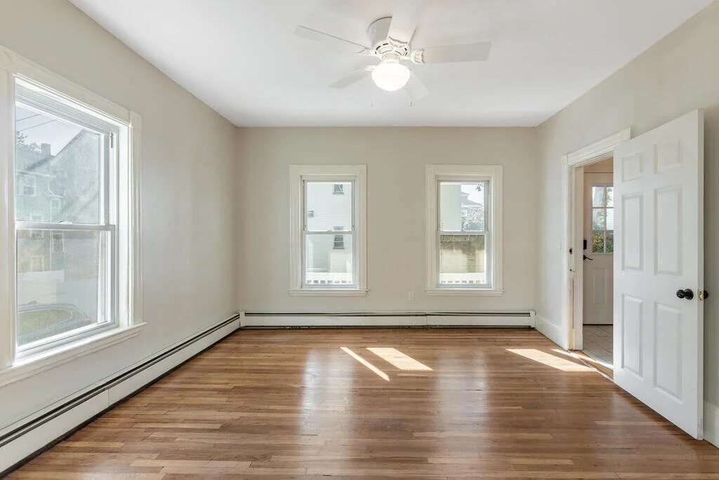 The bedroom sits to the rear of the property, is large, and has four windows for excellent natural light. There is no closet in this room.