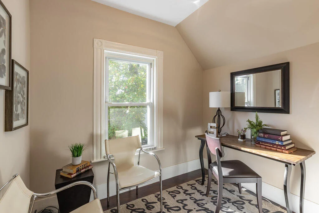 A smaller front room has a large window and is perfectly sized for use as an office, a walk-in closet, or a nursery.
