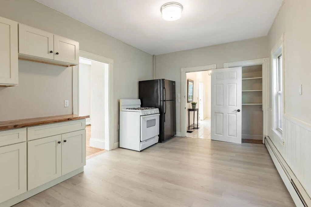 The kitchen is outfitted with a black GE refrigerator, a white GE stove, and a black GE dishwasher. There are brand new white shaker style cabinets with butcher block countertops and bronze hardware.