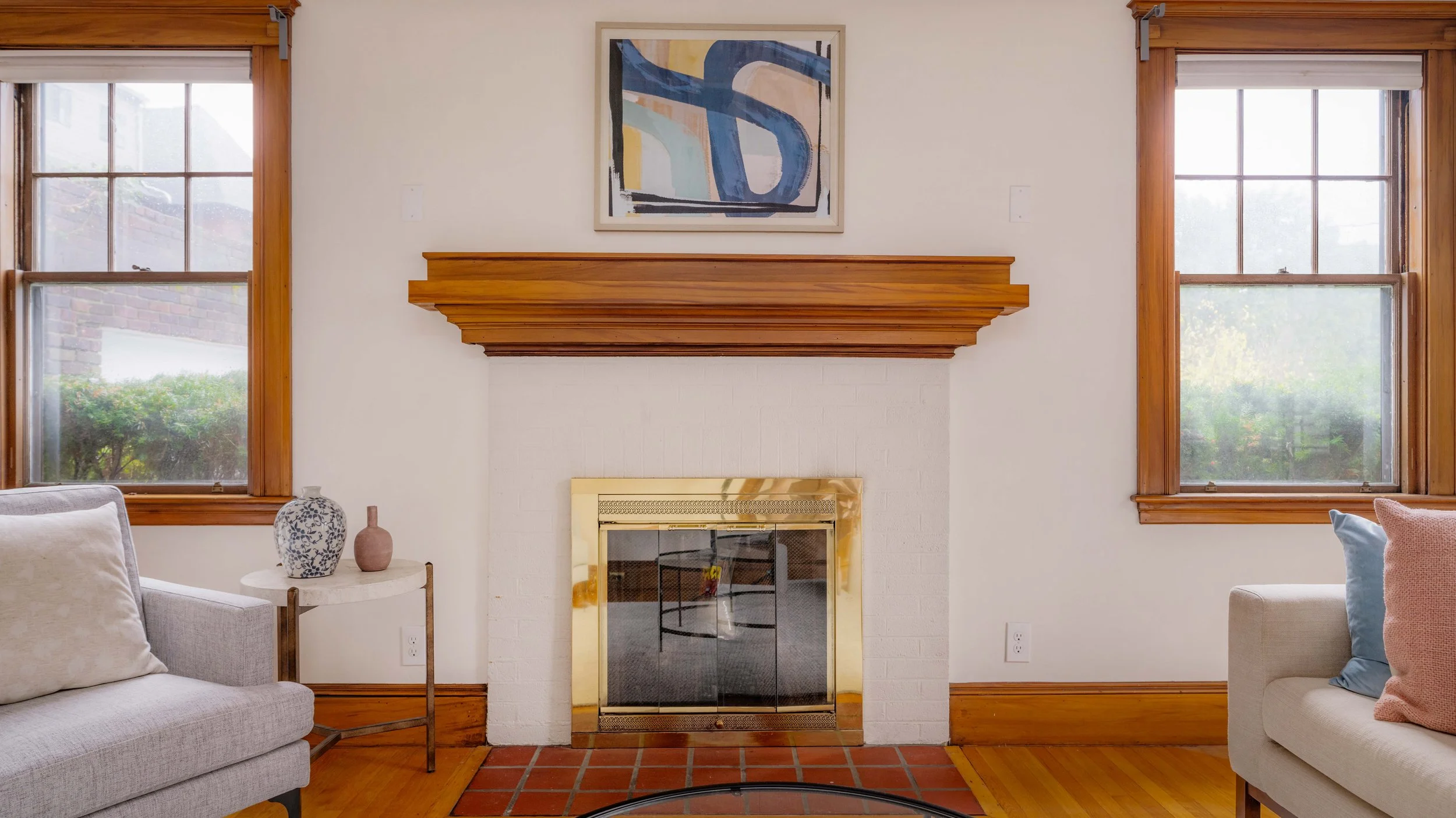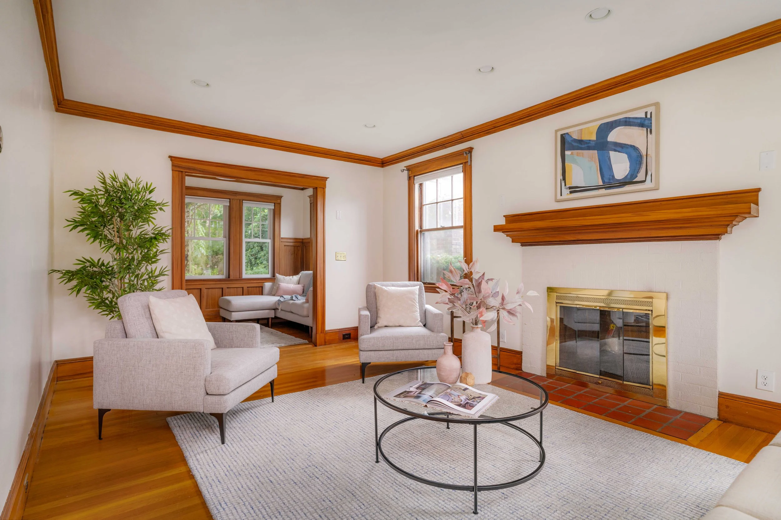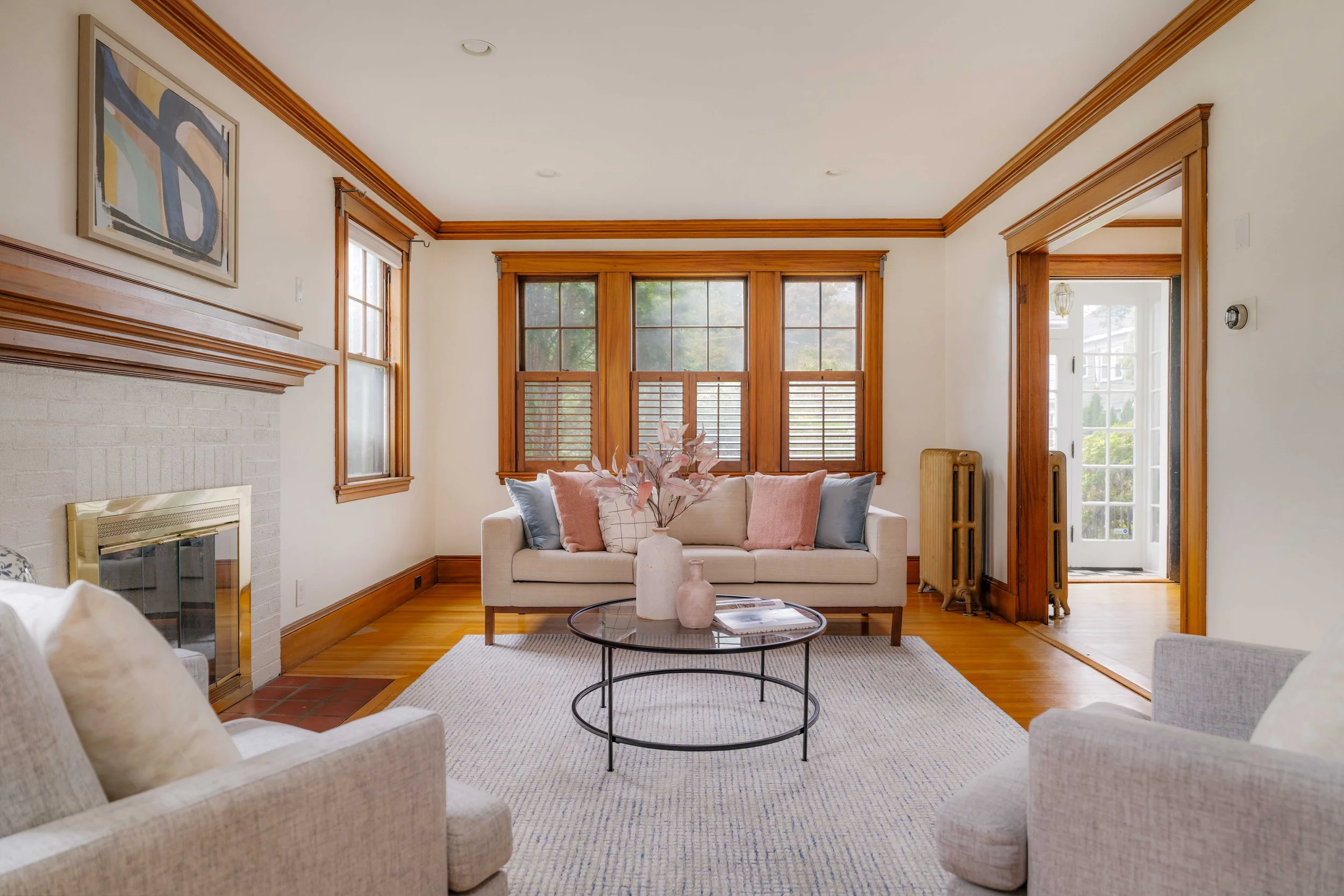 As you enter, you’re greeted by a welcoming front-to-back living room on your right, featuring multiple windows that fill the space with natural light and a cozy fireplace.