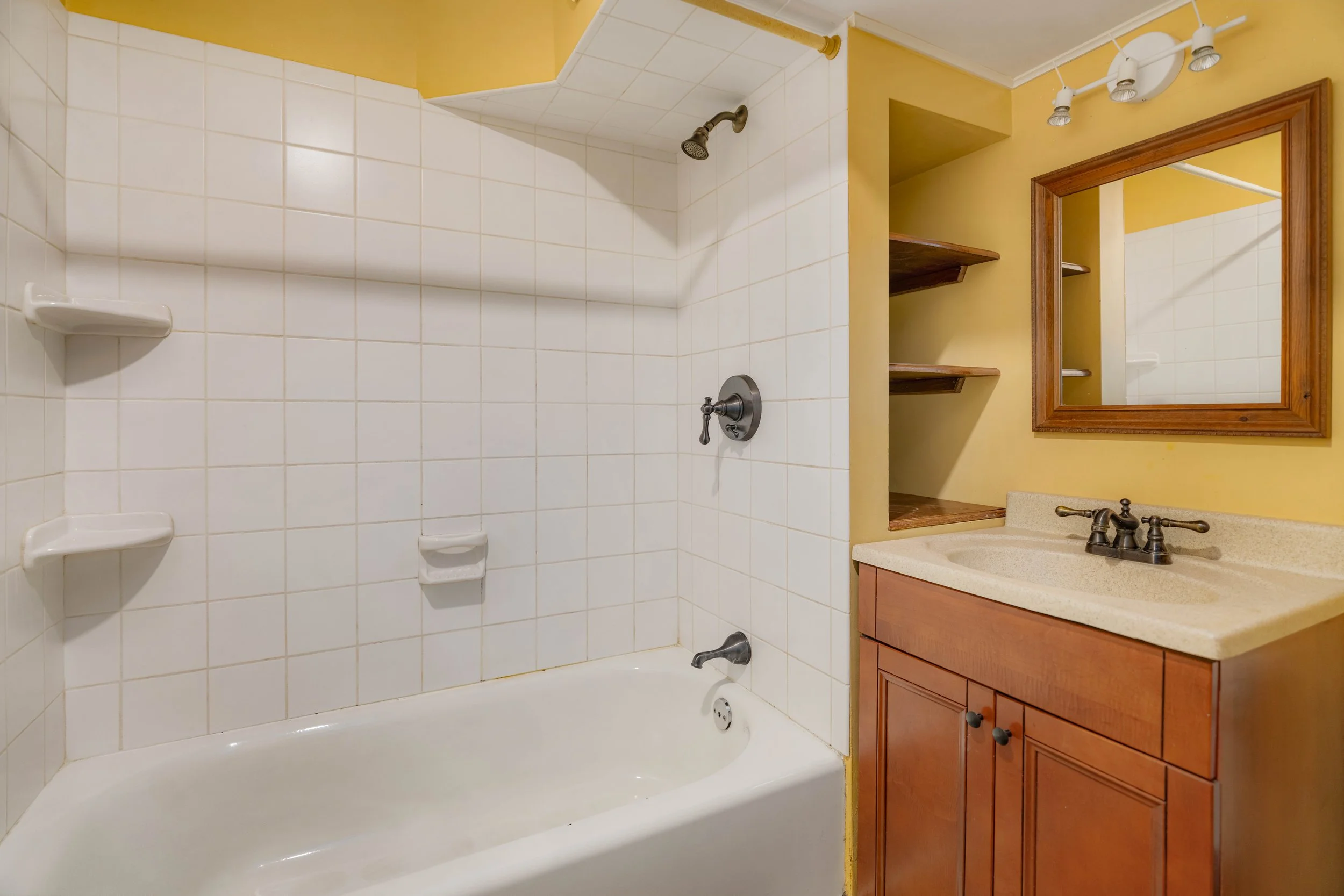 The full bathroom features a tiled shower, tub, vanity, a retro-tiled floor, and a window.