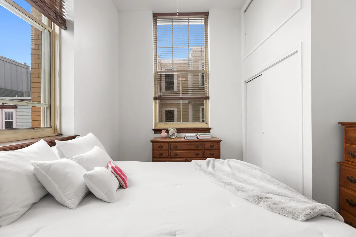 The second bedroom is located on the right side of the living room with ample closet space and natural light. Perfect space for an additional bedroom, a study, or a home gym.