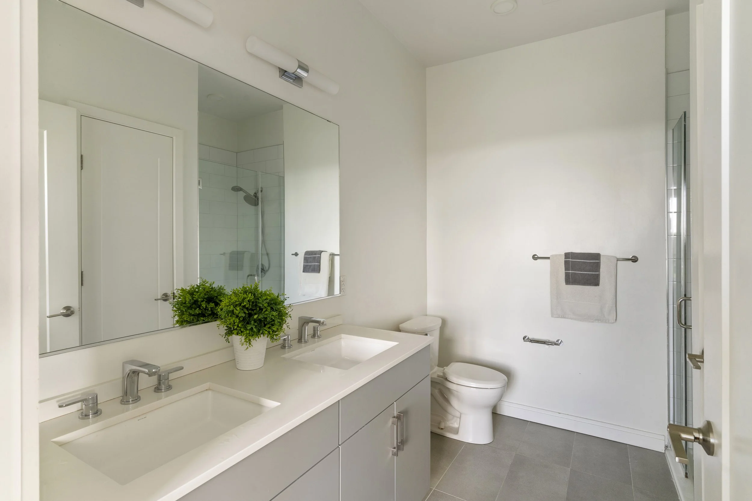 The generously sized primary suite is located off of the living room and offers a custom closet and spa-like bathroom, complete with a double-vanity, storage closet, and a glass walk-in shower.
