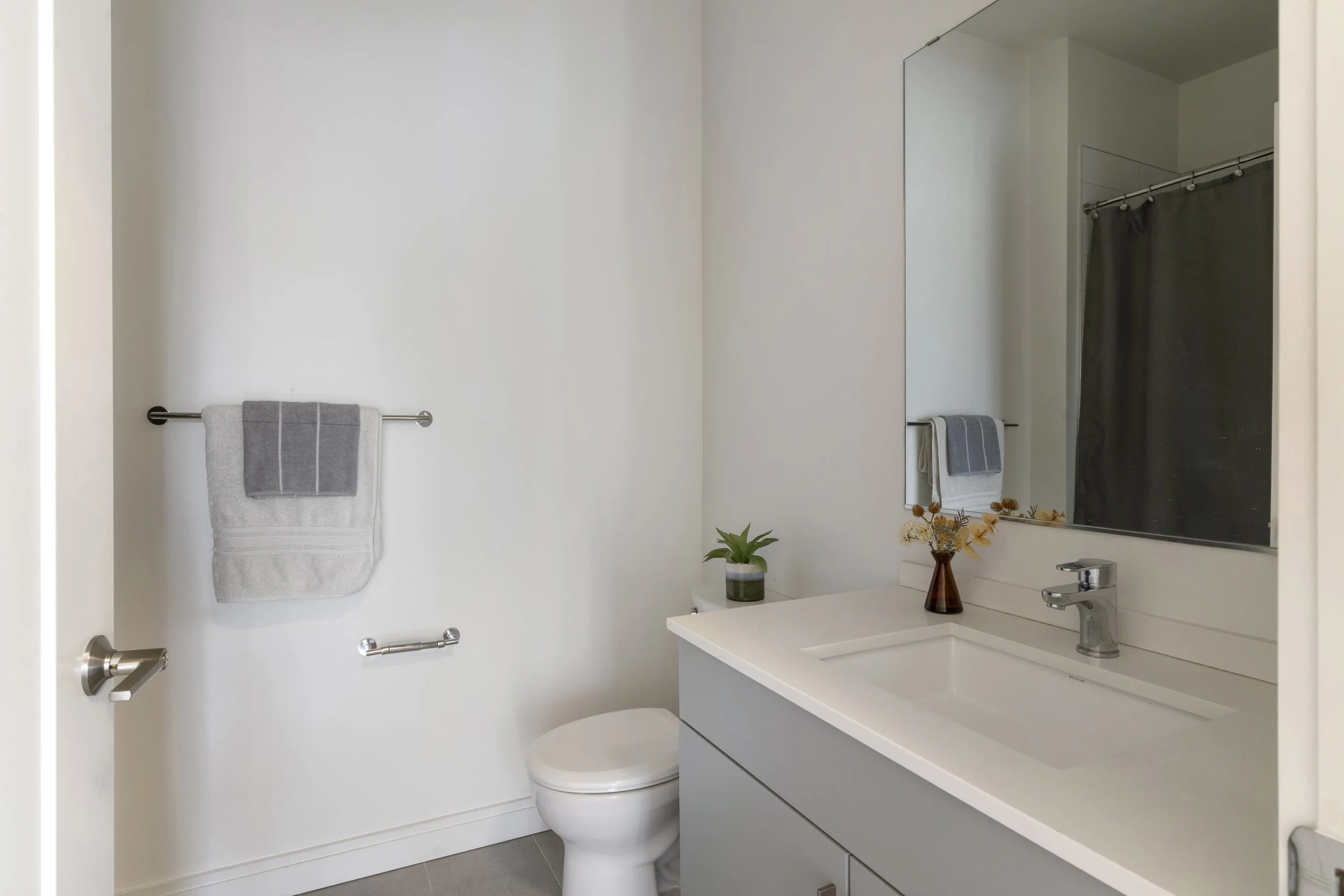 The second full bathroom is conveniently situated in the unit near the front door and features a vanity with storage and full bathtub.