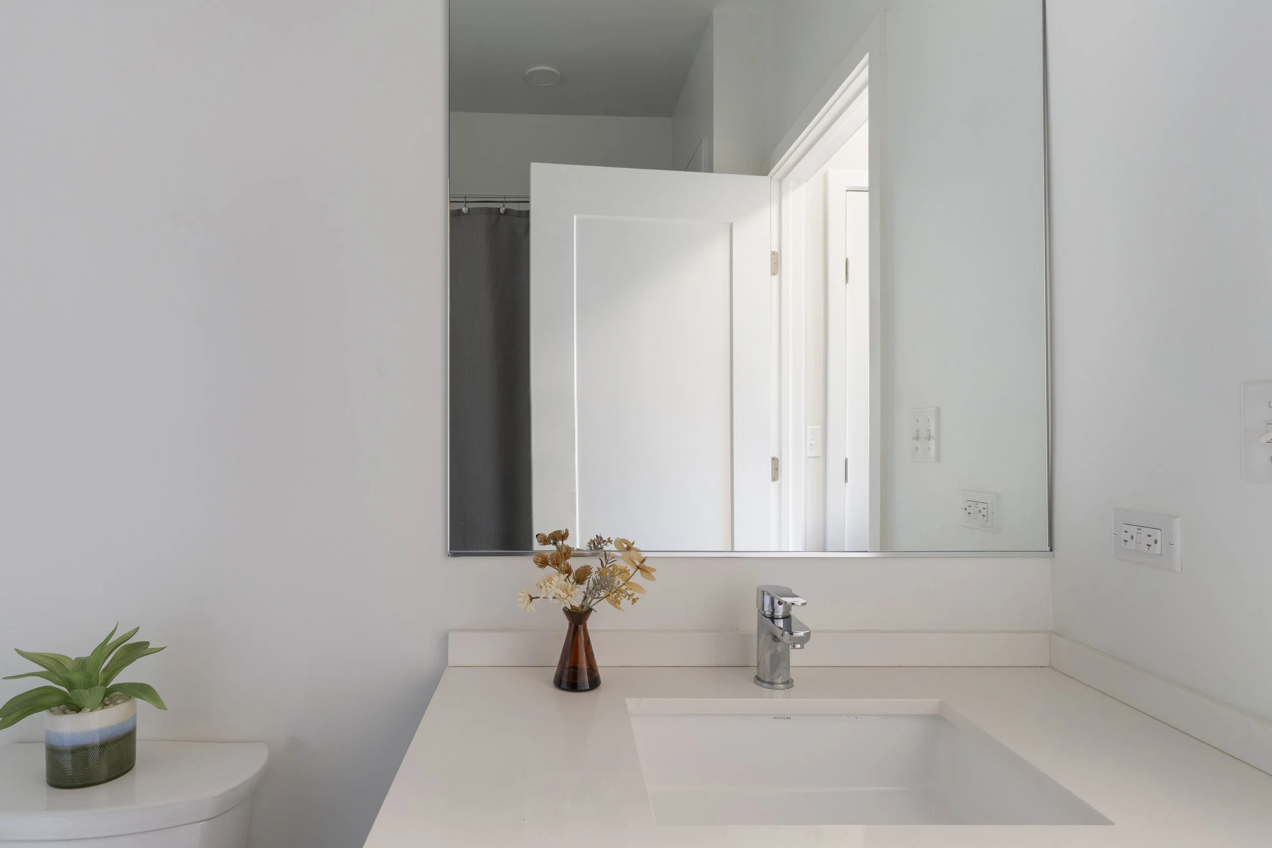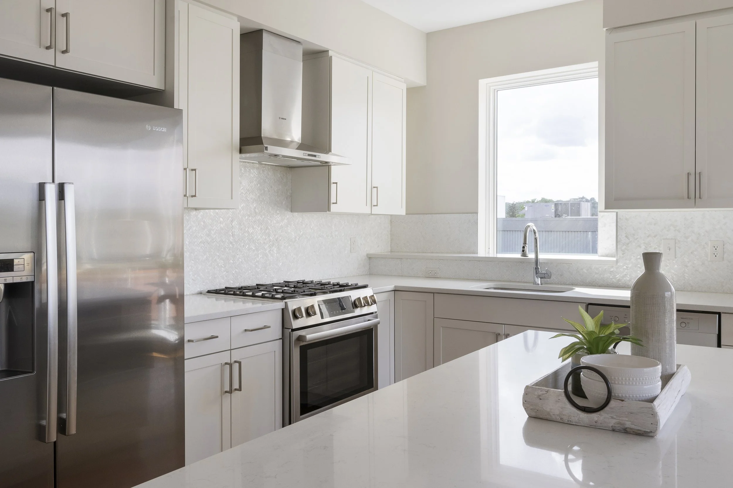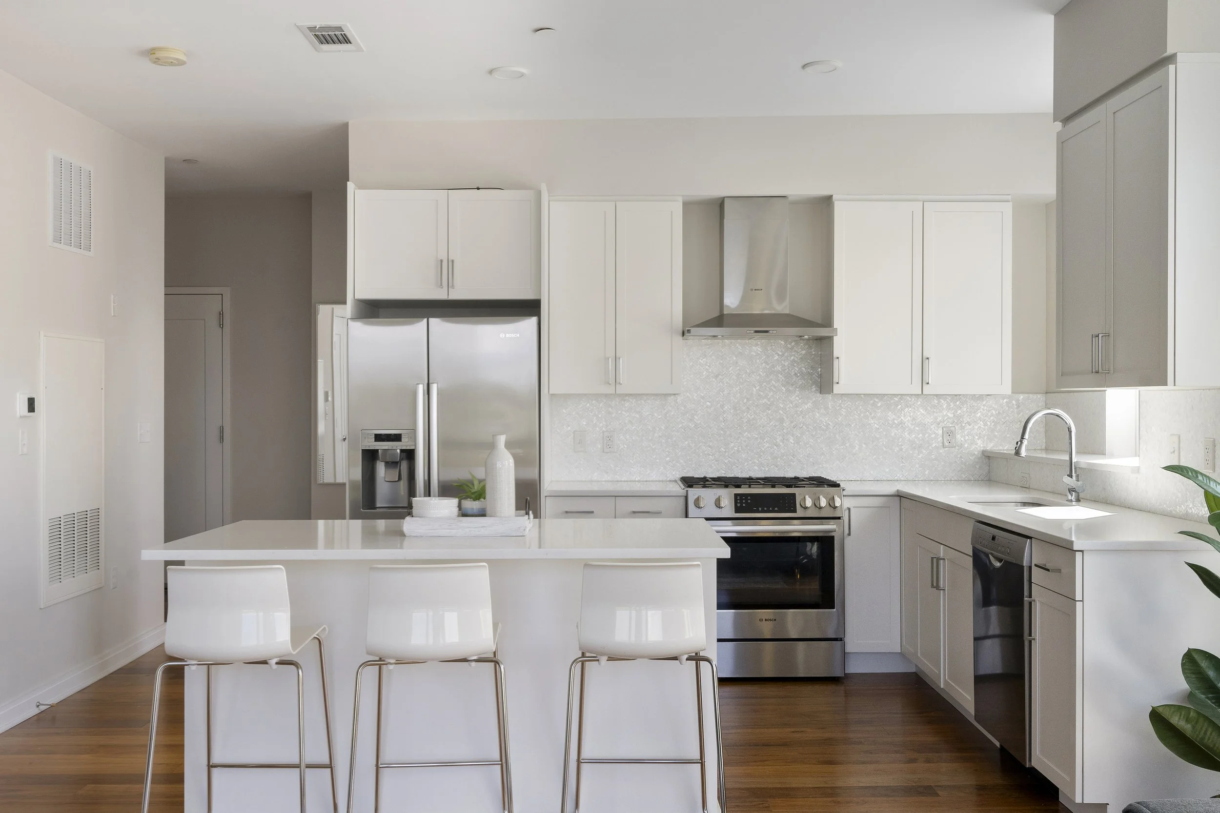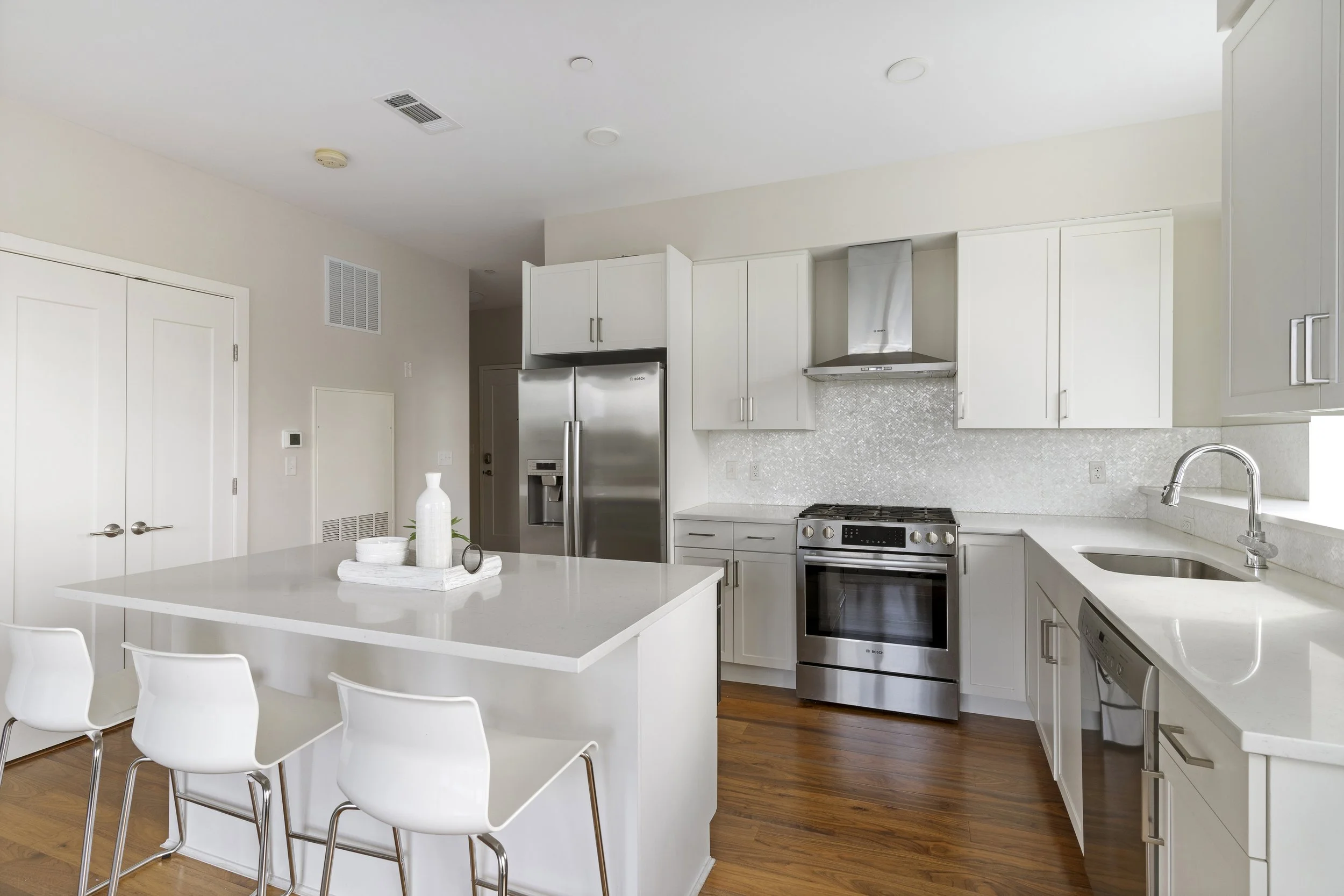 The modern kitchen is equipped with Bosch stainless steel appliances, quartz countertops, a striking mother-of-pearl backsplash, and an oversized quartz island with seating for 3–4. The island also includes a built-in U-Line wine fridge, ample cabinetry, and a microwave. Unique to this floorplan, an over-sink kitchen window brings even more natural light - and sunset colors - to this upgraded penthouse unit.