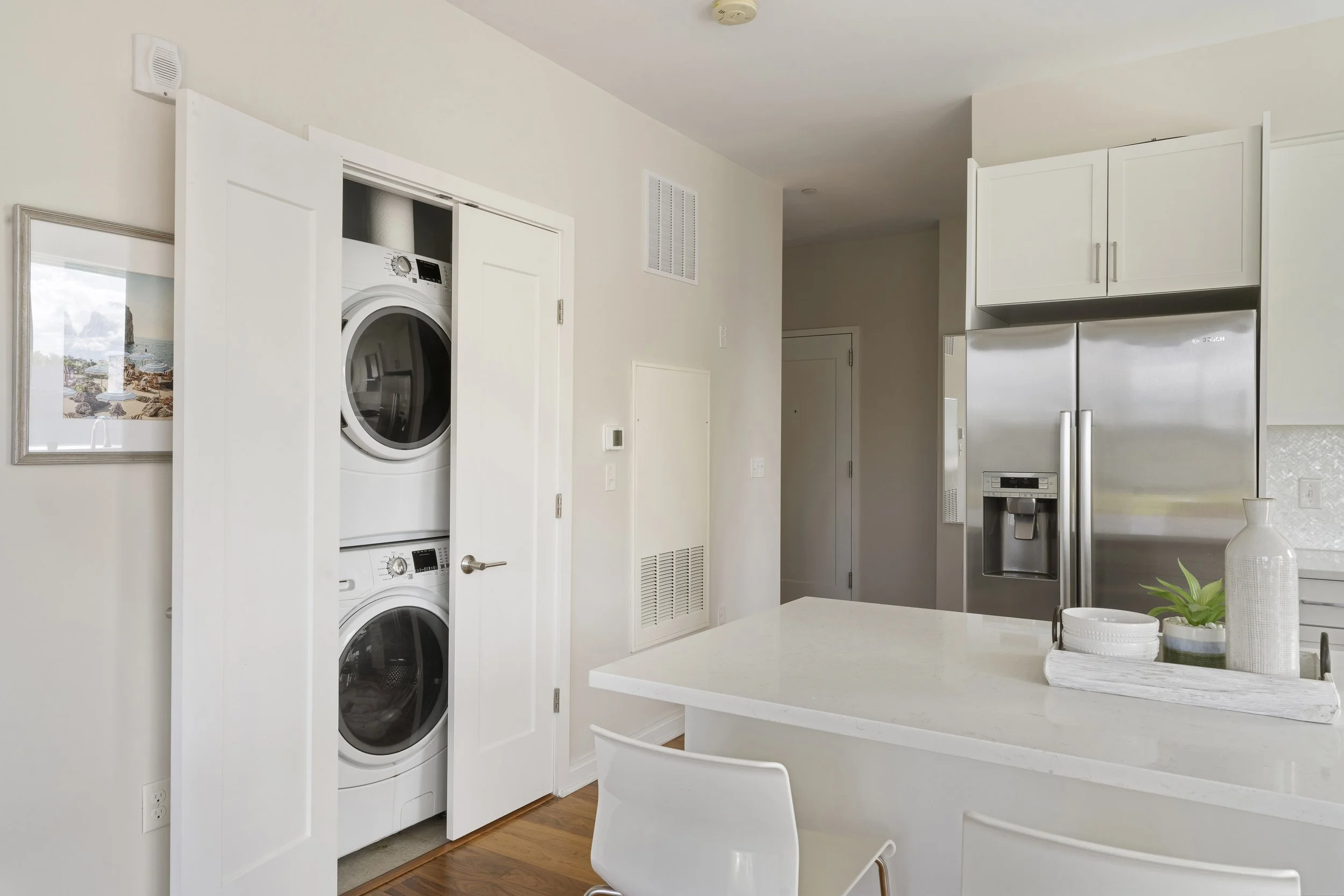 A stacked washer and dryer is tucked inside a closet right off of the kitchen/living areas, providing functionality and convenience while also making any laundry day a breeze.