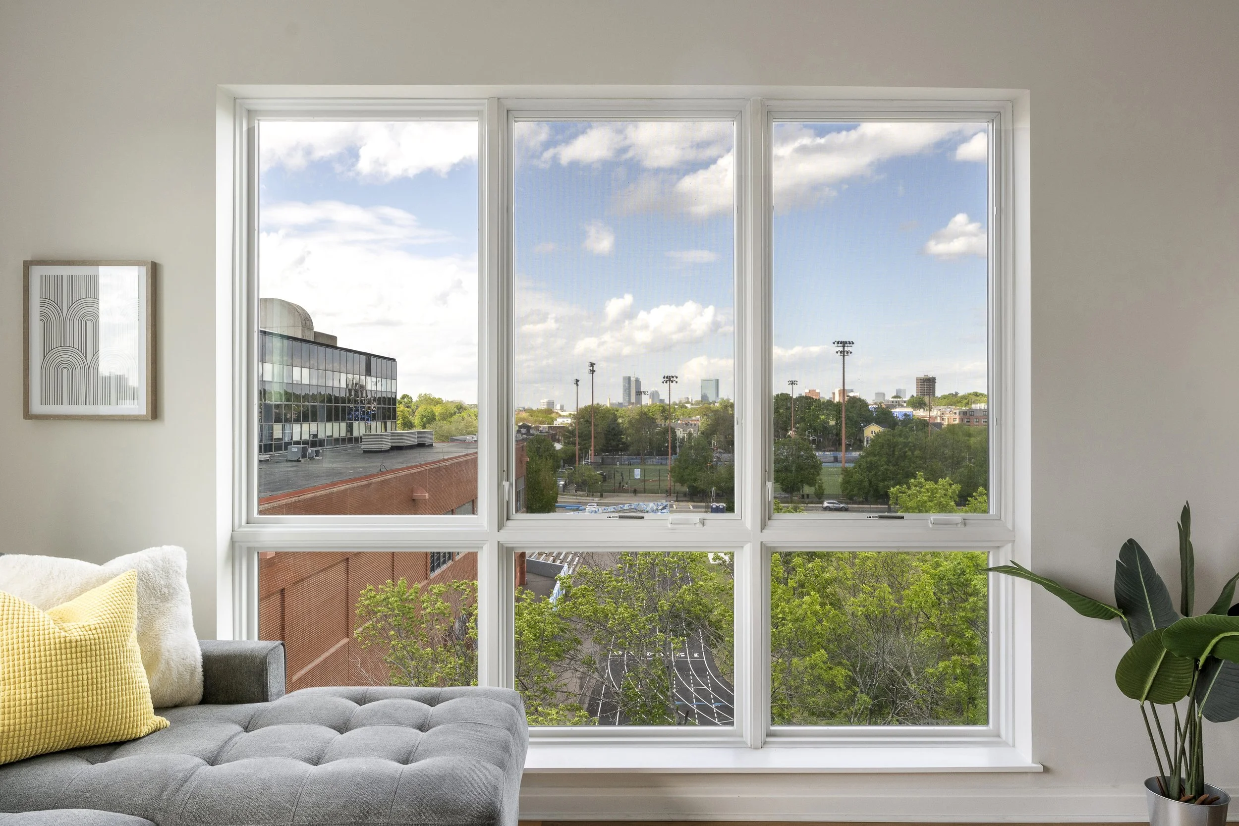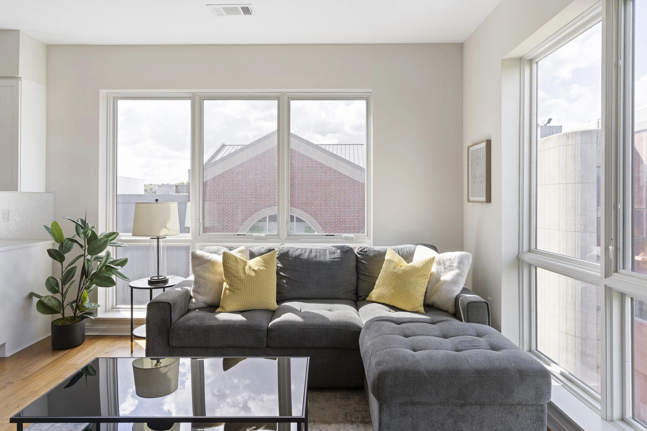 The living room boasts dramatic floor-to-ceiling windows on two adjacent walls that not only flood the room in natural light, but also showcase stunning, panoramic city views.