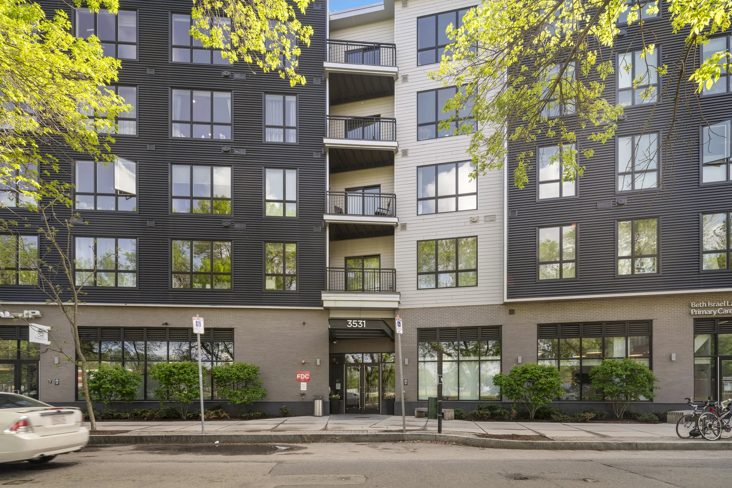 Experience modern urban living at VITA JP in this stylish, light-filled 2-bed, 2-bath corner penthouse. Perched above the street, enjoy serene tree-lined surroundings and dramatic 7-ft windows framing sweeping views of the Boston skyline. The open-concept layout features walnut floors and upgraded chef’s kitchen with Bosch appliances, quartz countertops, oversized island with wine fridge, and mother-of-pearl backsplash. Sunset pours into the west-facing kitchen window, a unique feature. The primary suite boasts a custom closet and spa-like bath with double vanity and walk-in glass shower. The second bedroom has quick access to the second full bath for added privacy. More perks include a hydro-air system, tankless water heater, upgraded e-locks, and in-unit laundry. Building amenities: full time concierge service, roof deck with grills, club room, pet spa, onsite Planet Fitness and heated garage parking with wifi. Just 0.3 miles from Forest Hills Station and the Southwest Corridor Park.