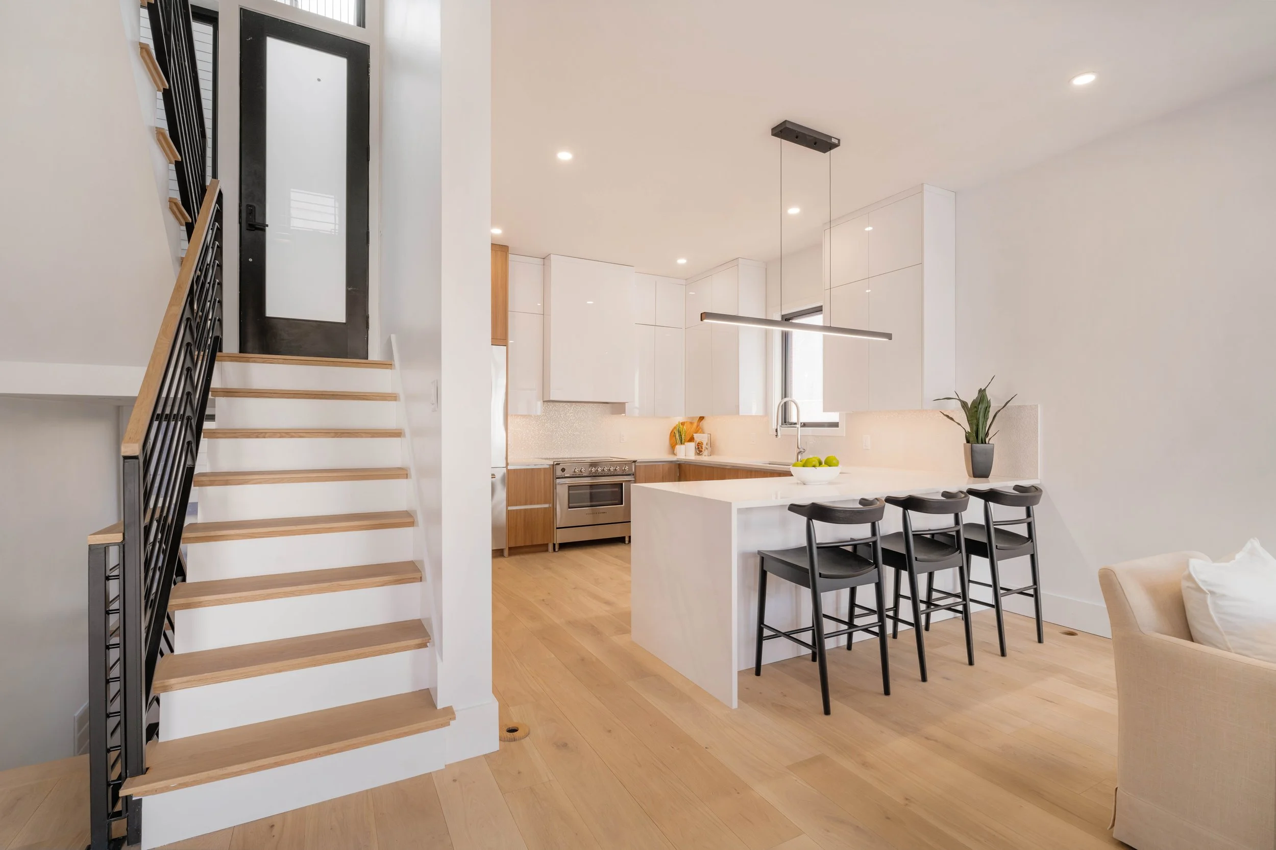 The kitchen is a chef’s dream, featuring a 36” Fisher & Paykel induction range with cooktop, a matching 36” refrigerator, a 36” insert hood, a 24” dishwasher, and a 24” microdrawer. These high-end appliances are complemented by modern cabinetry, quartz countertops, and a spacious island with seating for three, illuminated by a sleek linear pendant light.